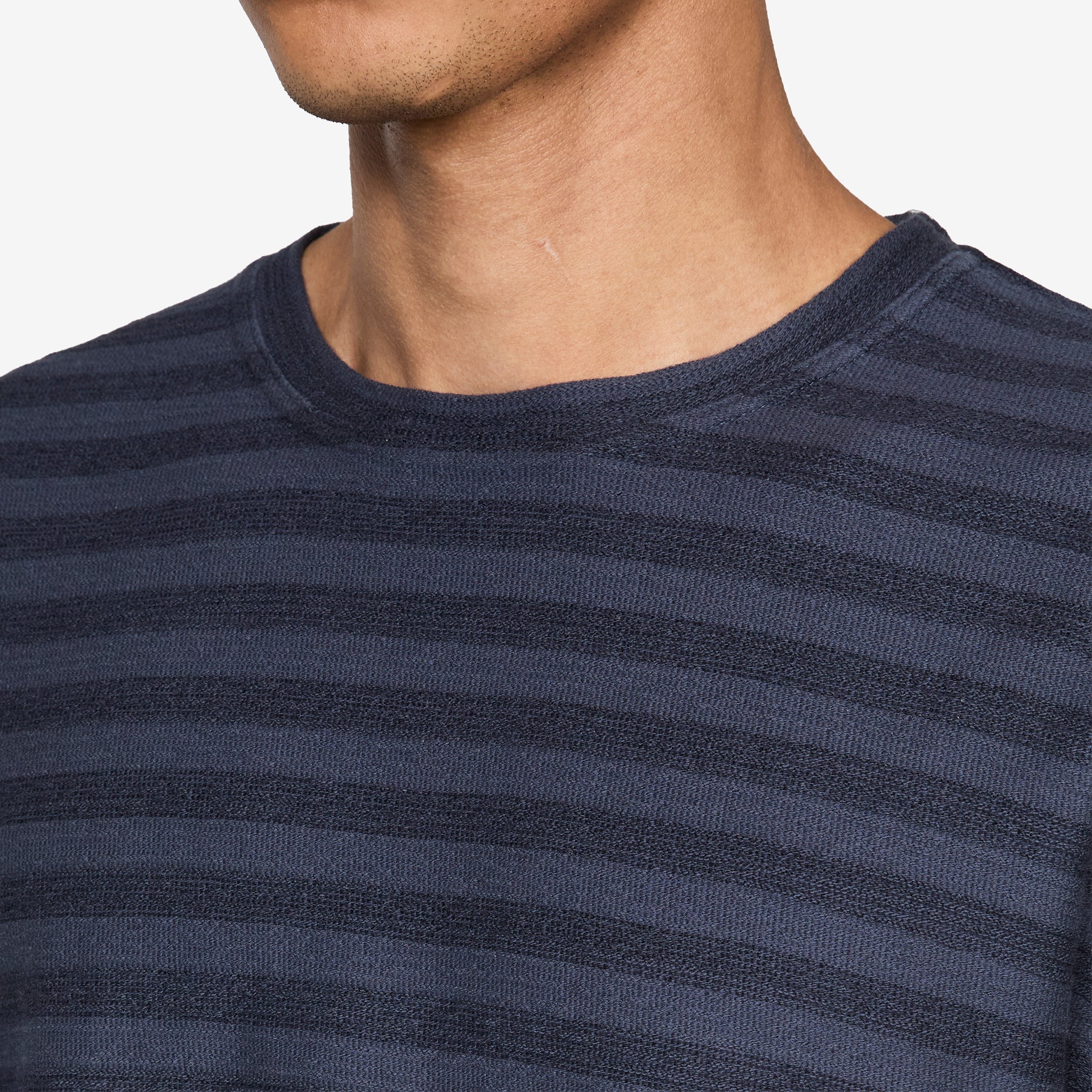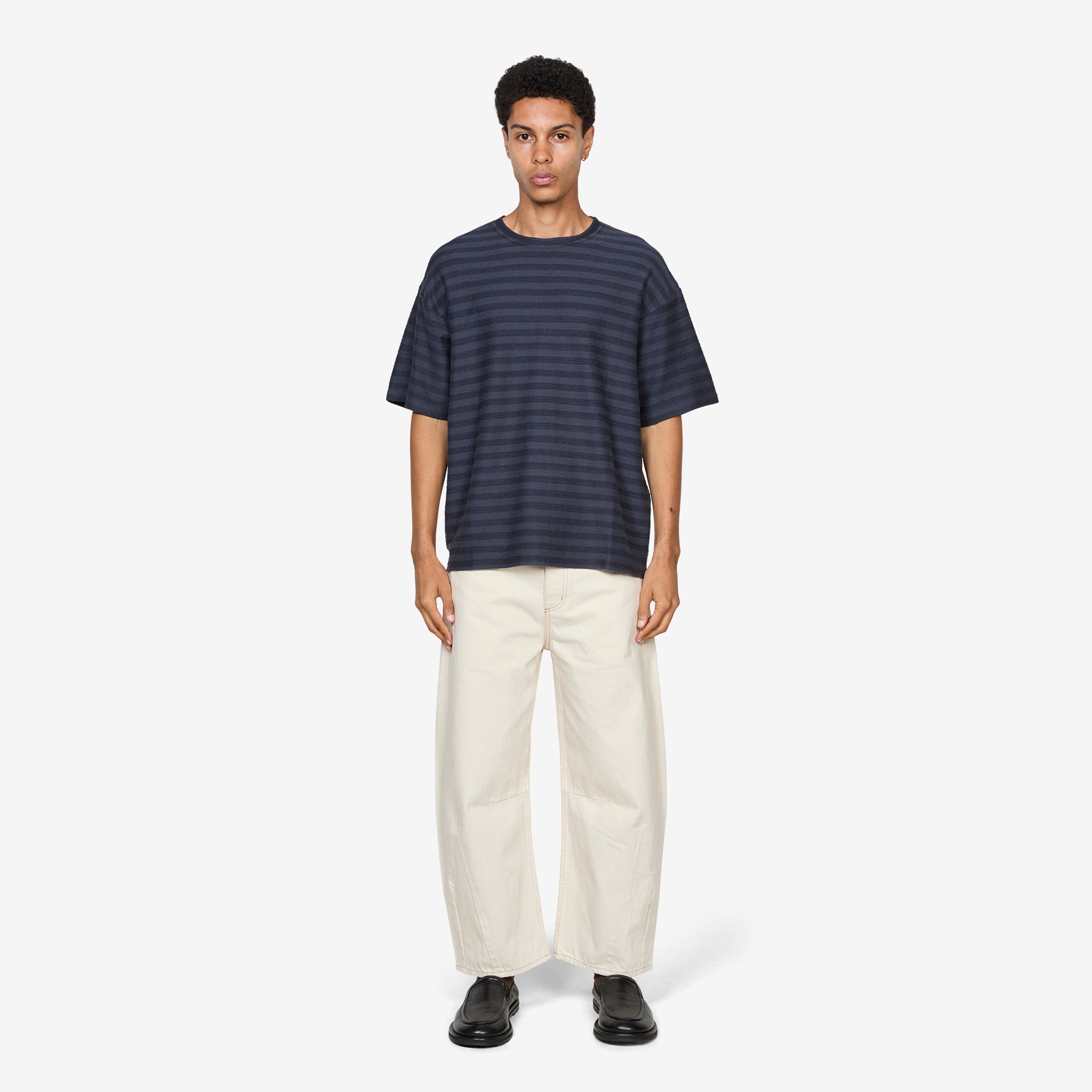 Thuy T-Shirt Structured Midnight Sky from A Kind of Guise. Boxy short-sleeve crew neck t-shirt with dropped shoulders and wide sleeves. Cut from a cotton–lyocell jersey featuring structured horizontal stripes created through varied knitting techniques. Soft, breathable, and subtly textured.