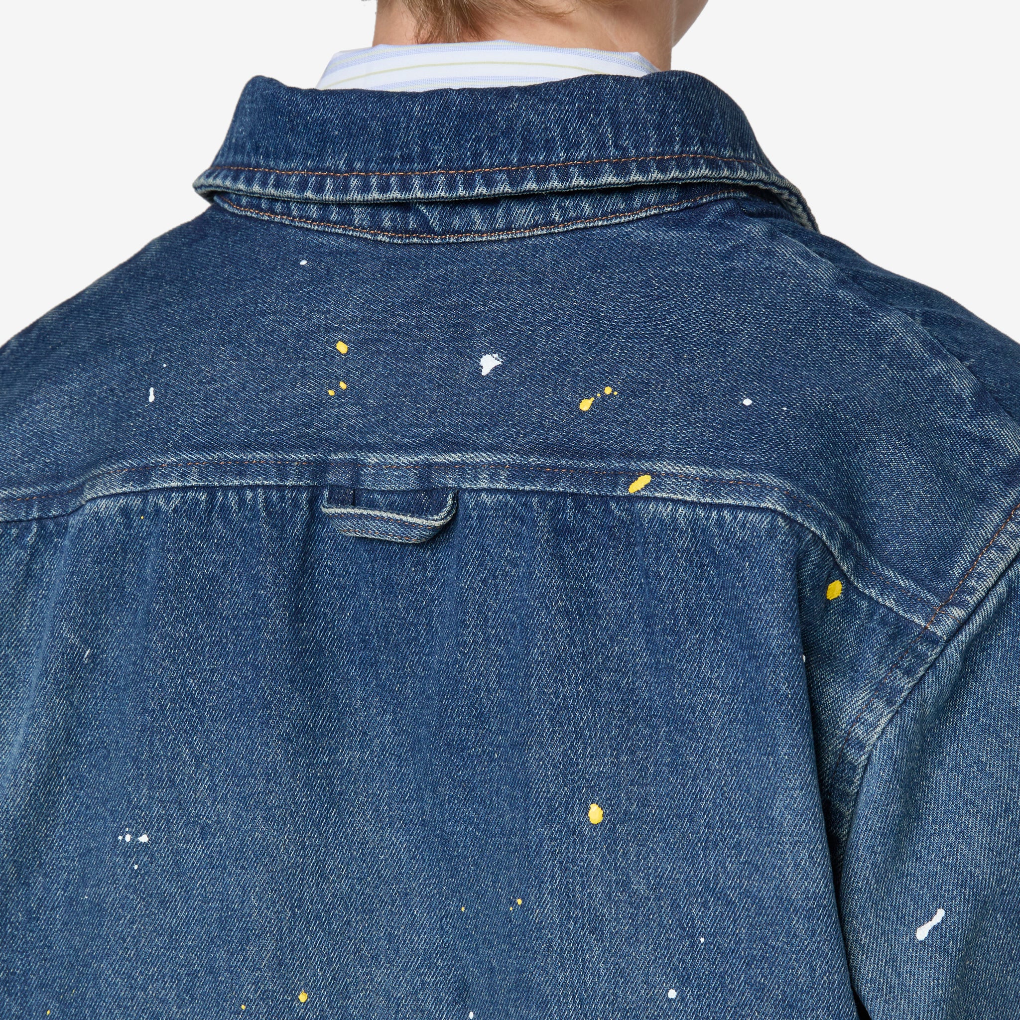 Basil Overshirt in Stonewashed Indigo from A.P.C. Relaxed fit overshirt with a classic collar, full button closure, curved hem and rear hanger loop. Crafted from a stonewashed indigo denim with paint splatters throughout. Finished with a single patch pocket at the chest.