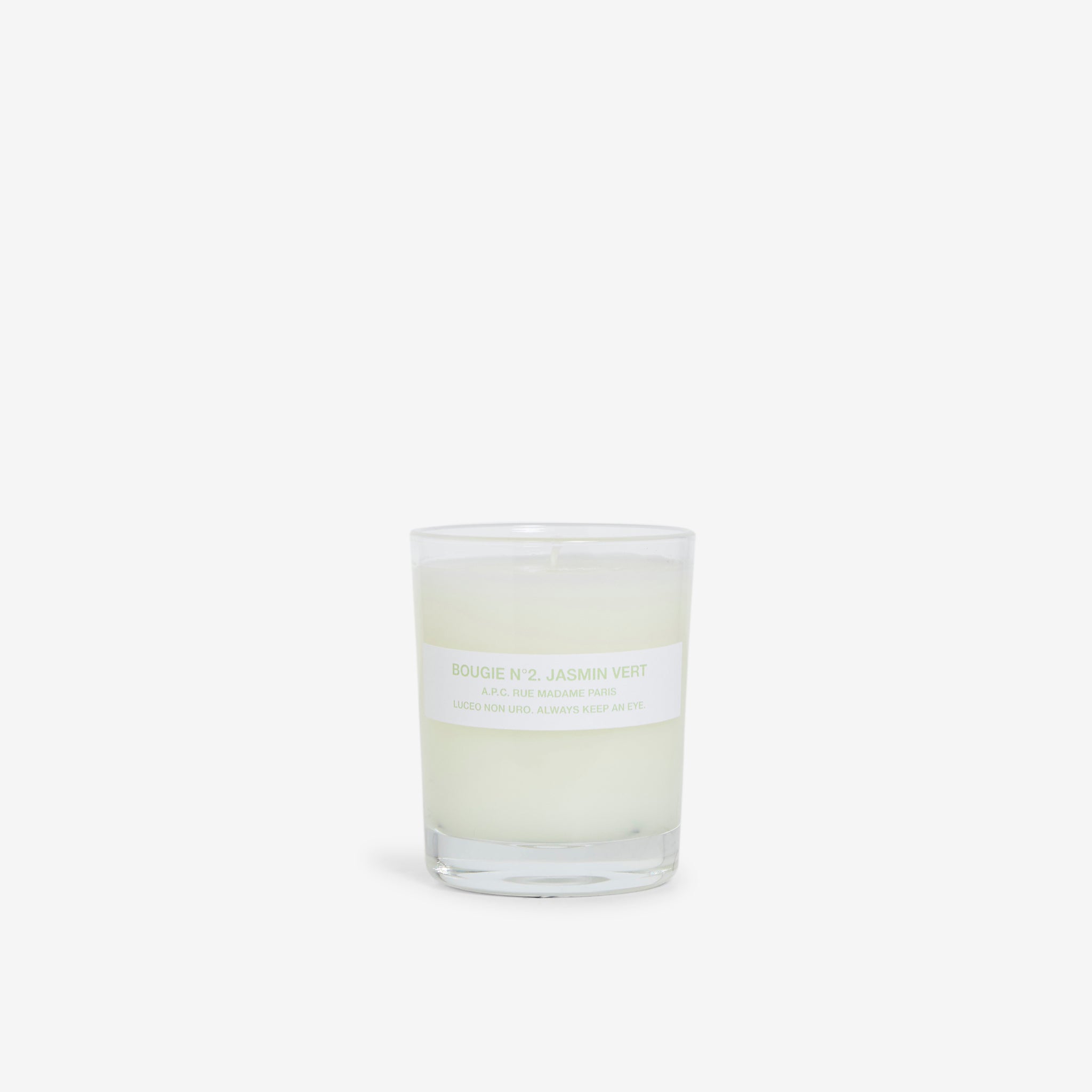 Bougie Candle N°2. Jasmine from A.P.C. Mineral wax and paraffin candle in a clear glass cylinder. Comes in a white cardboard box.
