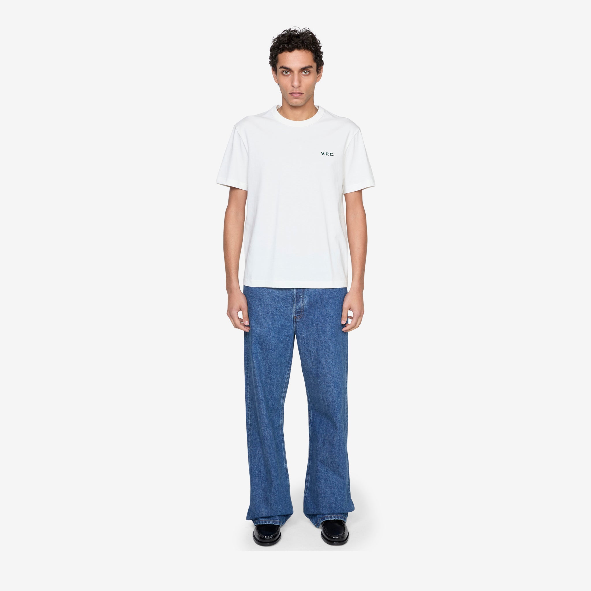 Boxy Petit VPC T-Shirt in White and Green from A.P.C. Regular fit t-shirt with a ribbed crew neckline. Crafted from soft organic cotton and finished with flocked velvet-feel branding at the chest.
