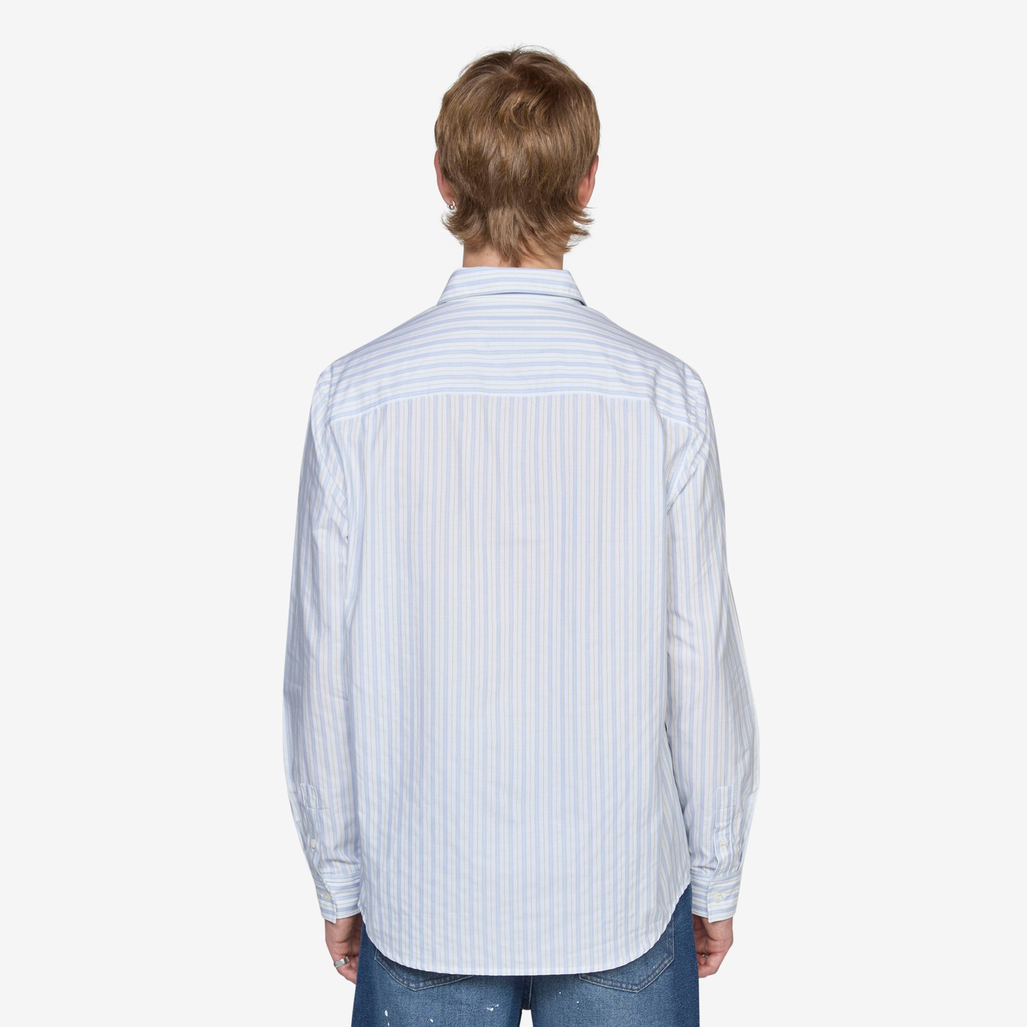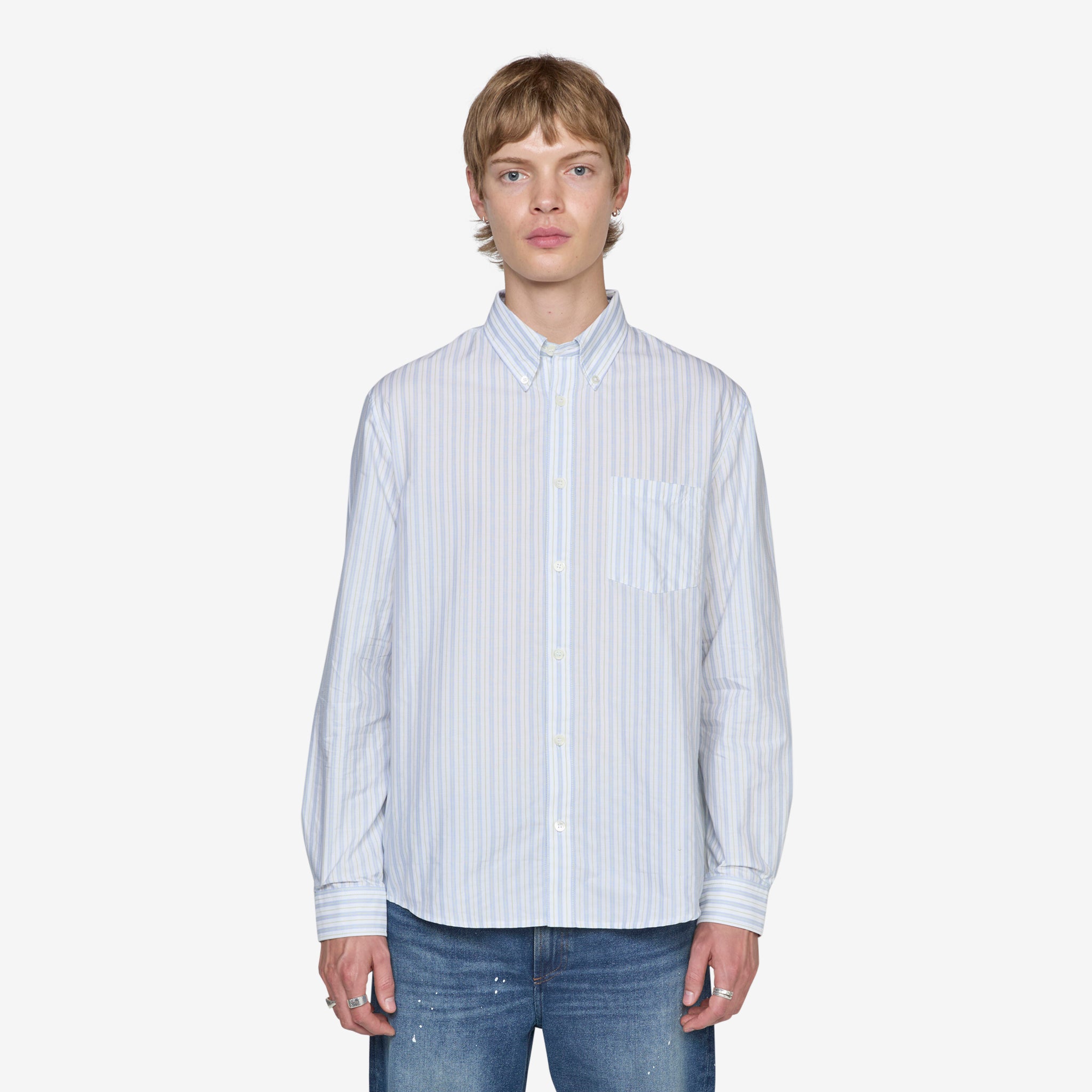 Edouard Brodé Shirt in Pale Green from A.P.C. Regular fit longsleeve shirt with a button-down collar, mother of pearl button closure and patch pocket at the chest. Crafted from a crisp lightweight cotton in a blue and pale green stripe. Finished with tonal embroidery at the chest pocket.