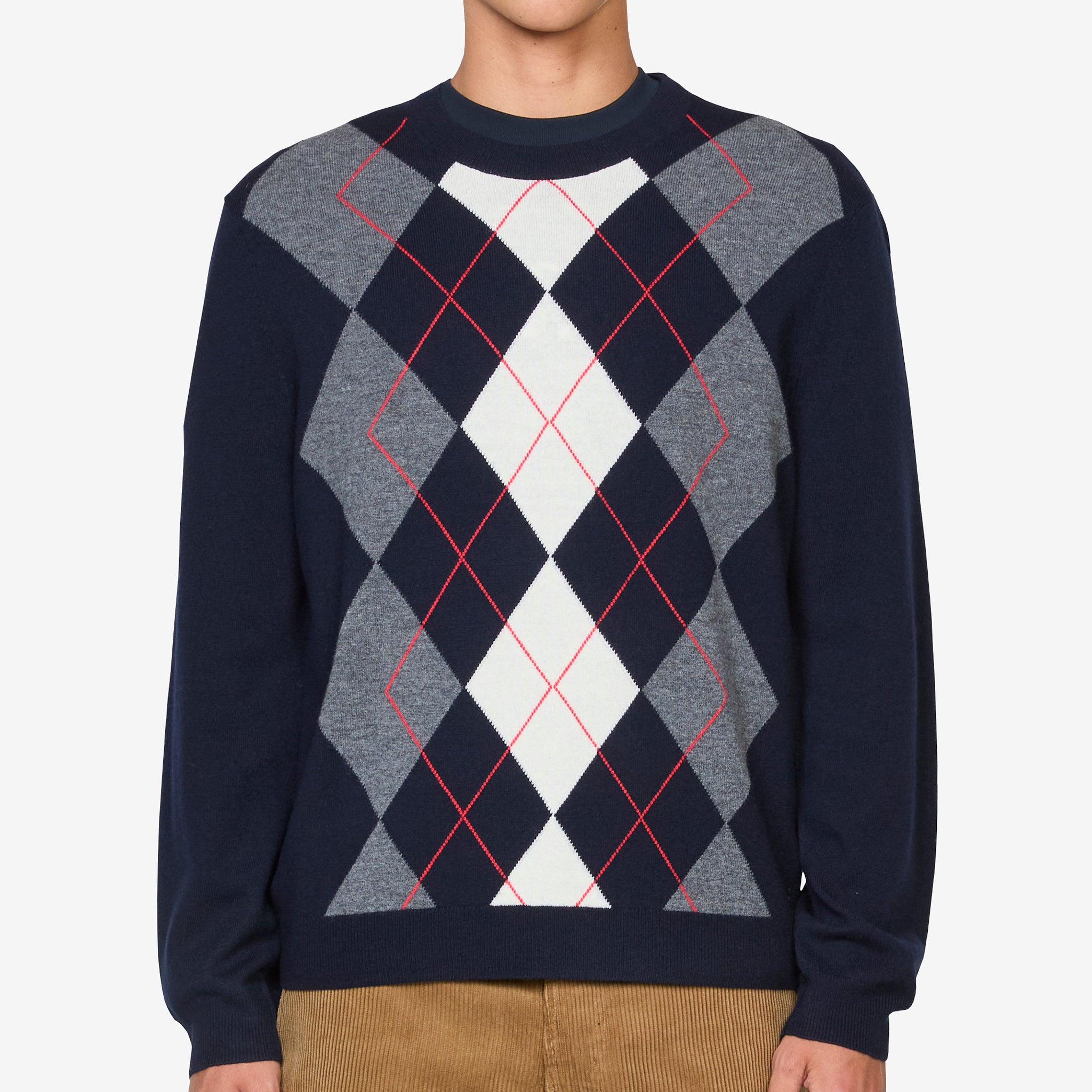 Evan Jumper in Dark Navy from A.P.C.. Regular fit sweater with a crew neckline and ribbed trims. Crafted from Responsible Wool Standard wool in a tricolour argyle pattern. Finished with tonal embroidered branding at the lower left torso.