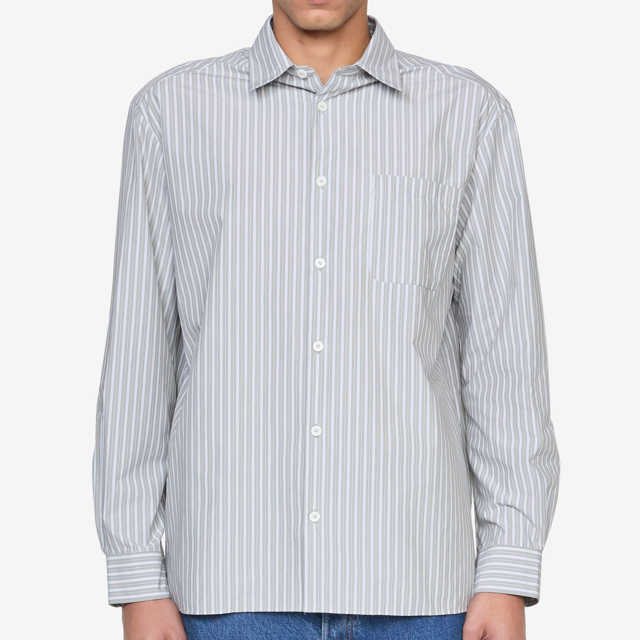 Malo Shirt in Gray Green from A.P.C. Relaxed fit shirt with a classic collar, mother-of-pearl button closure and a straight hem. Cut from a crisp cotton poplin in a pale green stripe and finished with a single patch pocket at the chest.