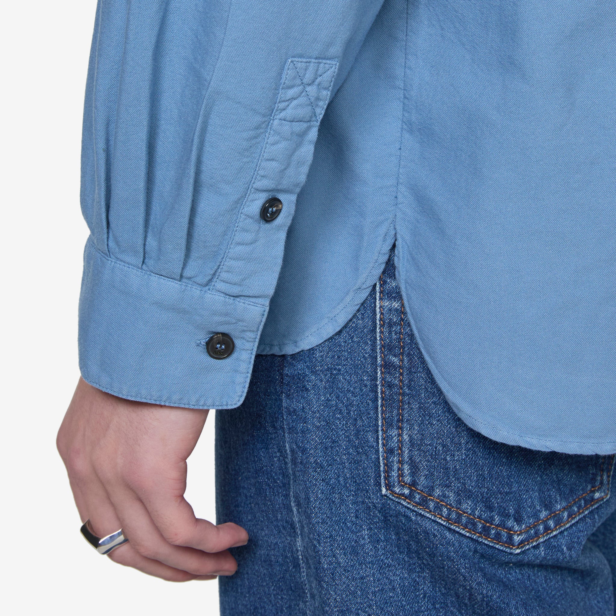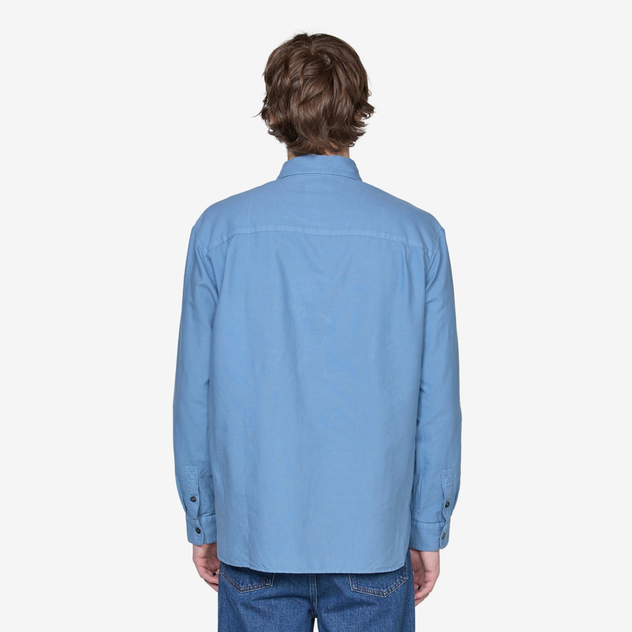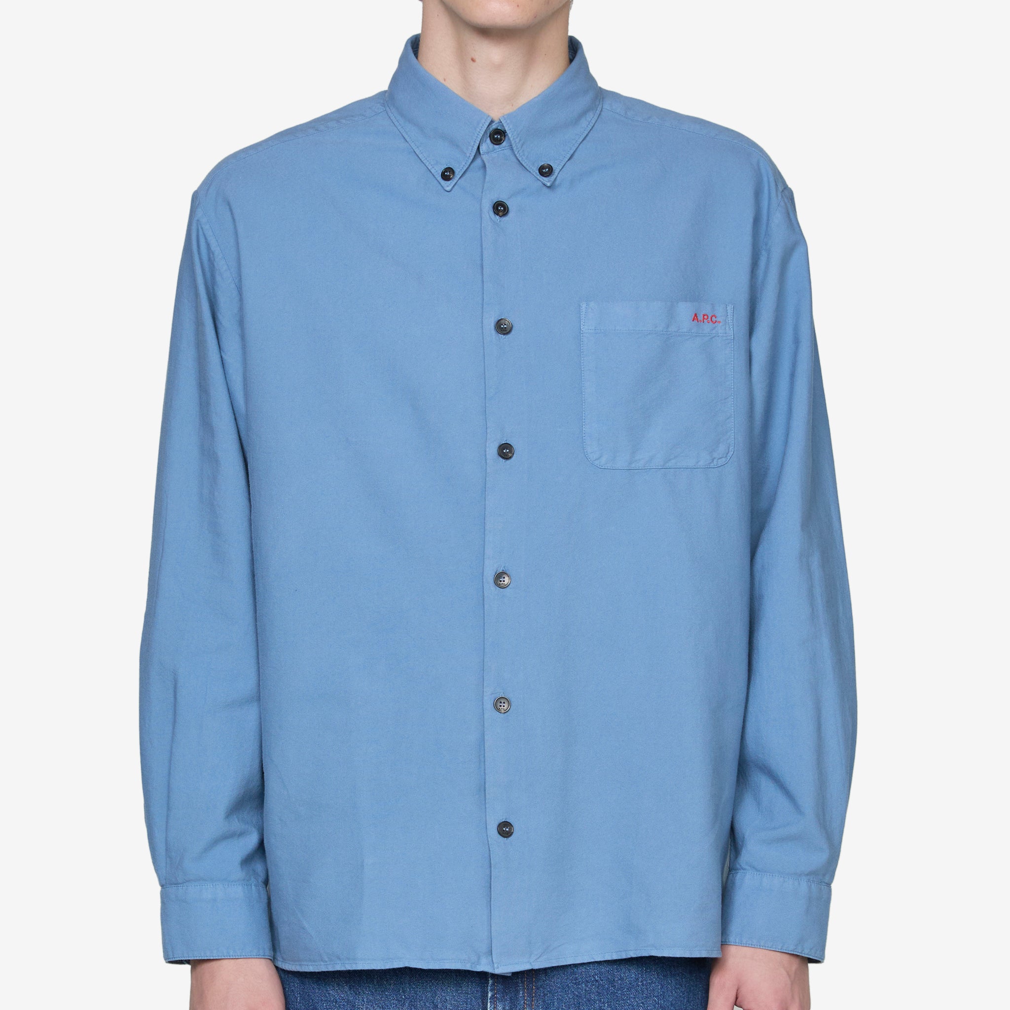 Mateo Logo Shirt in Blue Grey from A.P.C. Relaxed fit shirt with a button-down classic collar and straight hem. Crafted from breathable organic cotton and finished with a patch pocket with embroidered branding at the chest.
