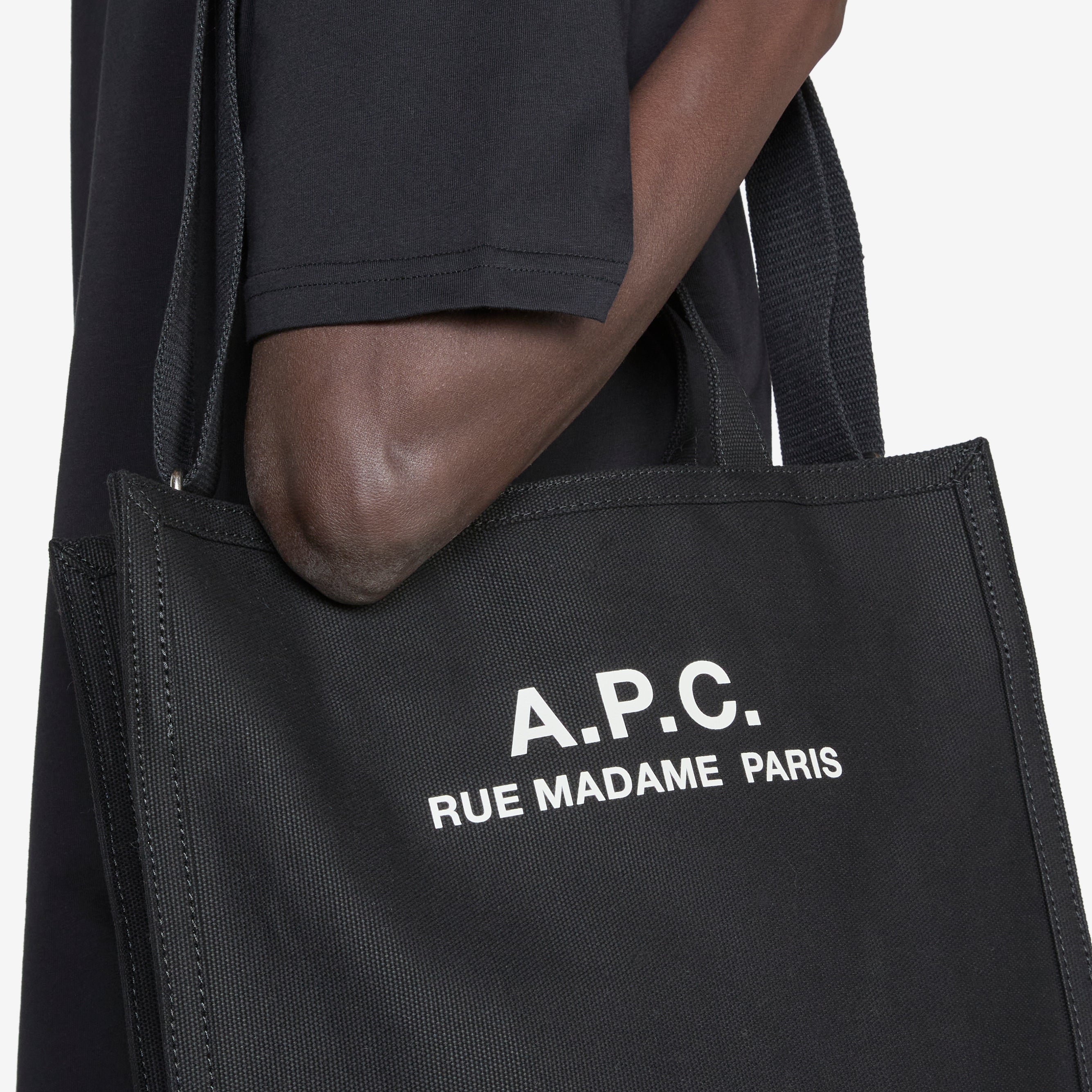 Men's Recuperation Shopping Bag in Black from A.P.C. Shopping bag with dual carry handles as well as an adjustable strap for styling options. Features a main compartment with two internal pockets. Crafted from raw cotton canvas and finished with printed branding on the exterior.