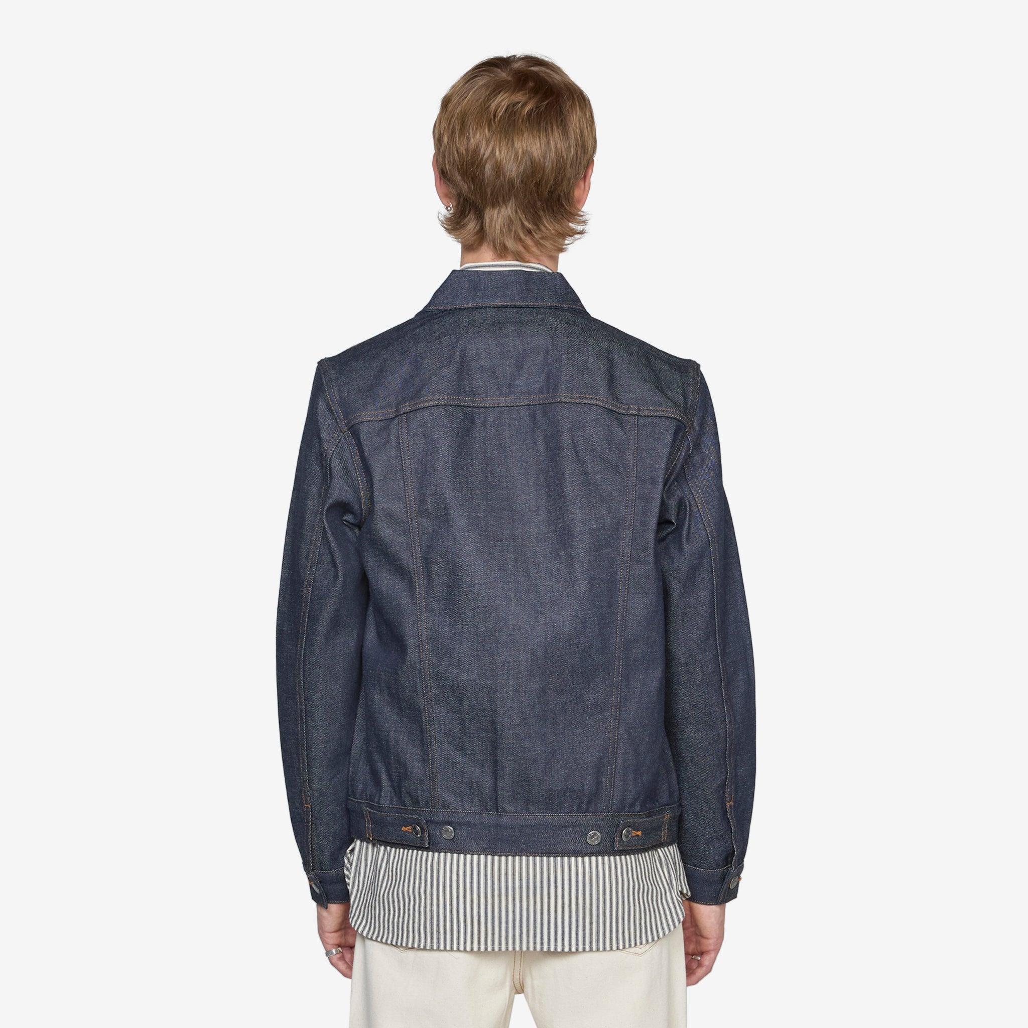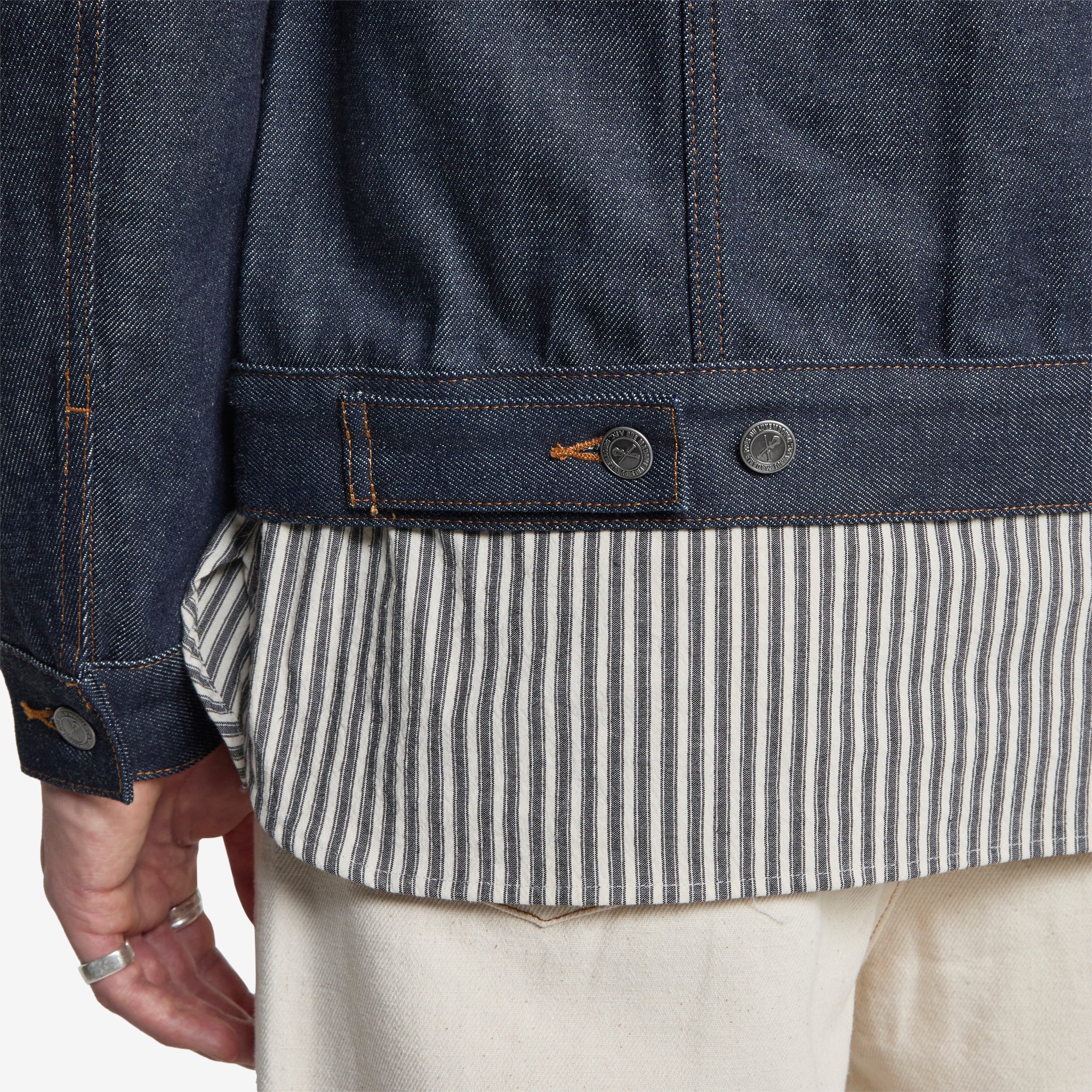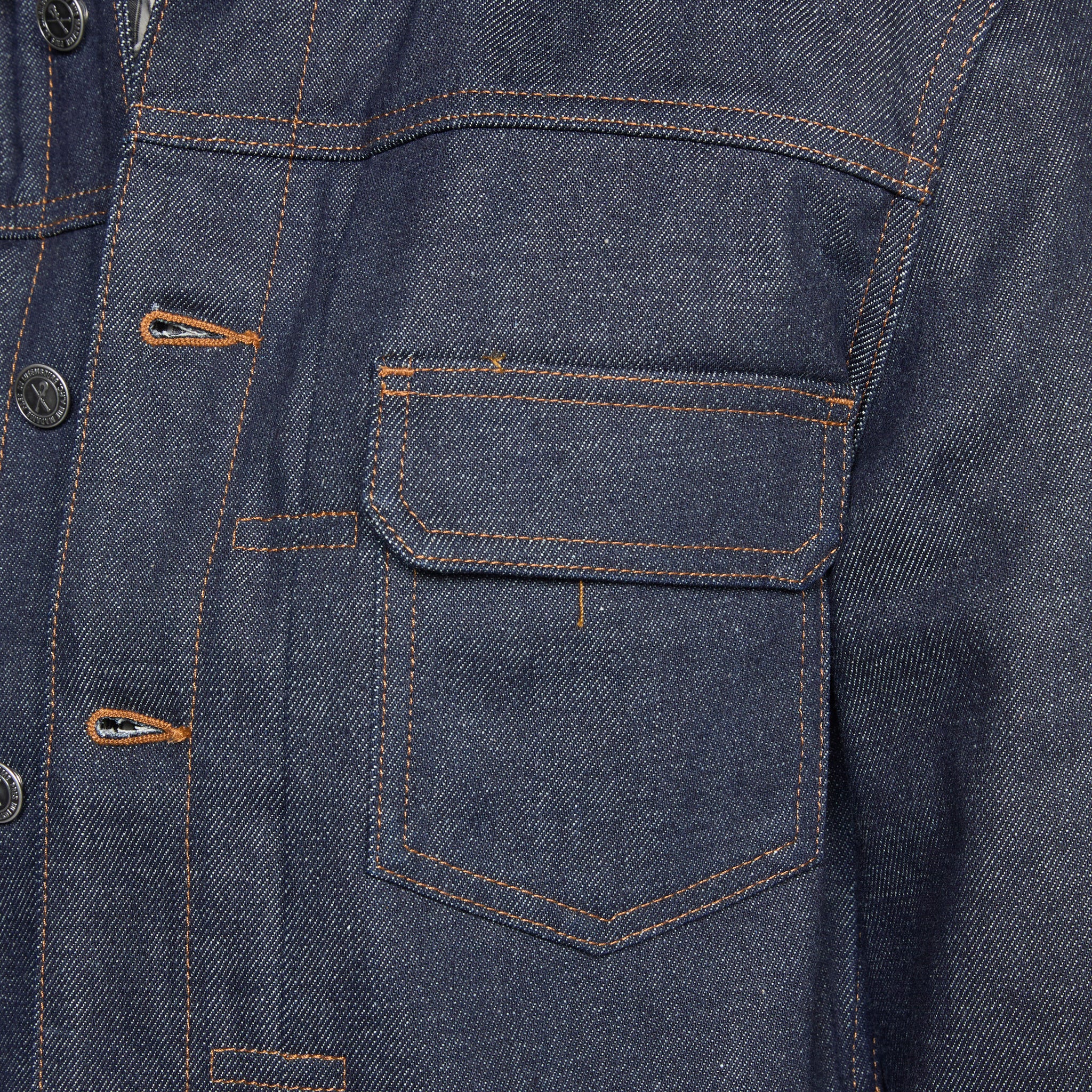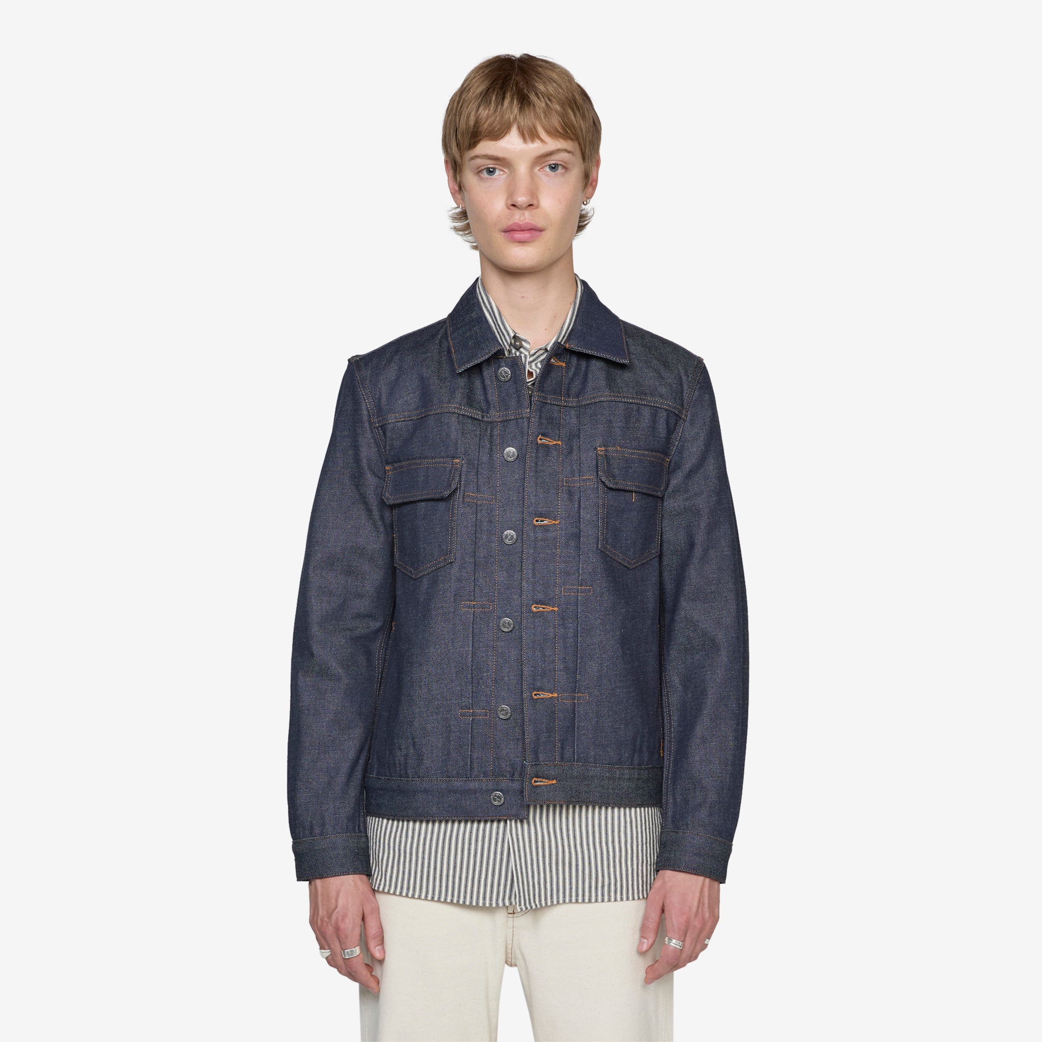 Work Jean Jacket in Indigo from A.P.C. Fitted cut jacket with tonal full button closure, two hidden side pockets and two button-flap closure chest pockets. Crafted from a Japanese selvedge denim blend with tone-on-tone stitching. Finished with button-adjustable tabs at the rear hem.