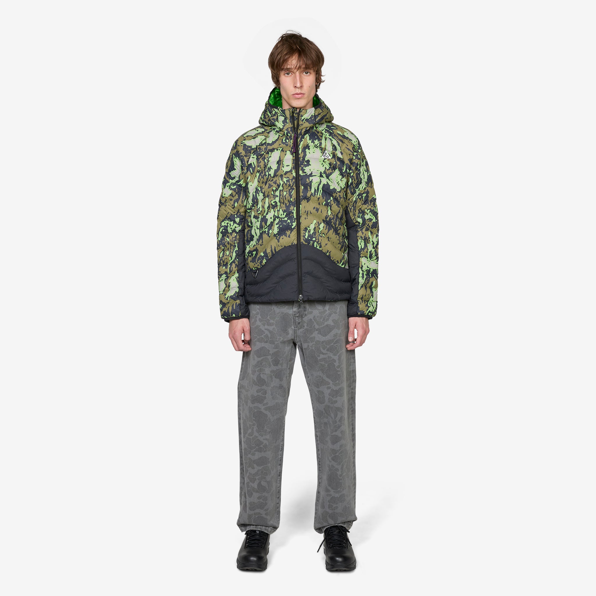 ACG 'Lava Flow' Therma-FIT ADV Jacket in College Grey, Black and Summit White from Nike. Relaxed fit, lightweight jacket with two-way zip closure, a comfy hood, zip-closure side pockets, a bungee-adjustable hem and elasticated cuffs. Crafted from in nylon a dolomite-inspired print with a water-repellent finish, PrimaLoft® Fill insulation and heat-regulating Therma-FIT ADV technology. Packable into a storage-friendly internal pocket and finished with classic ACG details like embroidered branding and a triangle carabiner.