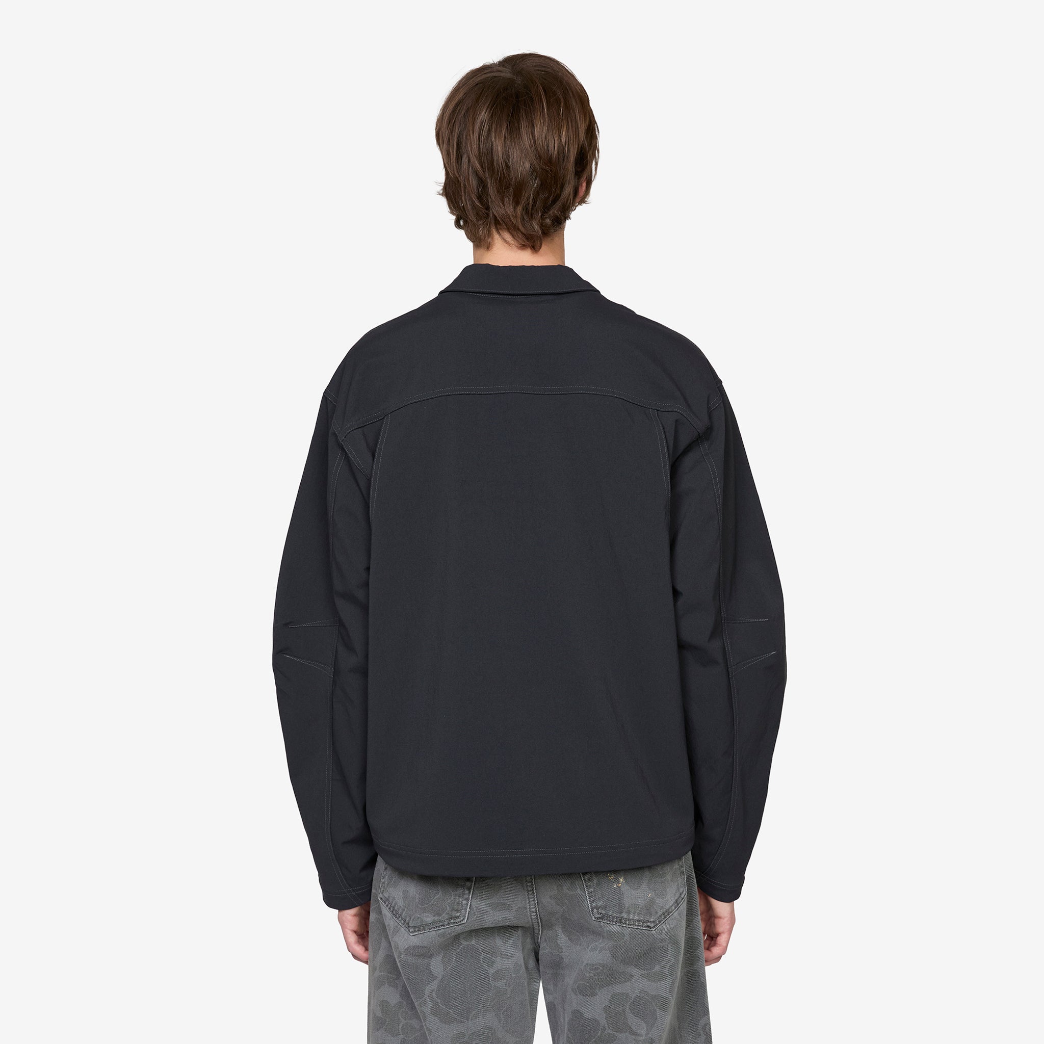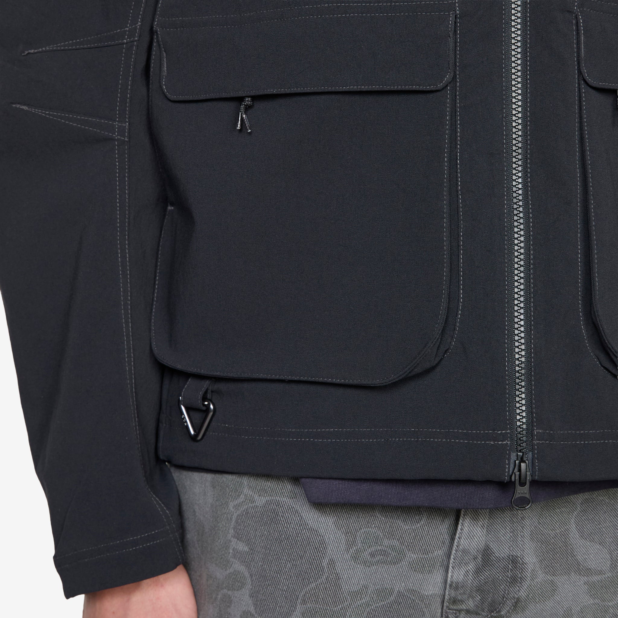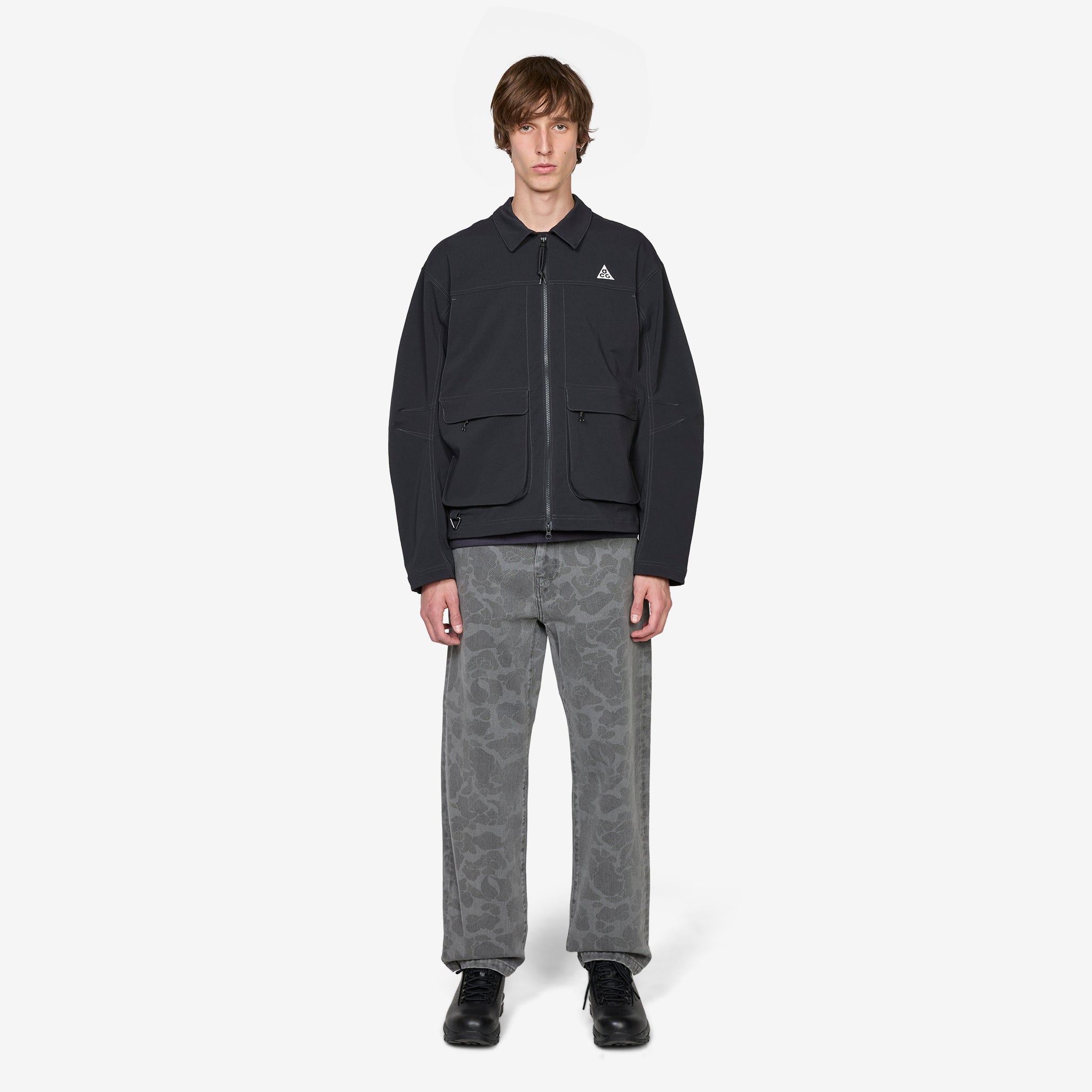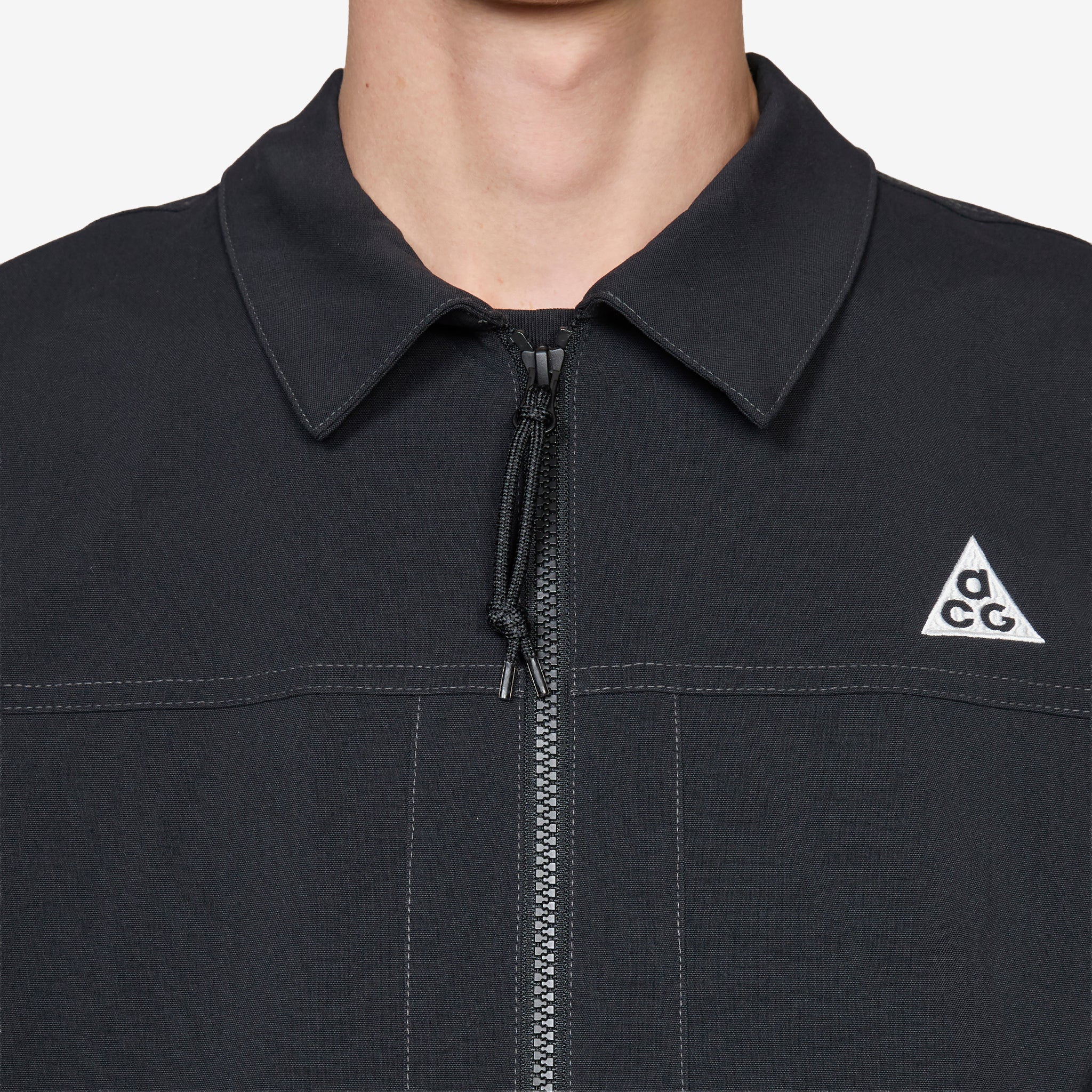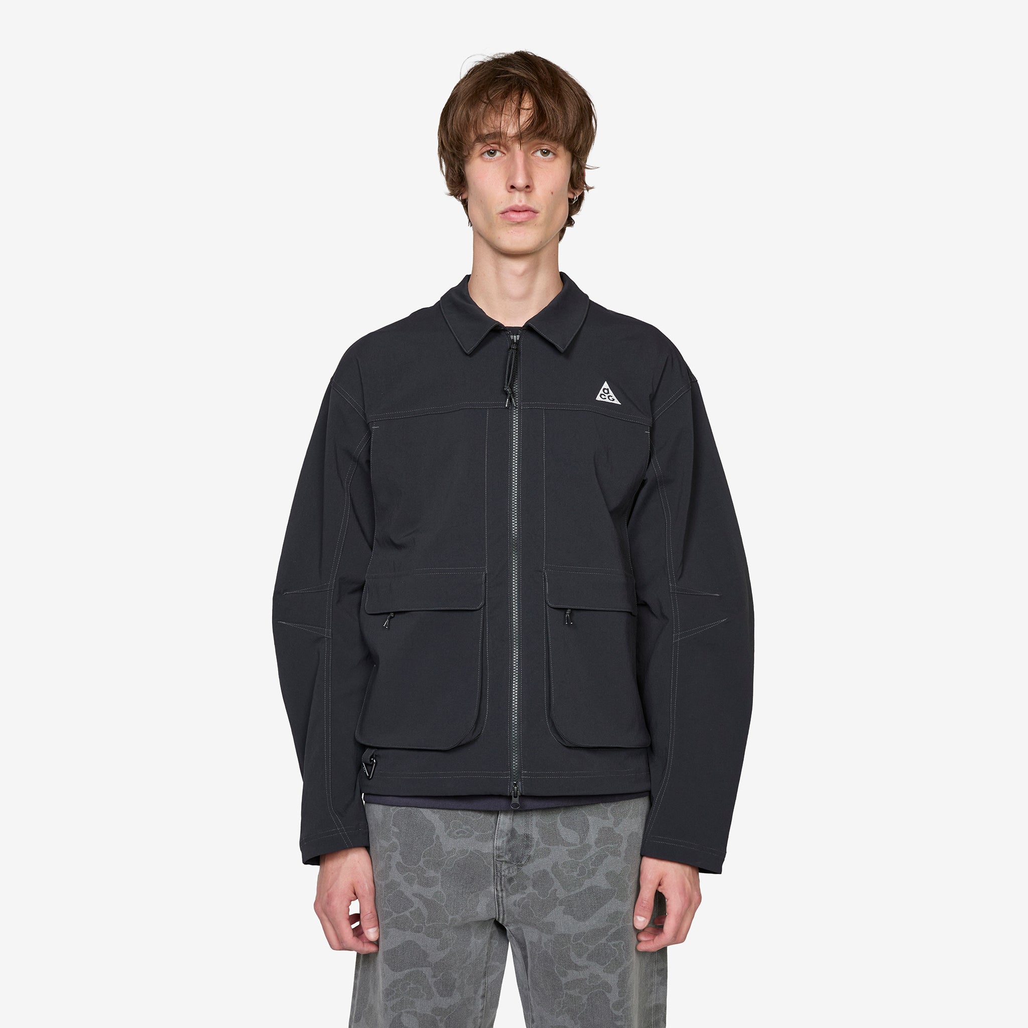 ACG 'Smith Summit' UV Jacket in Black, Anthracite and Summit White from Nike. Relaxed fit jacket with a classic collar, 2-way zip closure, flap-closure cargo pockets, side seam pockets and a bungee-adjustable hem. Crafted from UVA and UVB protective midweight nylon vanvas with a mesh-lined vent at the back for airflow. Finished with a triangular ACG carabiner and embroidered branding.