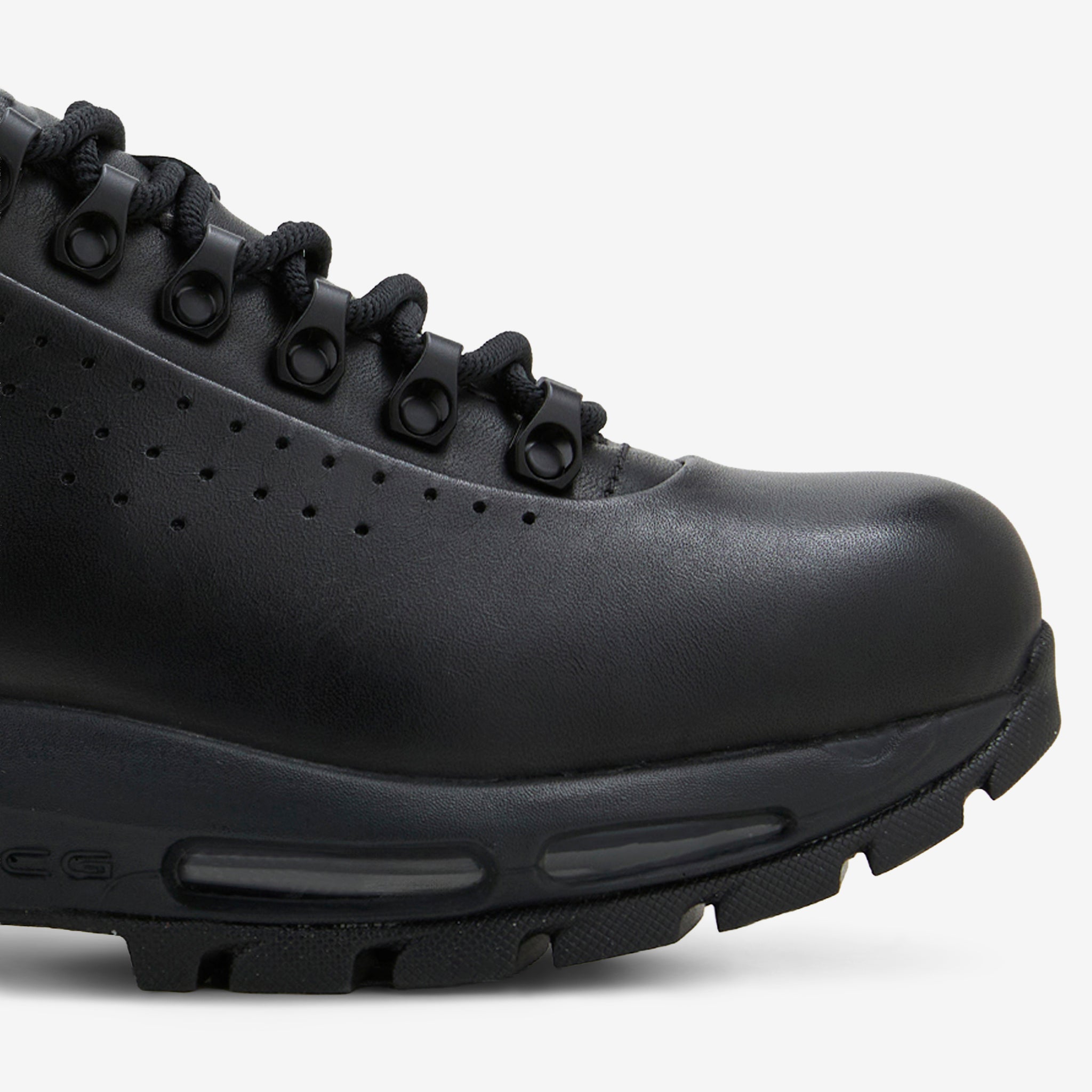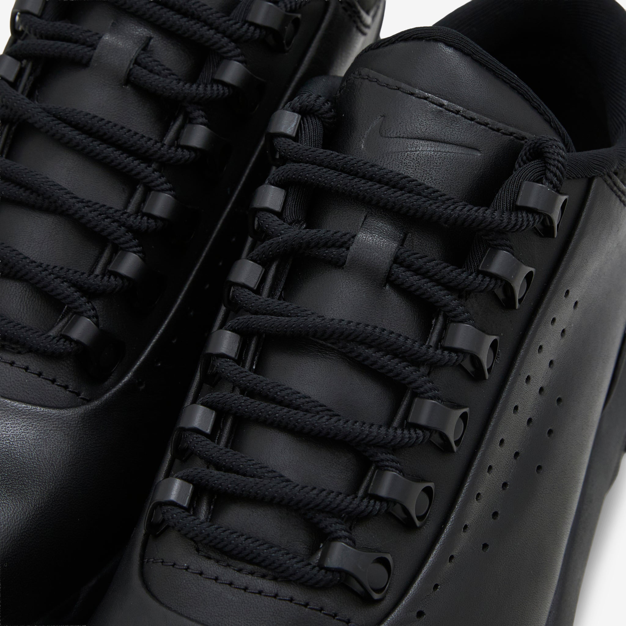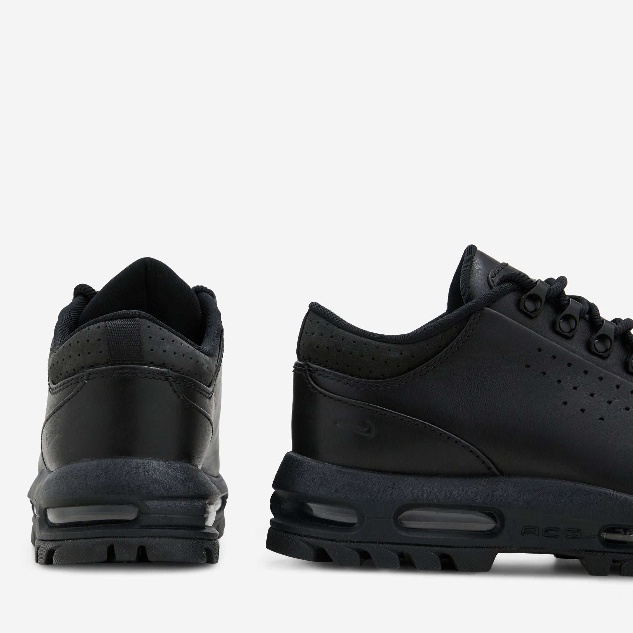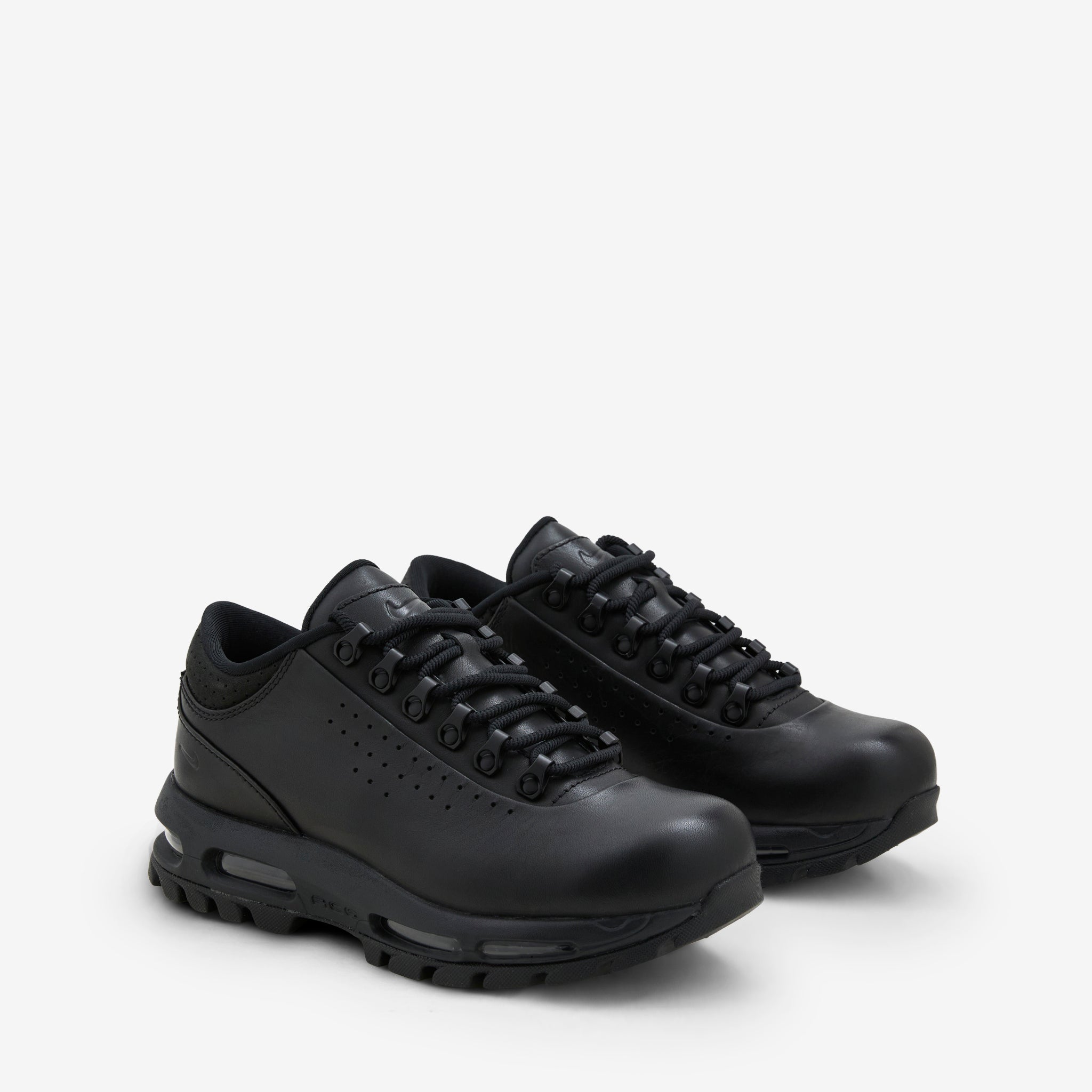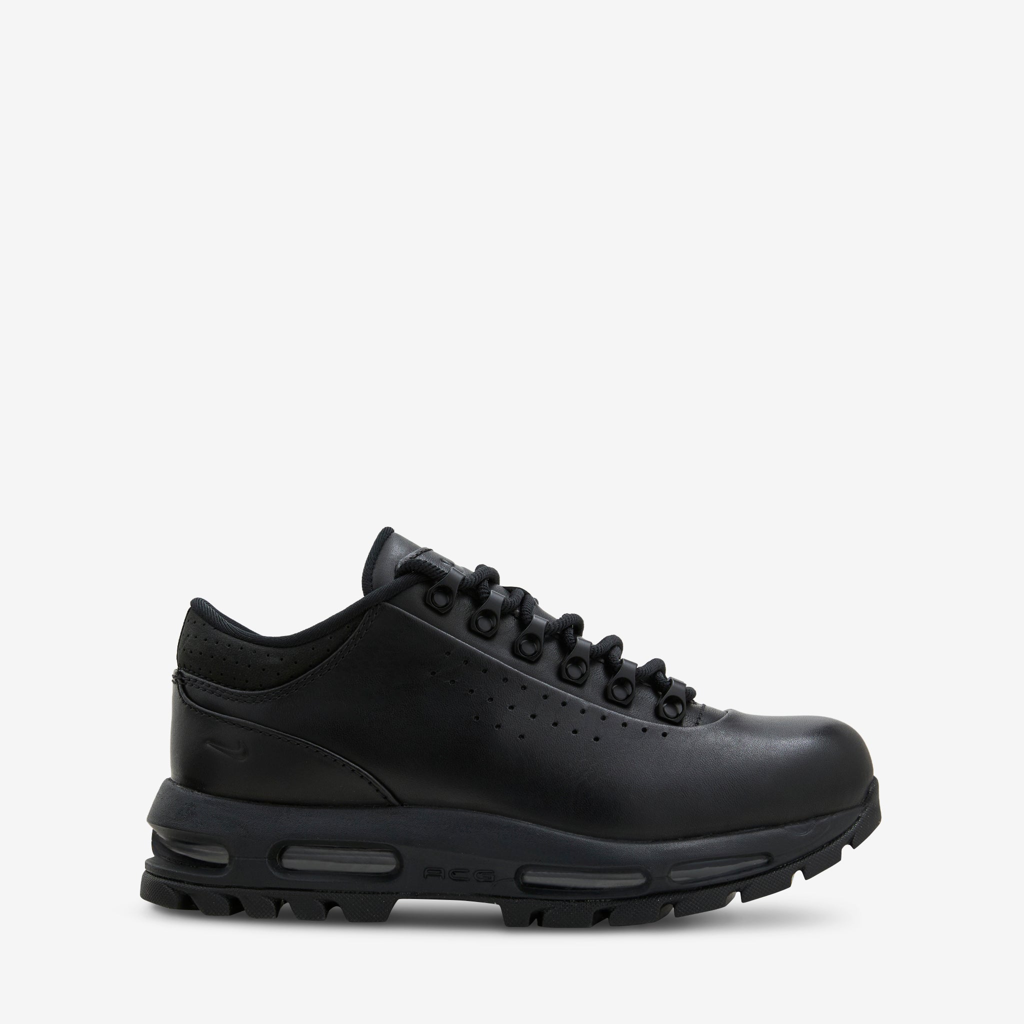Men's Air Max Goadome Low SP in Black and Anthracite from Nike. A redesigned, low-top version of the classic Goadome boot, this silhouette features a premium leather upper, padded collar and metal eyelet lace closure. Signature Nike Air technology provides premium impact absorption. Finished with a durable rubber outsole and perforated details.