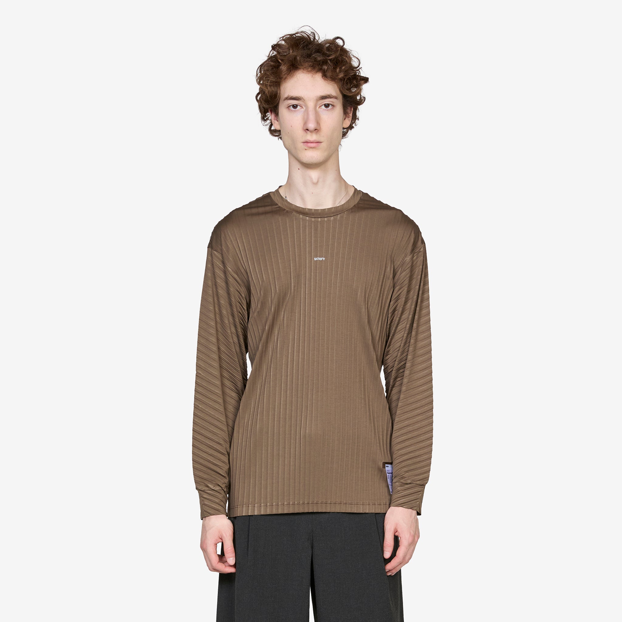 AuraLite™ Pleated Long T-Shirt in Olive from Satisfy. Loose fit longsleeve t-shirt with a ribbed crew neckline and cuffed sleeves. Crafted from AuraLite™ lightweight Japanese recycled polyester which is pleated for minimal skin contact and channeled cooling. Finished with a printed Satisfy logo on the chest and a detachable exterior care label so nothing rubs against your skin.