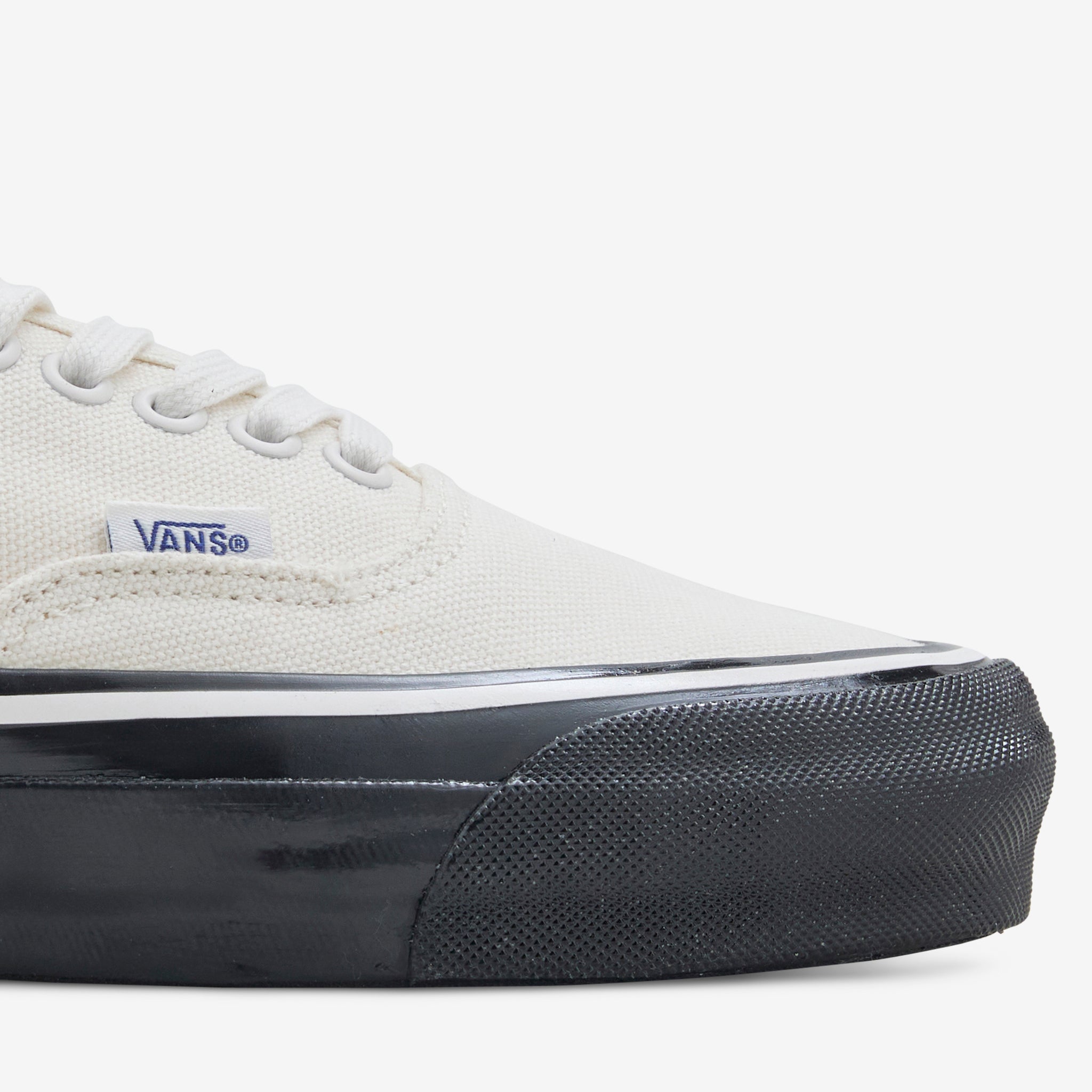 Men's Authentic 44 in Duck Canvas White and Black from Vans. Heritage silhouette with a low-profile duck canvas upper and full-grain leather collar lining. Sola Foam All-Day-Comfort insole provides daily cushioning while the rubber marshmallow sole offers durable traction. Finished with a signature branded red heel scab.