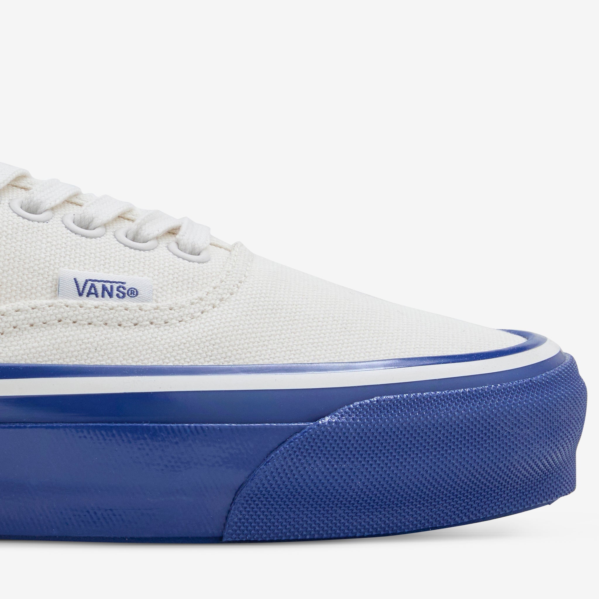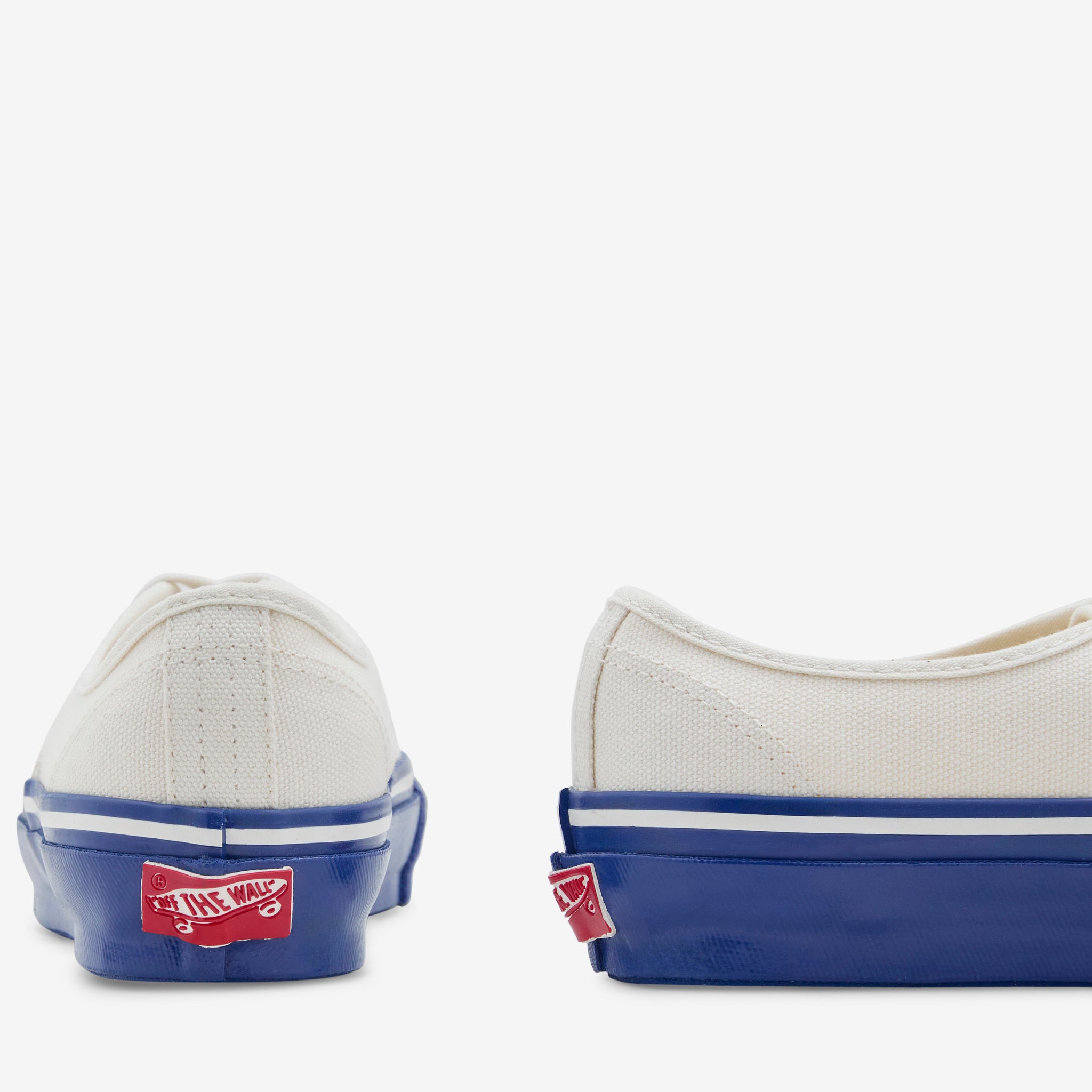 Men's Authentic 44 in Duck Canvas White and Blue from Vans. Heritage silhouette with a low-profile duck canvas upper and full-grain leather collar lining. Sola Foam All-Day-Comfort insole provides daily cushioning while the rubber marshmallow sole offers durable traction. Finished with a signature branded red heel scab.