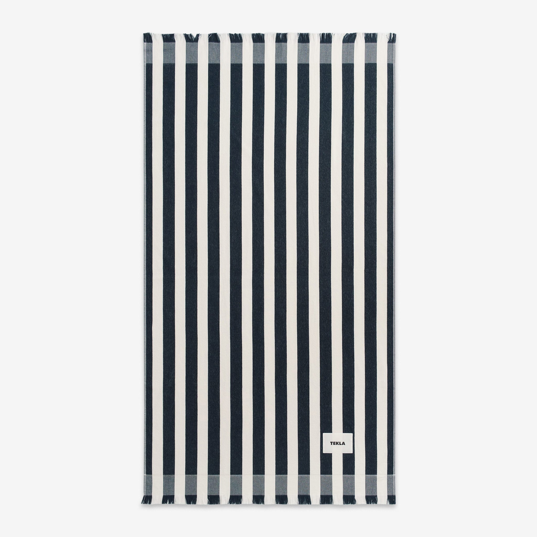 Beach Towel in Cala Stripes from Tekla. Designed to be gentle on skin. Lightweight yet compact, the weave offers high absorbency at little weight. Cut to a larger size for shoreside lounging. Finished with a woven brand patch and fringed edges.