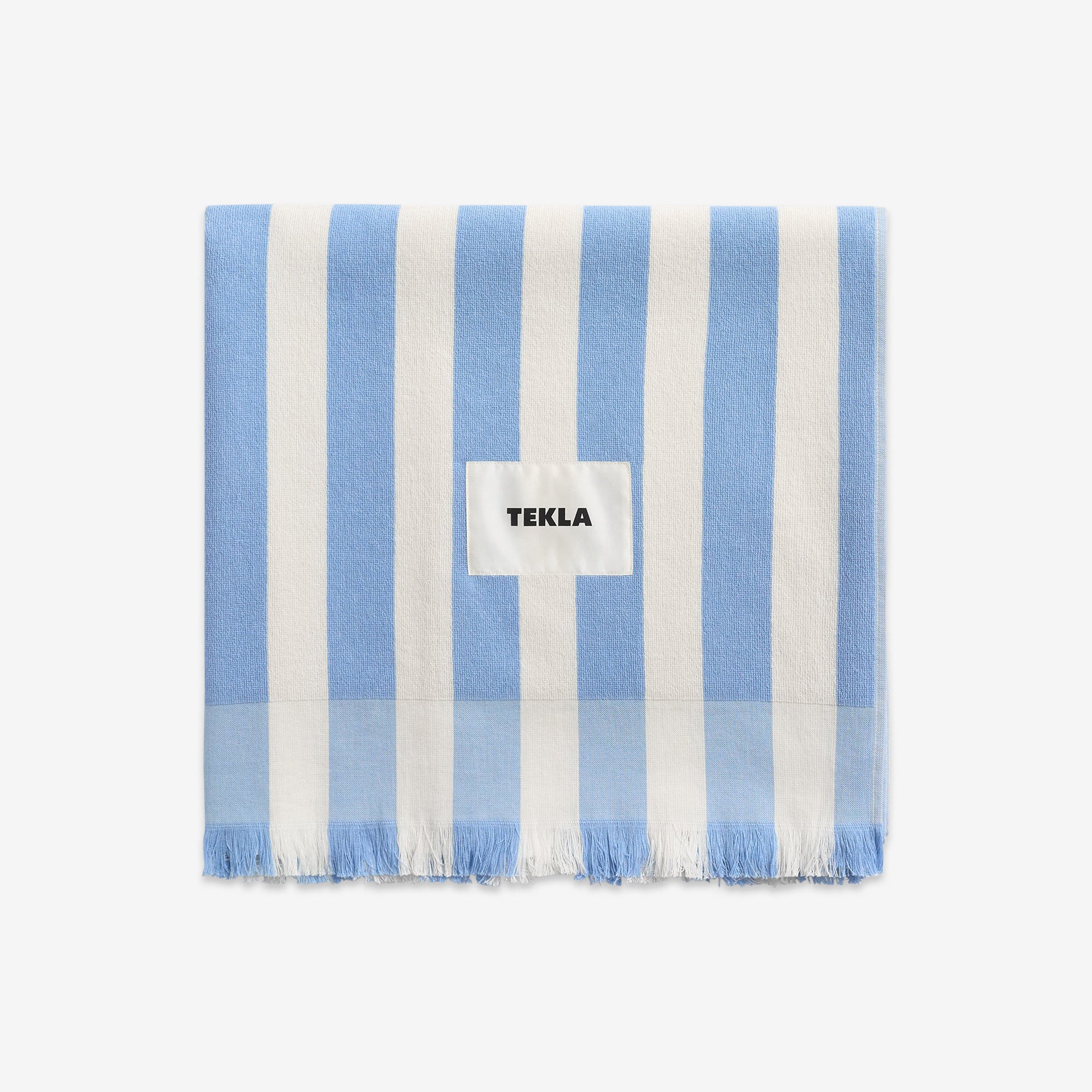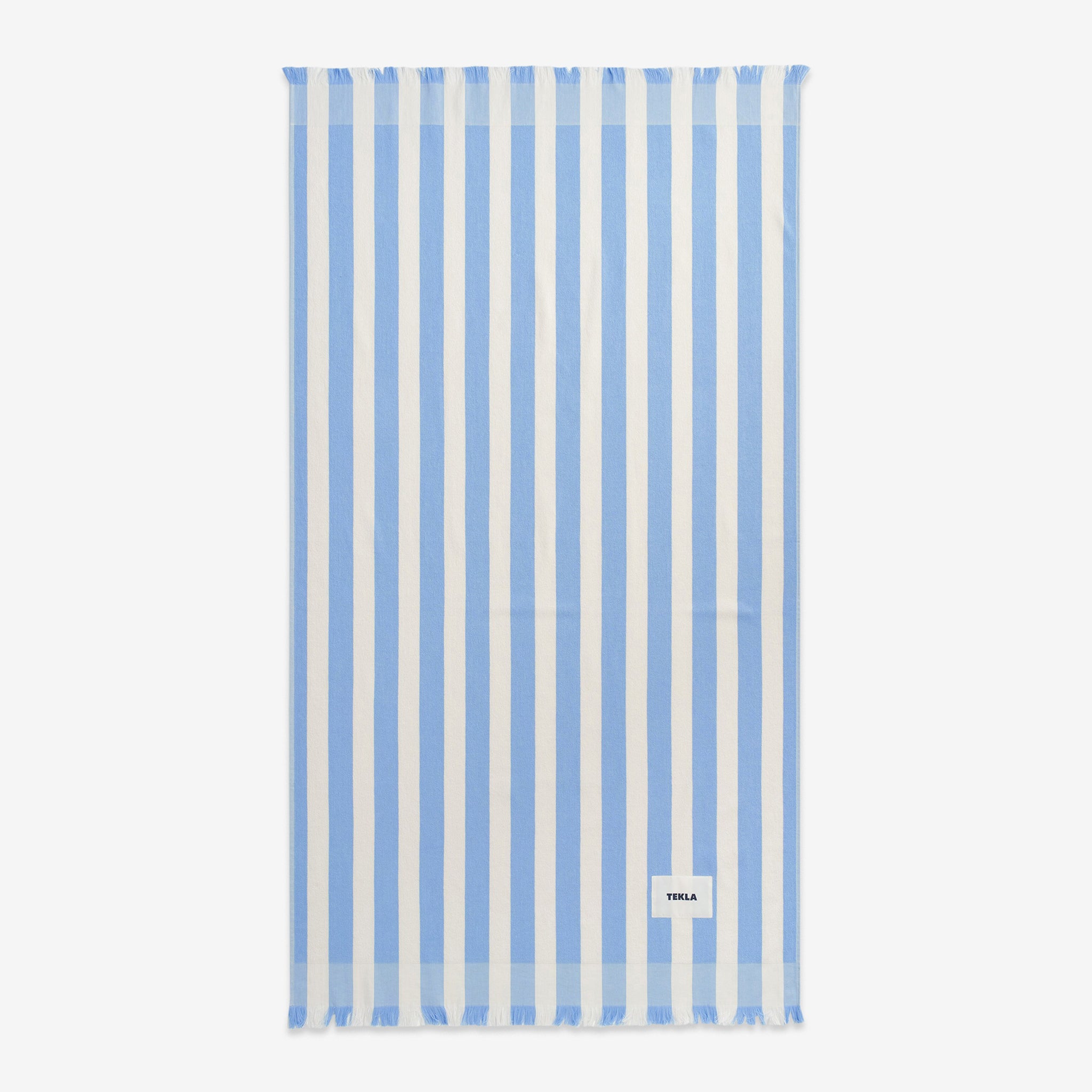 Beach Towel in Moro Stripes from Tekla. Designed to be gentle on skin. Lightweight yet compact, the weave offers high absorbency at little weight. Cut to a larger size for shoreside lounging. Finished with a woven brand patch and fringed edges.