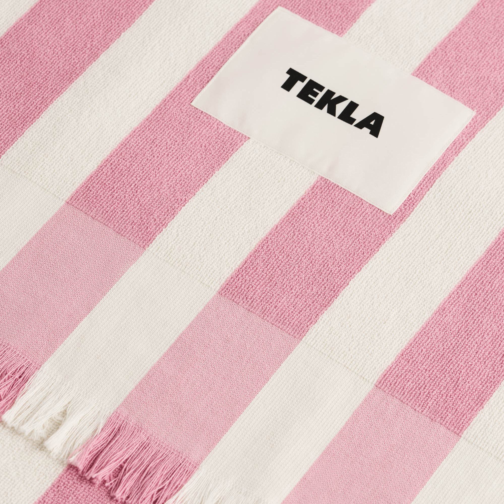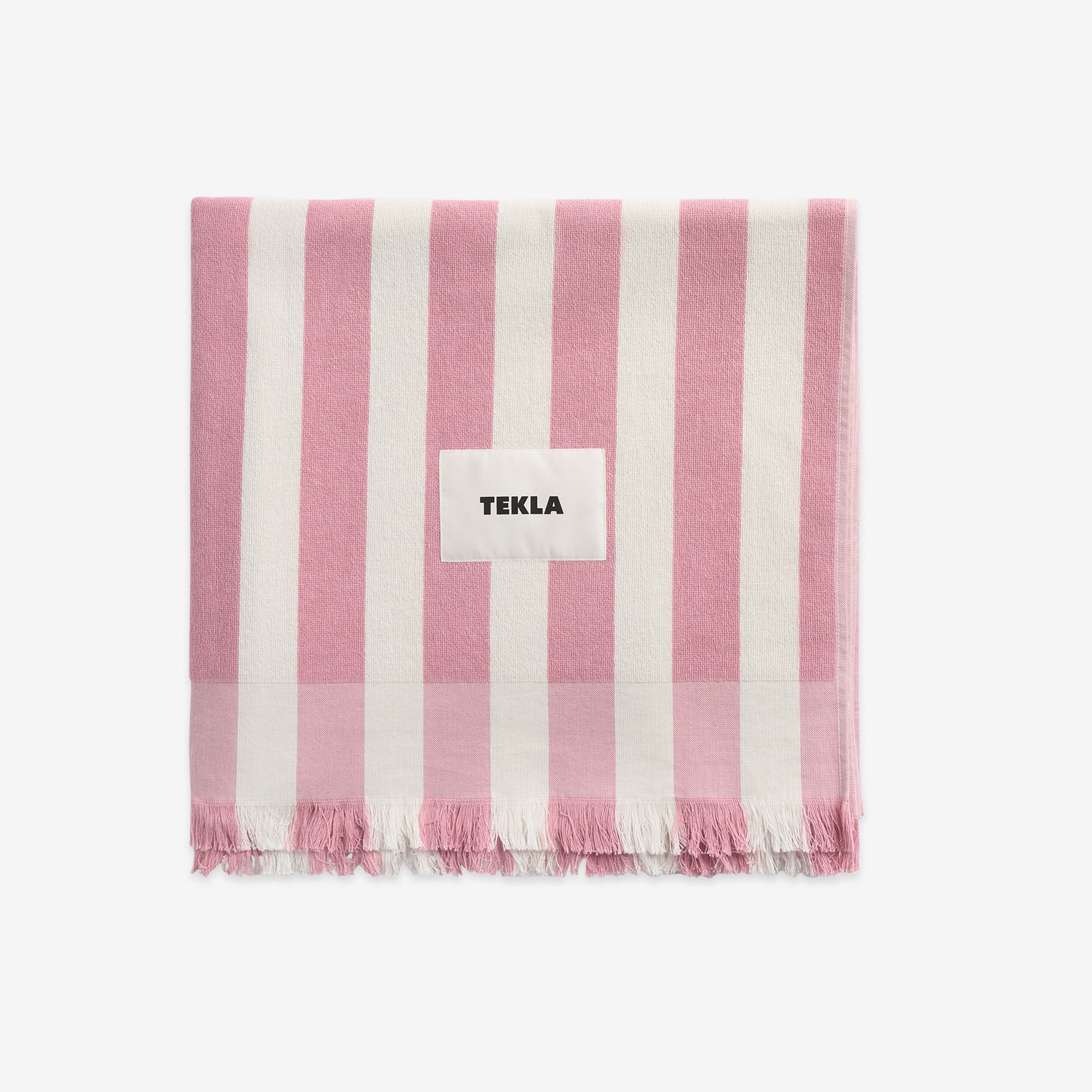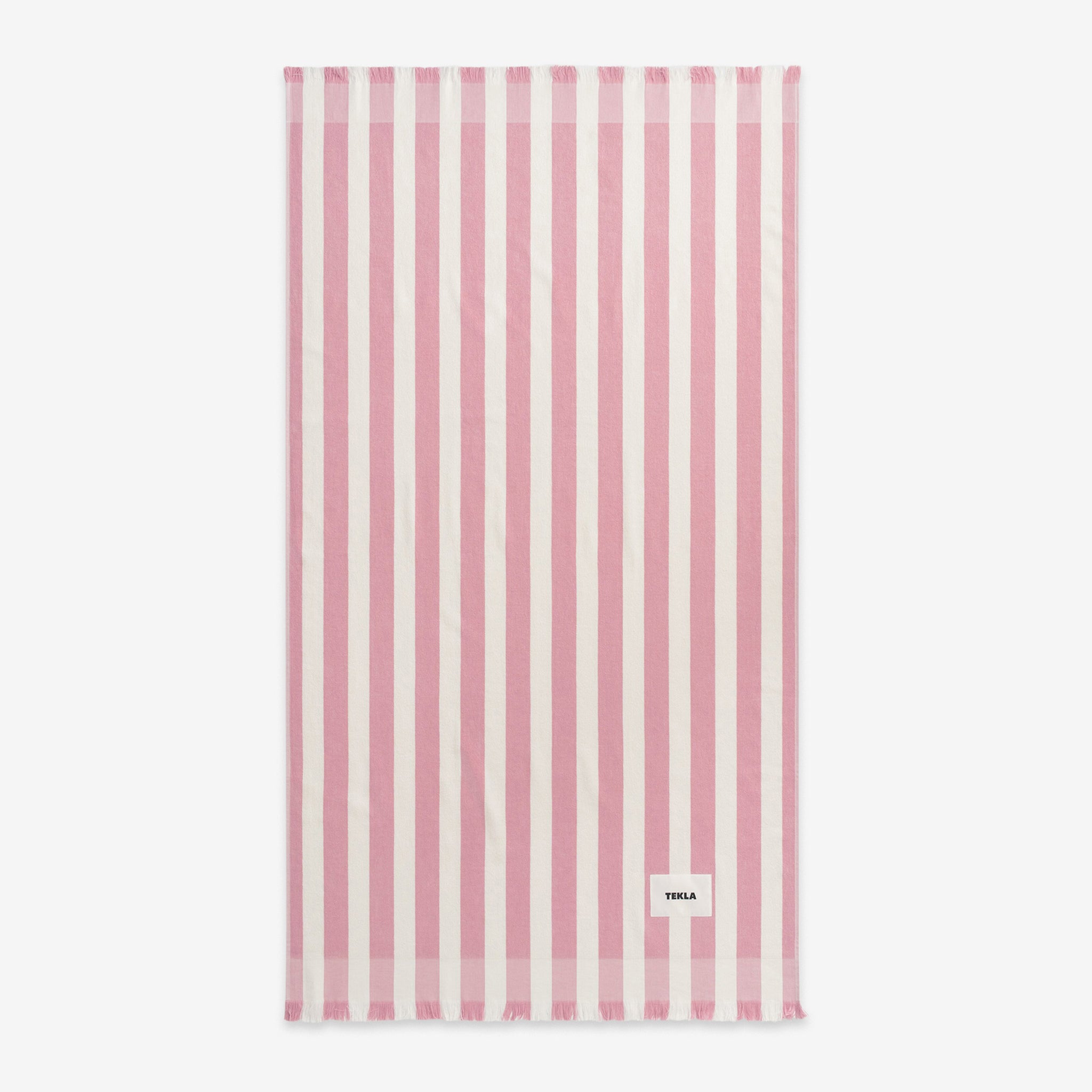 Beach Towel in Palma Stripes from Tekla. Designed to be gentle on skin. Lightweight yet compact, the weave offers high absorbency at little weight. Cut to a larger size for shoreside lounging. Finished with a woven brand patch and fringed edges.