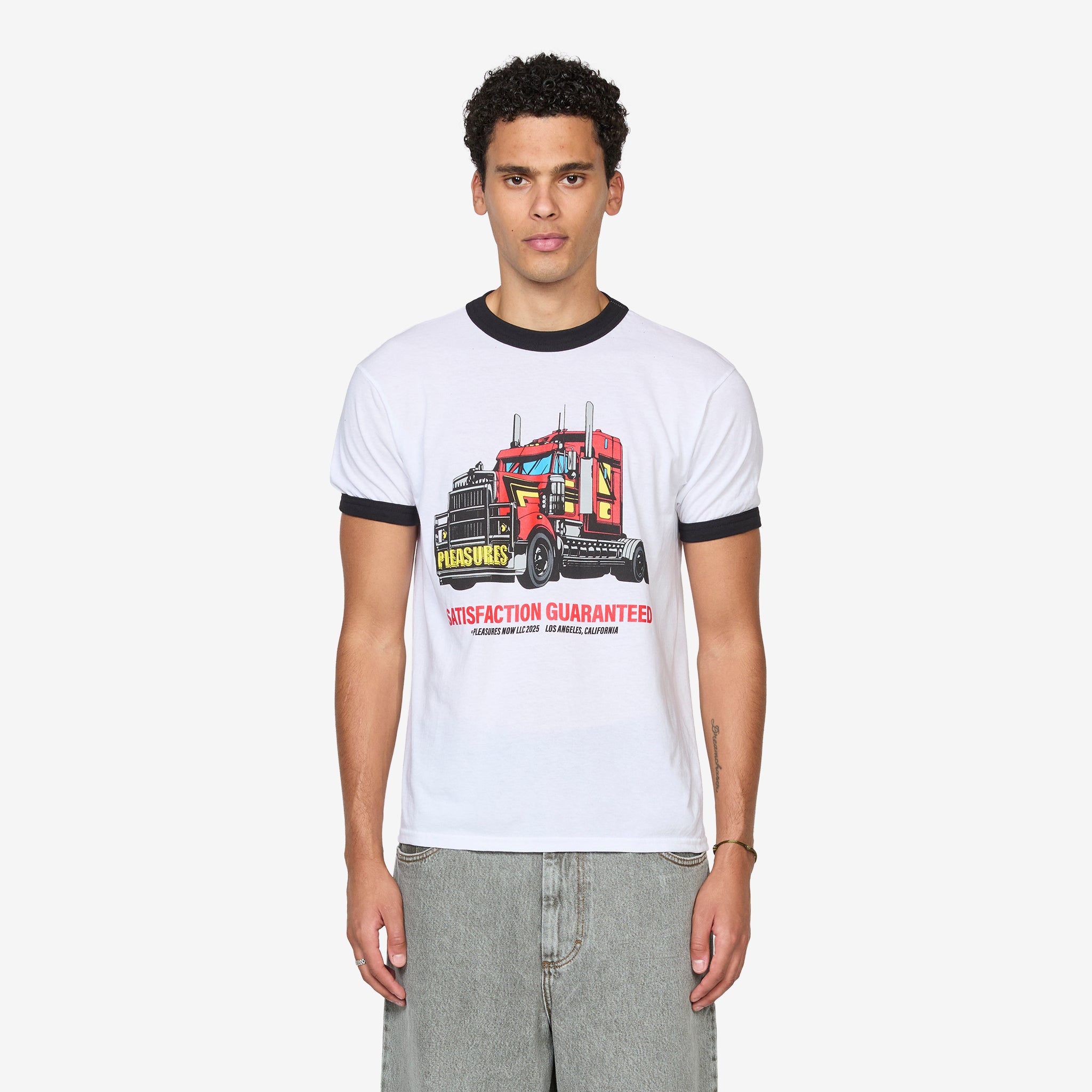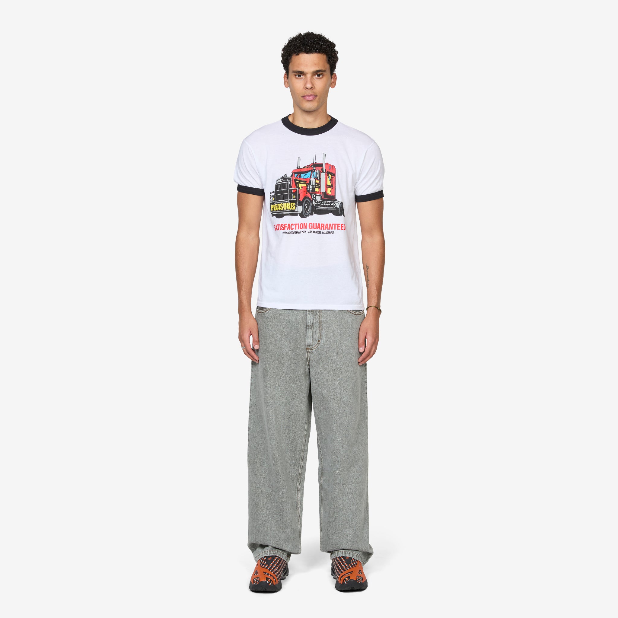 Big Load Ringer T-Shirt in White from PLEASURES. Regular fit t-shirt with a crew neckline and contrast ribbed trims. Crafted from cotton and finished with printed graphic at the chest.