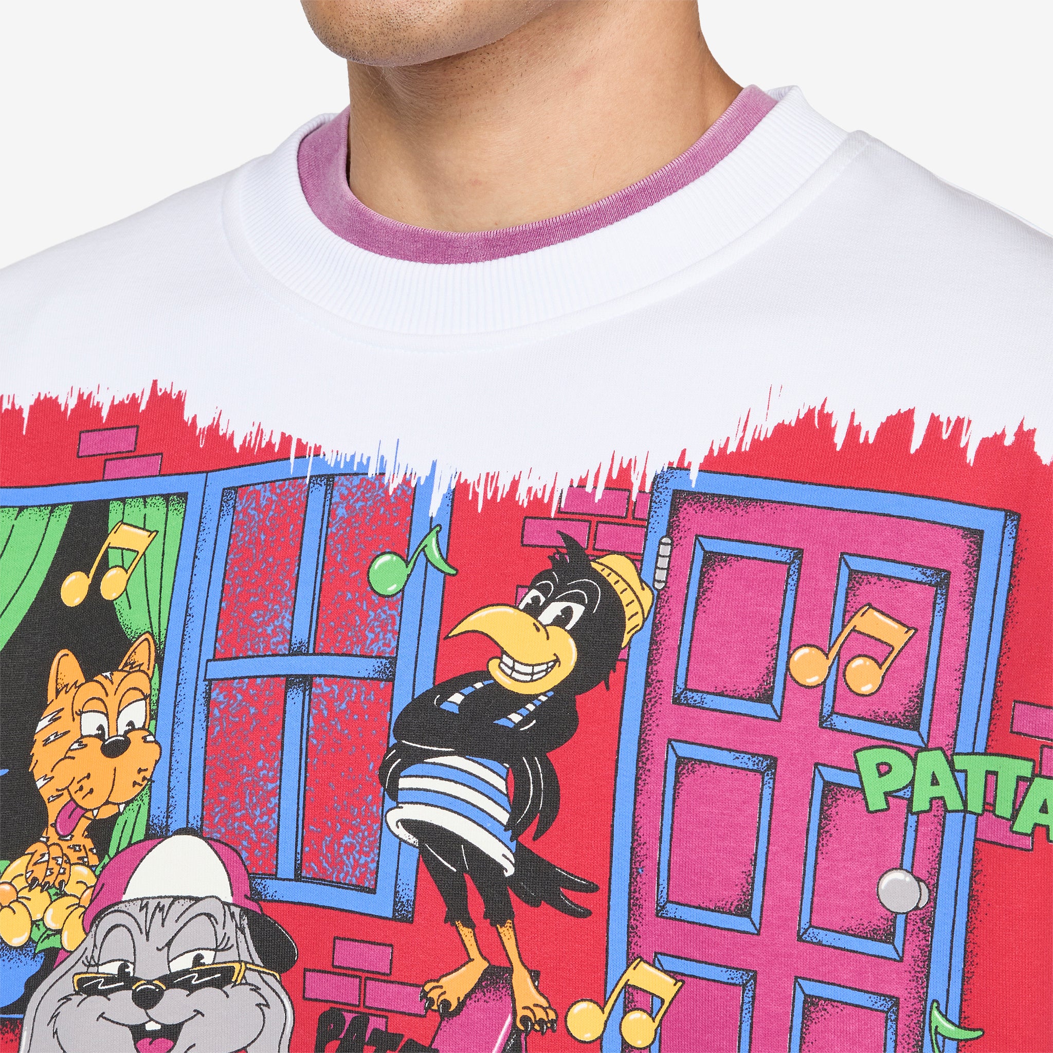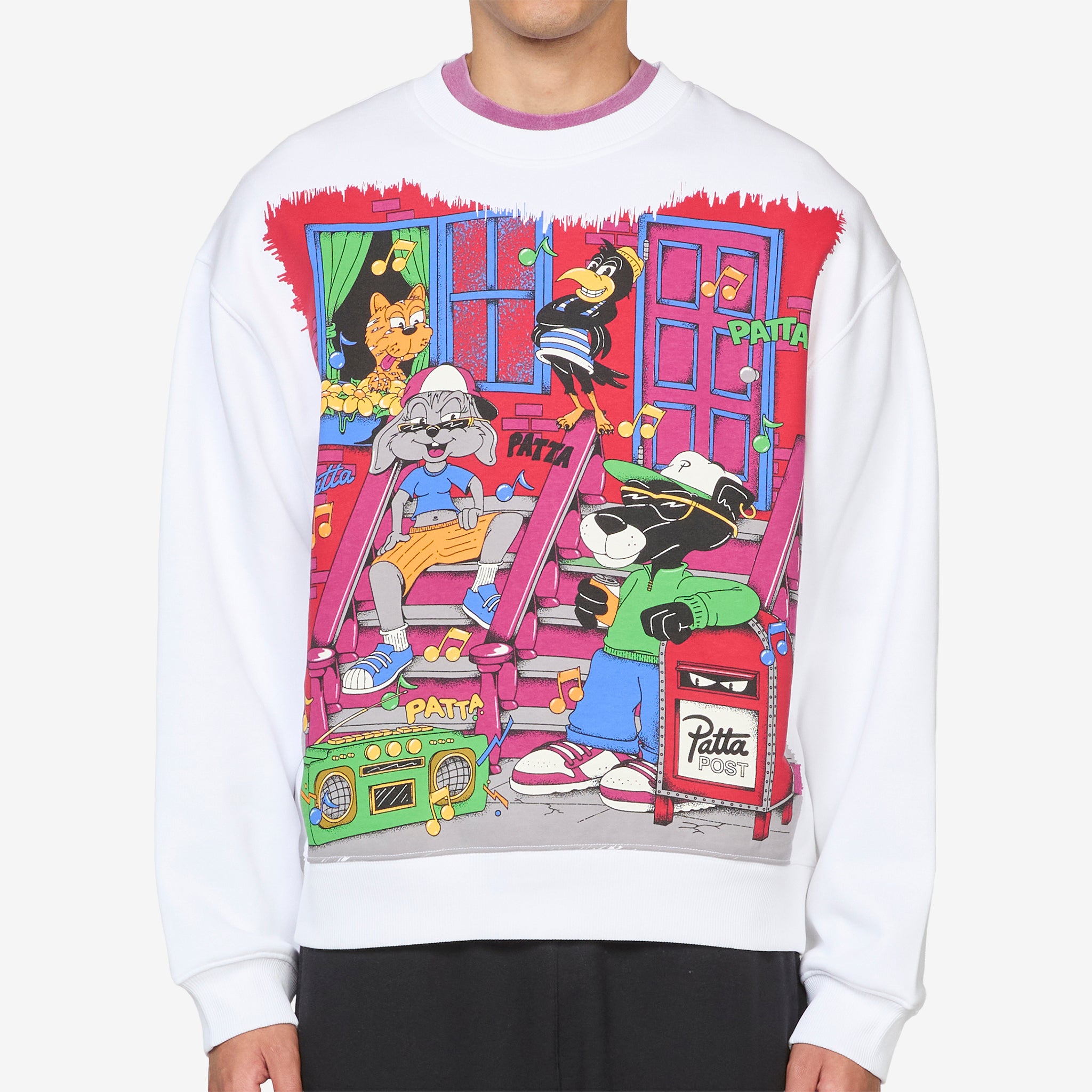 Block Party Crewneck Sweater in Light Grey Melange from Patta. Relaxed fit sweatshirt with a crew neckline and ribbed trims. Crafted from cotton fleece and finished with a printed graphic across the front and and printed branding at the back.