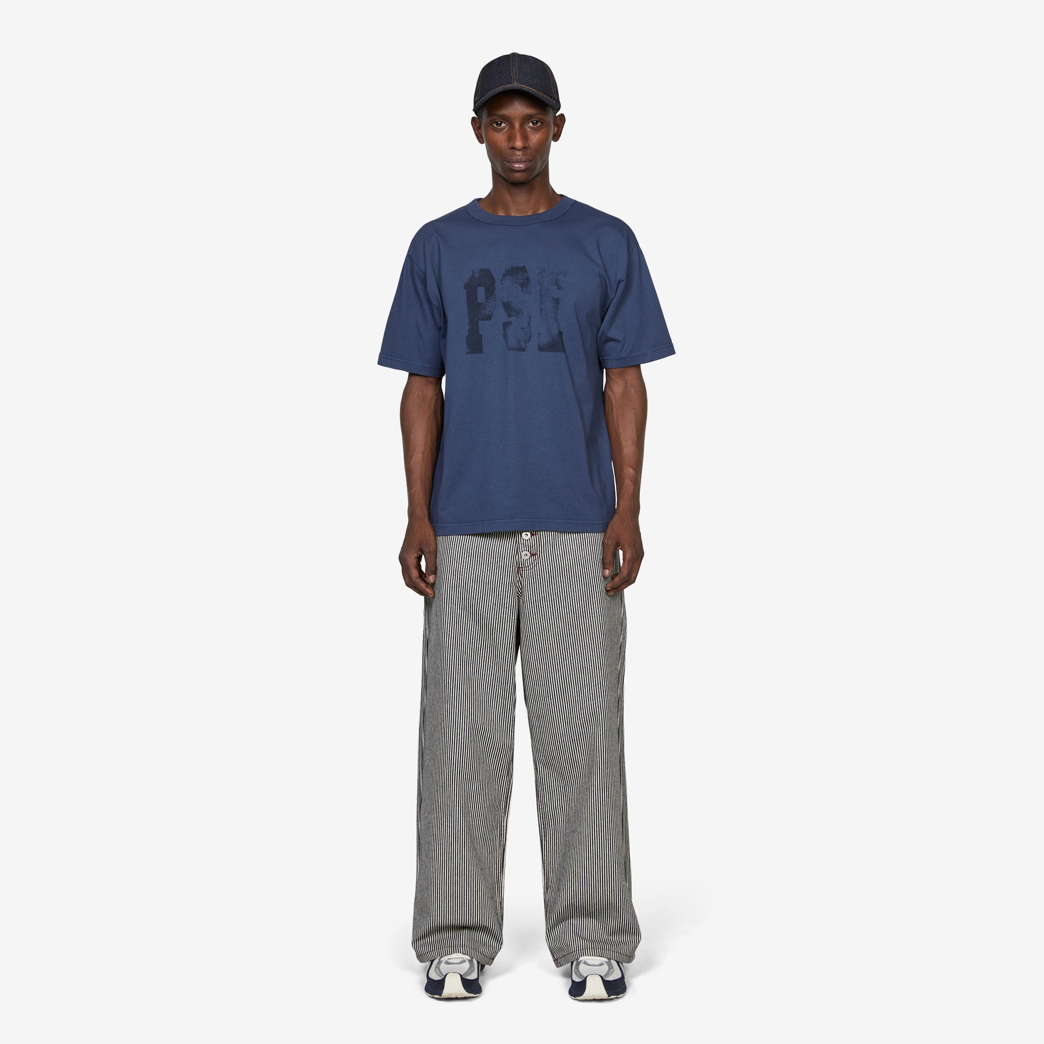 Boot T-Shirt in Navy from Pseushi. Relaxed fit t-shirt with a sturdy binding collar and relaxed, slightly cropped and relaxed silhouette. Crafted from heavyweight 220gsm cotton jersey which has been garment-dyed for a vintage, worn-in feel. Finished with a screen-printed graphic across the chest.