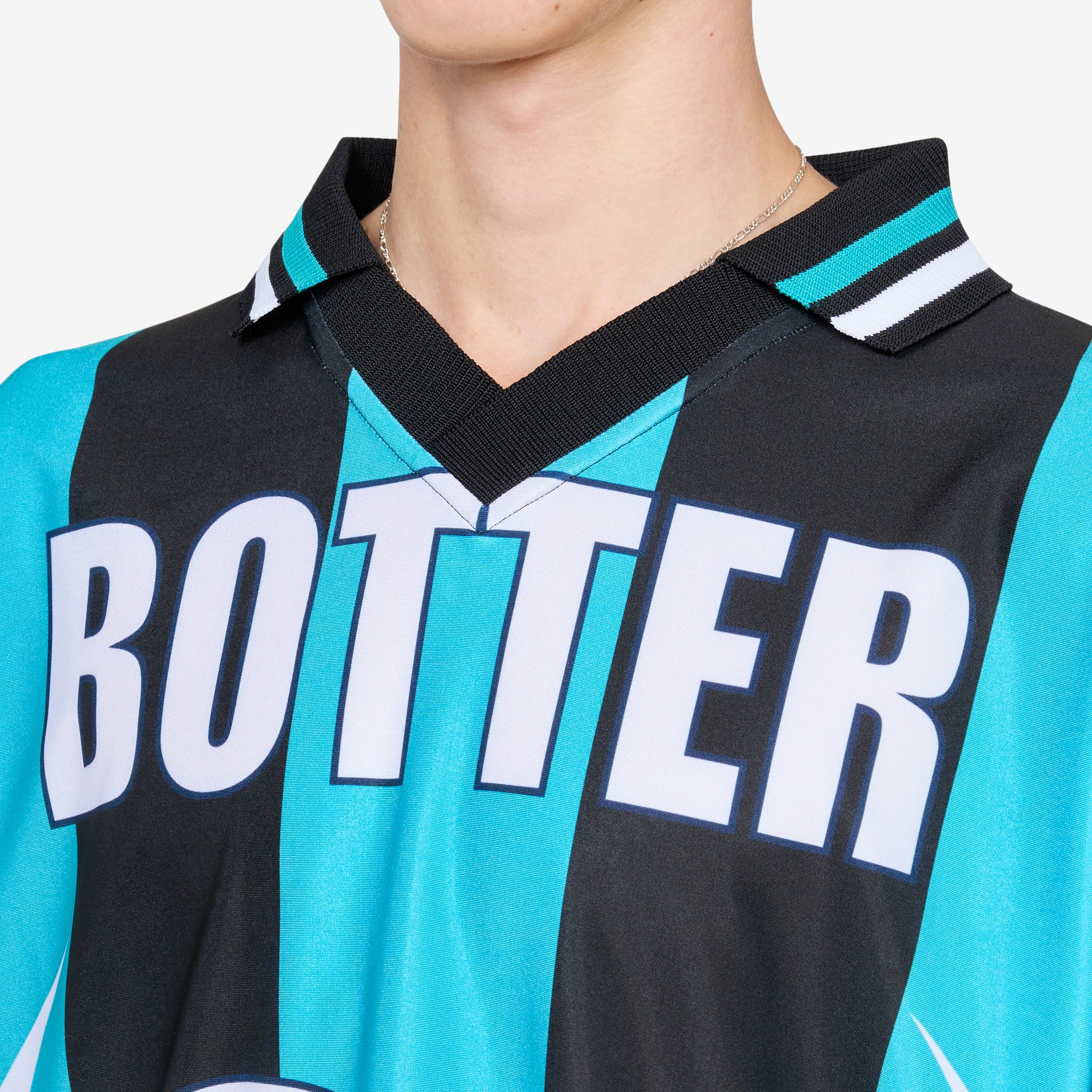 BOTTER collaborates with Reebok on the Reverse Soccer T-Shirt in Striped Navy and Aqua Blue. Oversized fit jersey with a classic colllar, dropped shoulders and contrast ribbed v-neckline. Crafted from a lightweight polyester blend in a bold stripe. Finished with reversed embroidered and printed collaborative branding graphics throughout, with a name and number on the front and brand patch on the back.