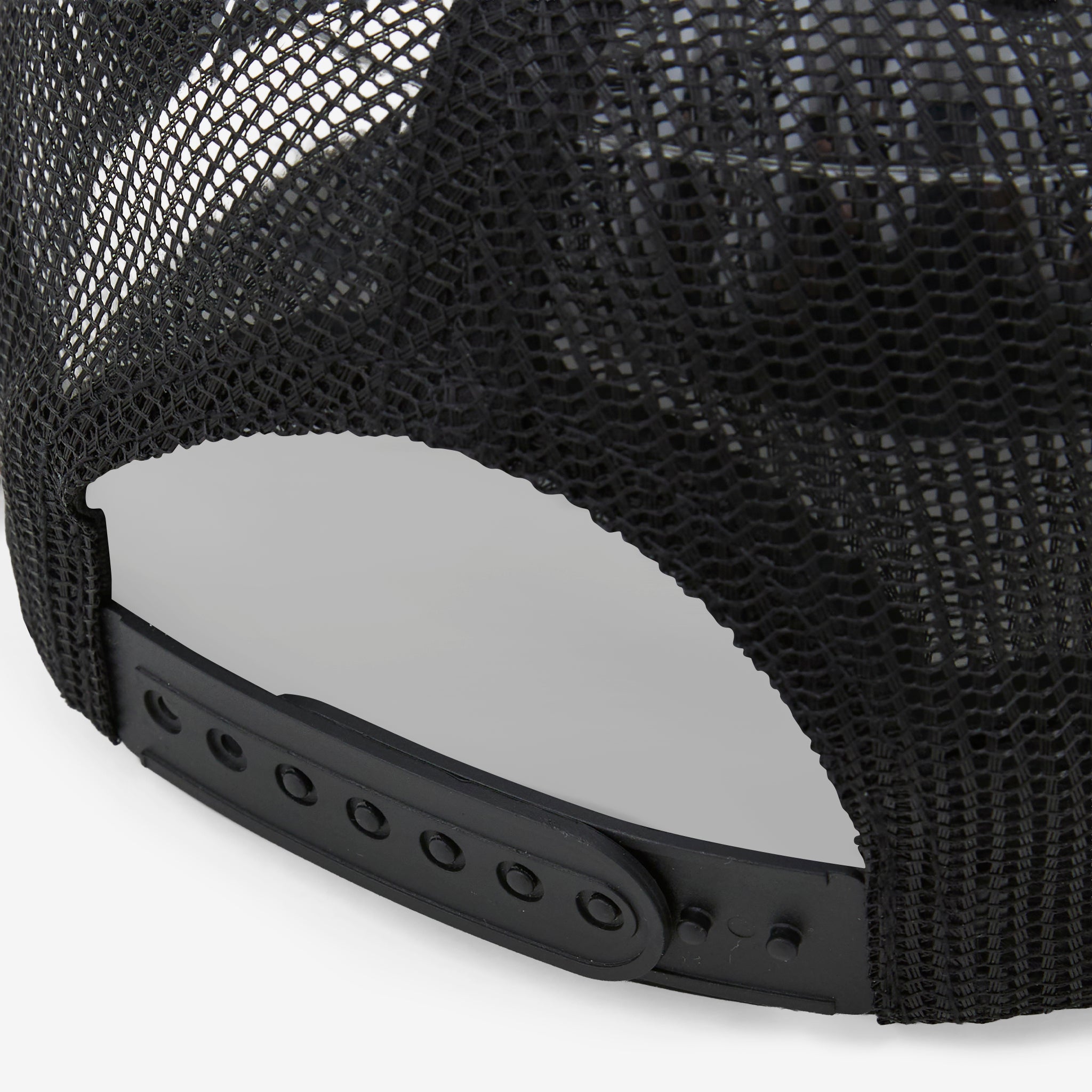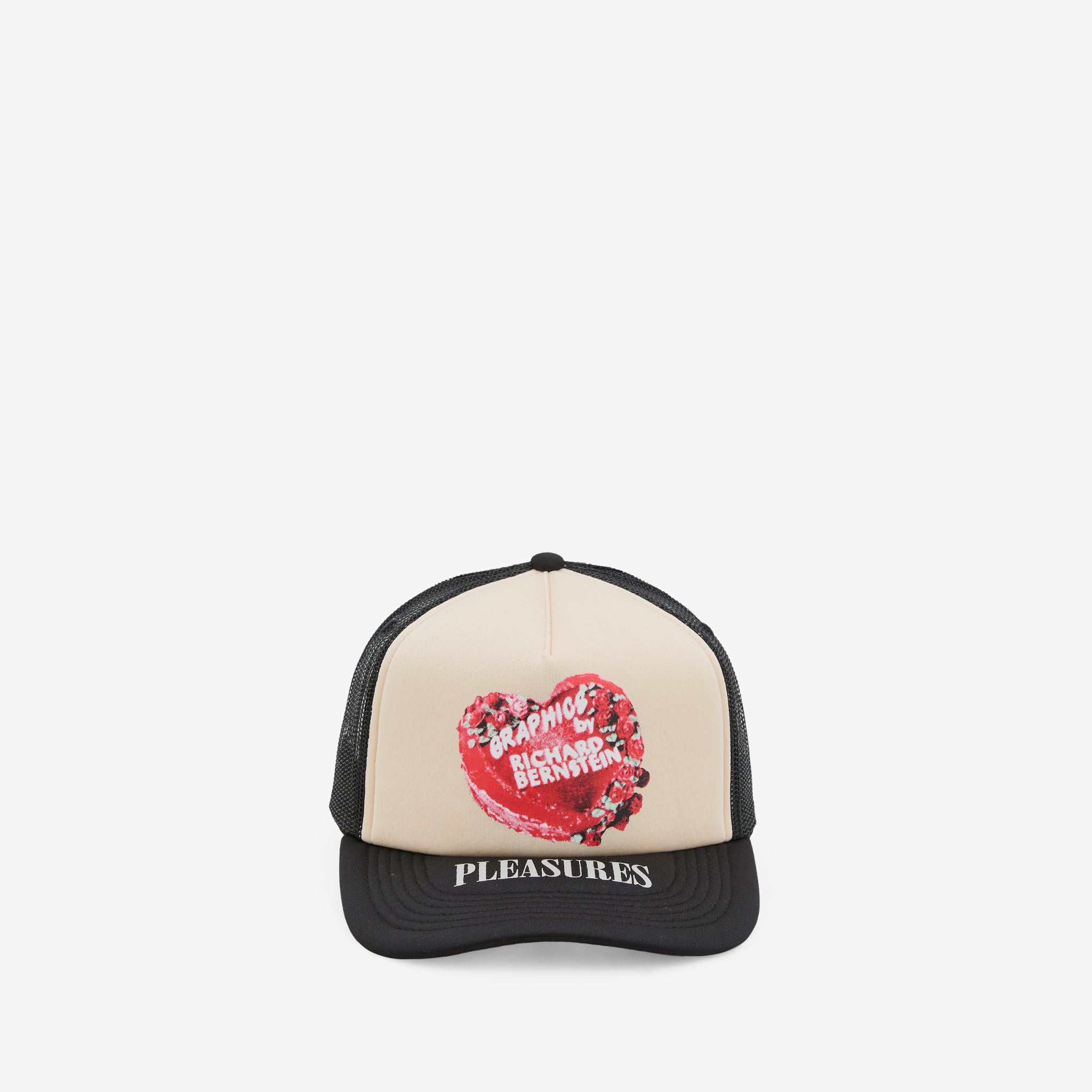 Cake Trucker Hat in Black from PLEASURES. 5-panel trucker hat with breathable mesh back panels and snap-back closure. Crafted from 12oz cotton canvas and finished with printed branding at the front panel and brim.
