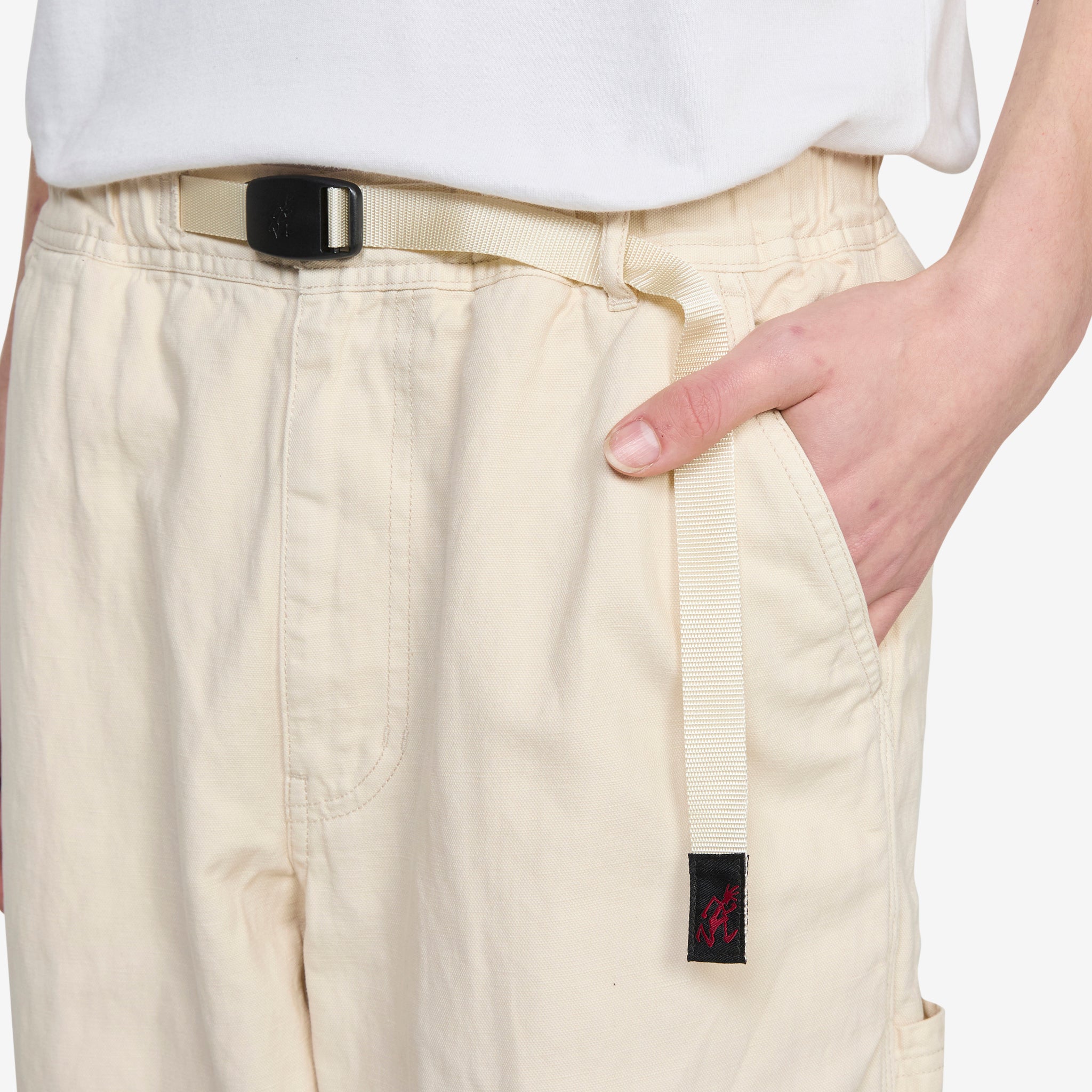 Canvas Work Pant in Bone from Gramicci. Relaxed fit painter-style pants featuring an elasticated waistband with an integrated belt, slightly tapered leg and 4-pocket construction. Crafted from a durable 9oz cotton and hemp blend. Finished with painter-style pockets at the thighs.