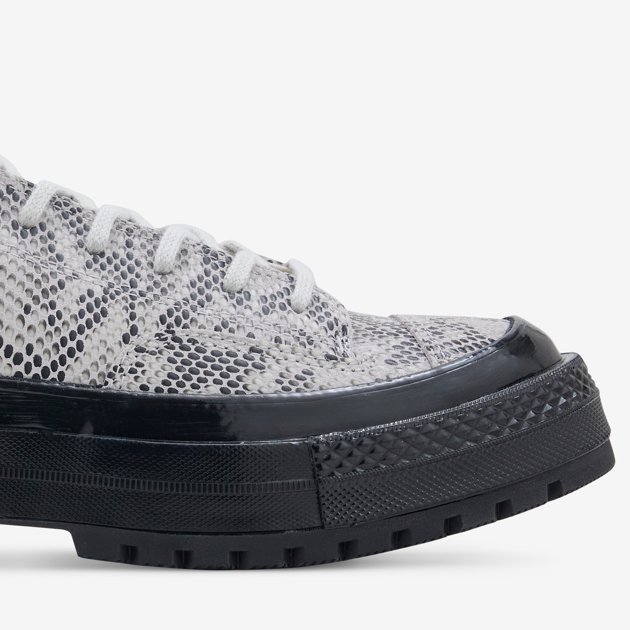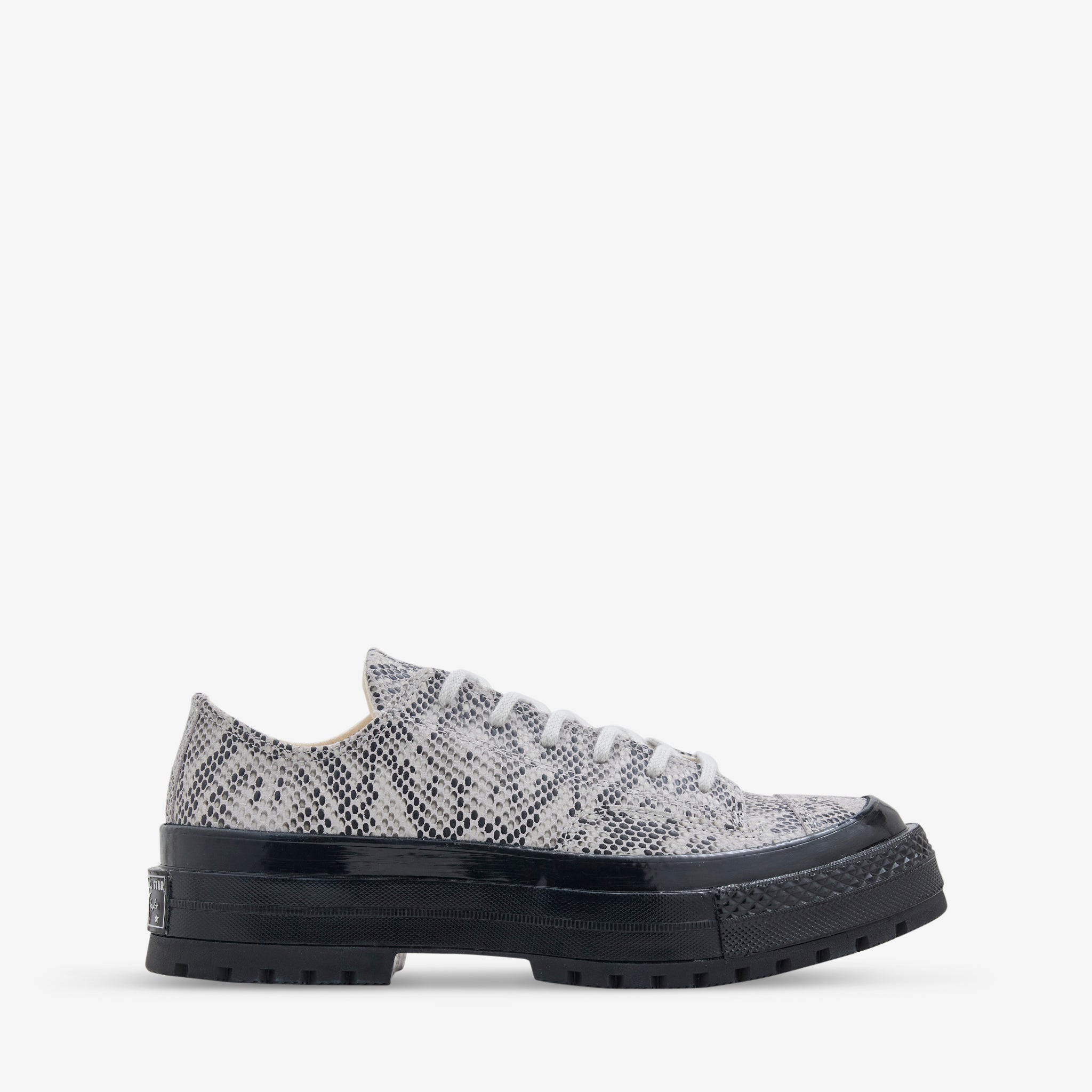 Men's Chuck '70 Formal Suede Snake Print Low in Barely Grey and Black from Converse. Luxe snake print suede upper with a traction-ready lugged sole. CX cushioning offers next-level comfort while the mid-foot shank provides durable stability. Finished with iconic All Star license plate branding.