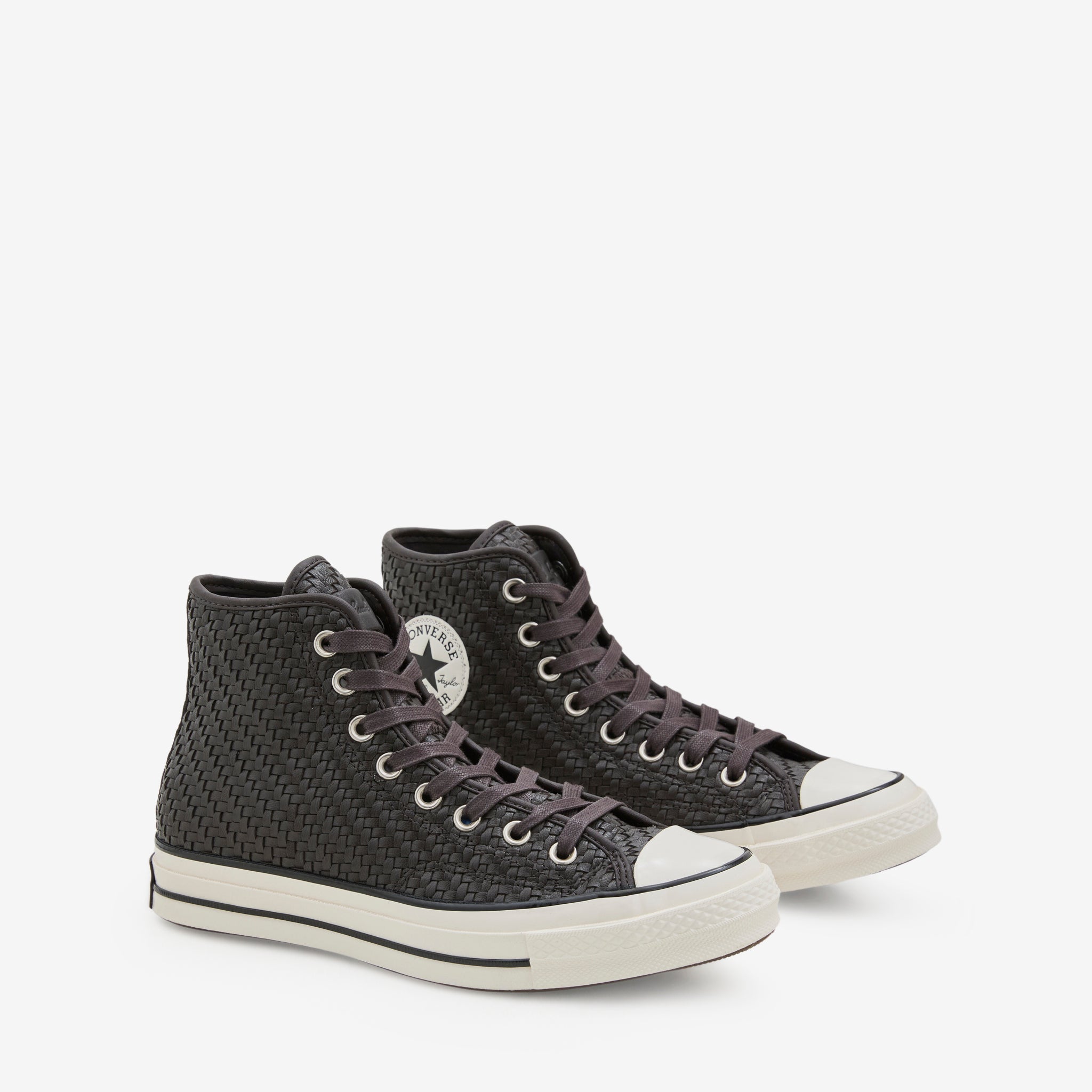 Unisex Chuck '70 Hi in Mudguard, Egret and Black from Converse. Premium woven leather upper features a varnished off-white toe cap and midsole, tonal lace closure and a leather brand patch at the tongue. OrthoLite cushioning adds all-day comfort. Finished with a signature leather Chuck Taylor ankle patch and All Star license plate.