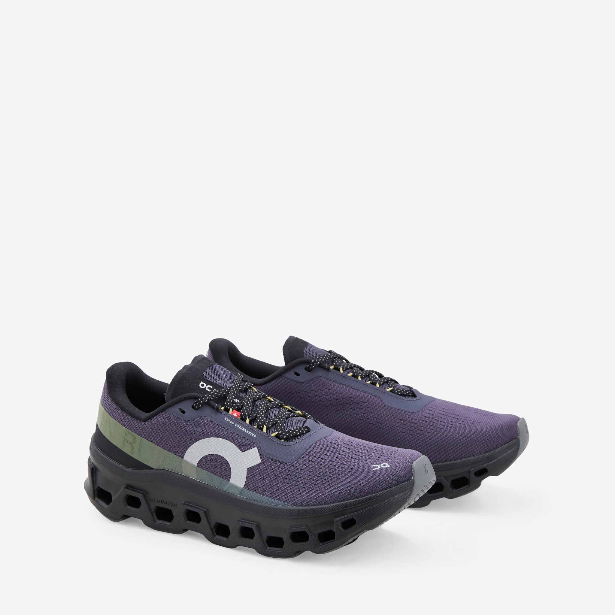 Men's Cloudmonster 1 in Flint and Black from On. A reimagined version of the classic Cloudmonster, reimagined for everyday style and comfort. Recycled polyester upper featured supportive TPU overlays and hidden eyelets for a clean aesthetic. CloudTec® cushioning system is engineered for all-day wear with a Speedboard® for added spring. Finished with Helion™ foam and a rubber outsole for impact absorption and traction.