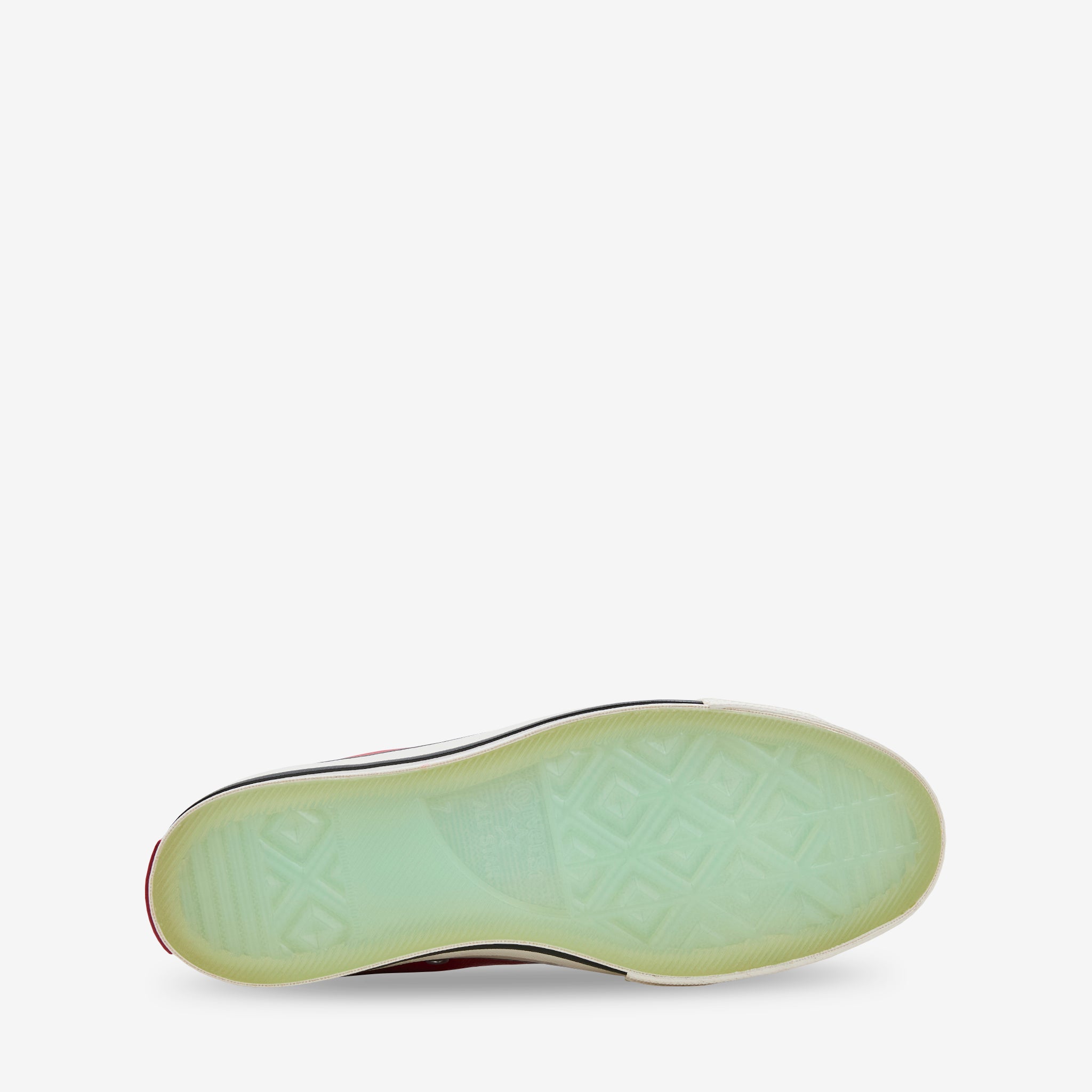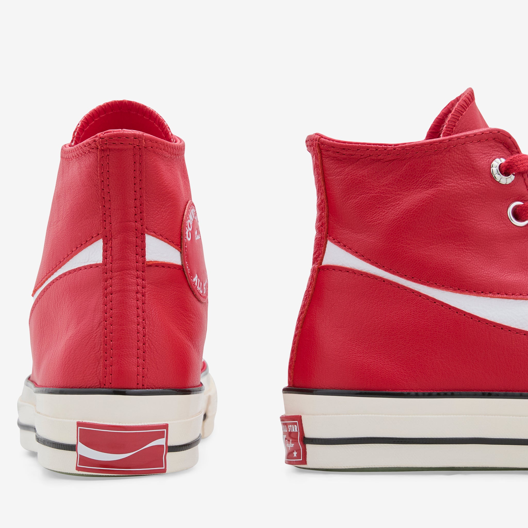 Coca Cola collaborates with x Converse on the Chuck 70' Hi in Racing Red, Egret and Black. Premium leather upper with contrast accents and bottle-cap eyelets. OrthoLite cushioning provides optimal comfort while the Georgia Green rubber outsole offers vintage-style traction. Finished with collaborative branding details throughout.