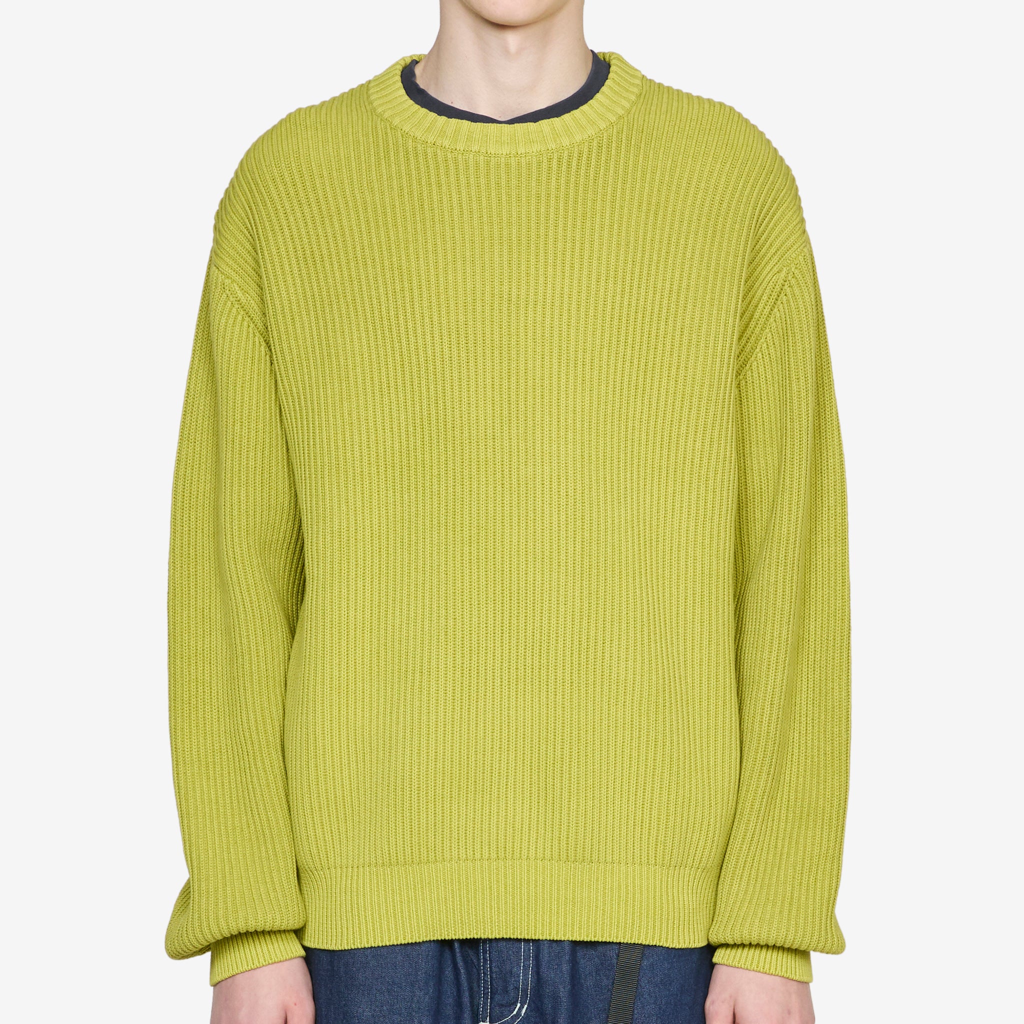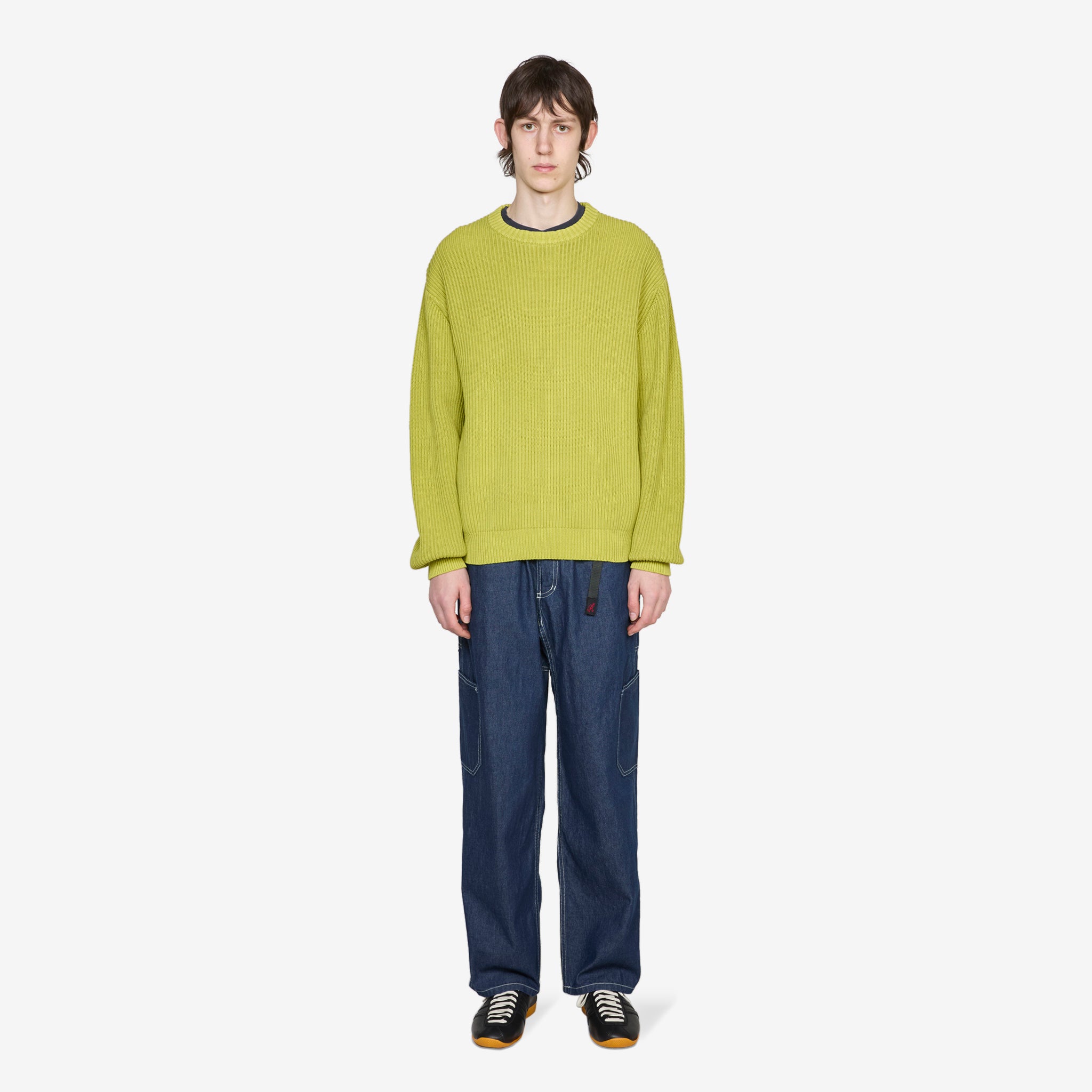 Cotton Knit Sweater in Mist Green from Gramicci. Relaxed fit sweater with a crew neckline, dropped shoulders and ribbed trims. Crafted from a mid-weight textured cotton knit which has been garment dyed for a vintage look. Finished with a woven brand label at the side seam.