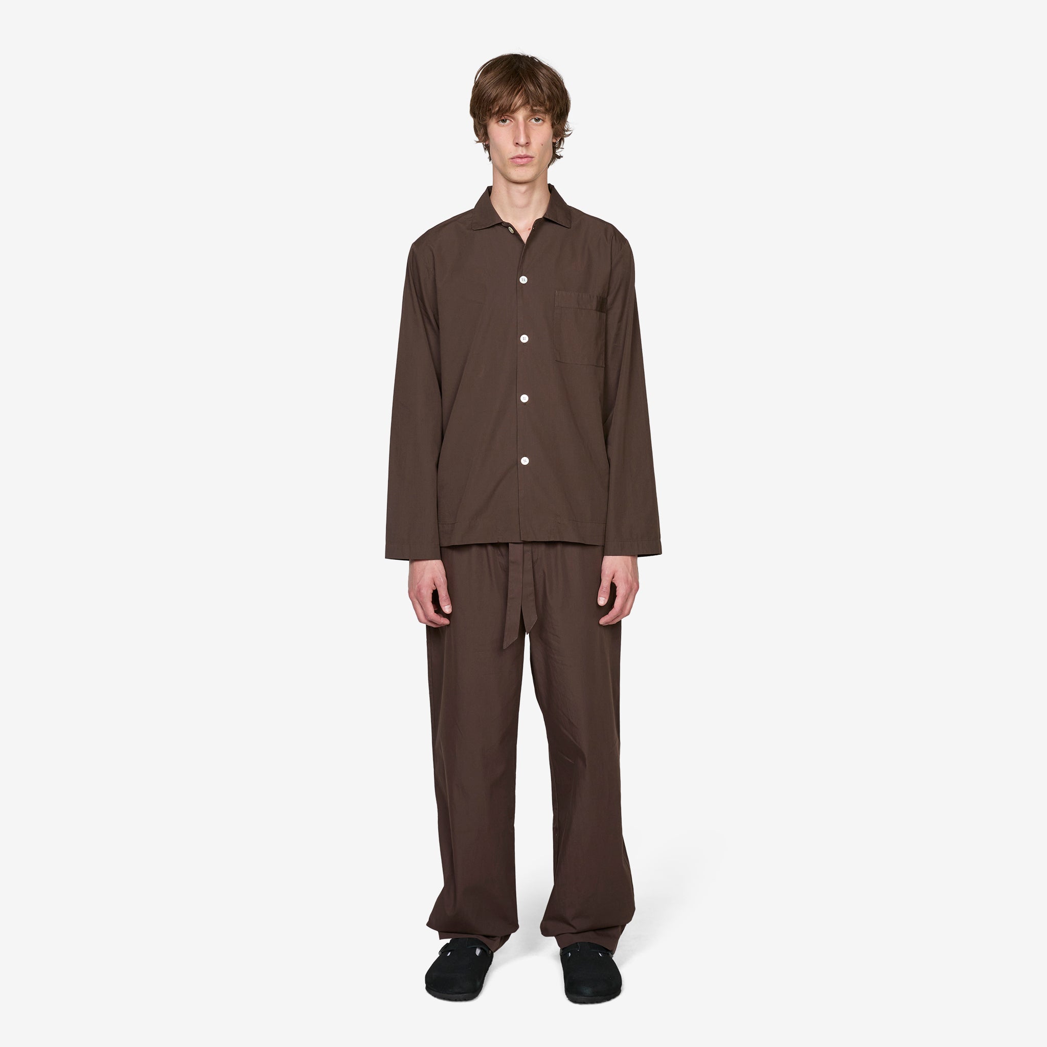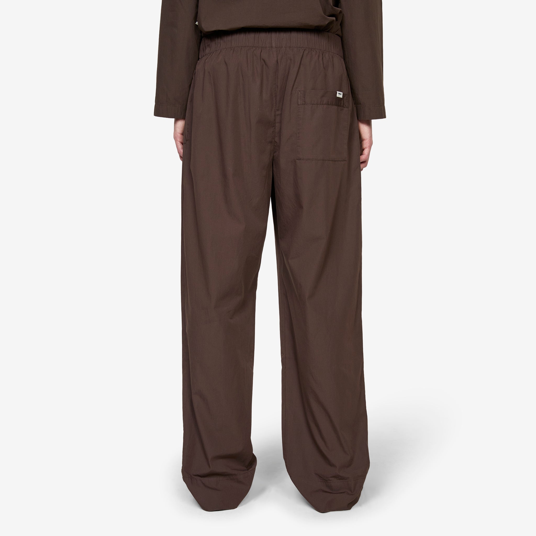 Cotton Poplin Pyjama Pants in Coffee from Tekla. Relaxed, straight leg pants with an elasticated drawstring waistband, button fly and inseam side pockets. Crafted from tightly woven, crisp organic cotton poplin which has been stone-washed for a smooth and soft hand feel. Finished with french seam construction and rear patch pockets with a woven brand patch.