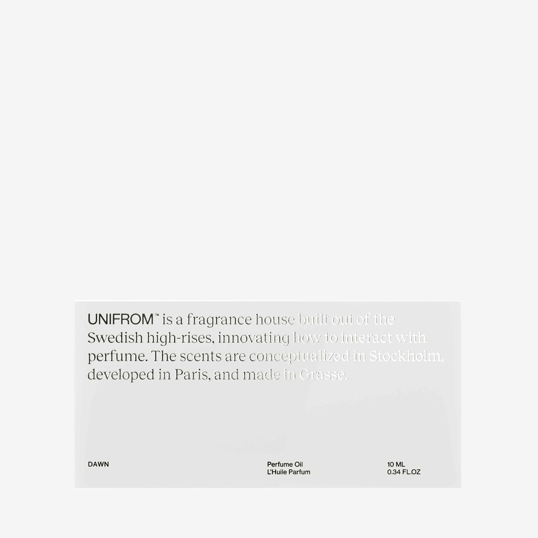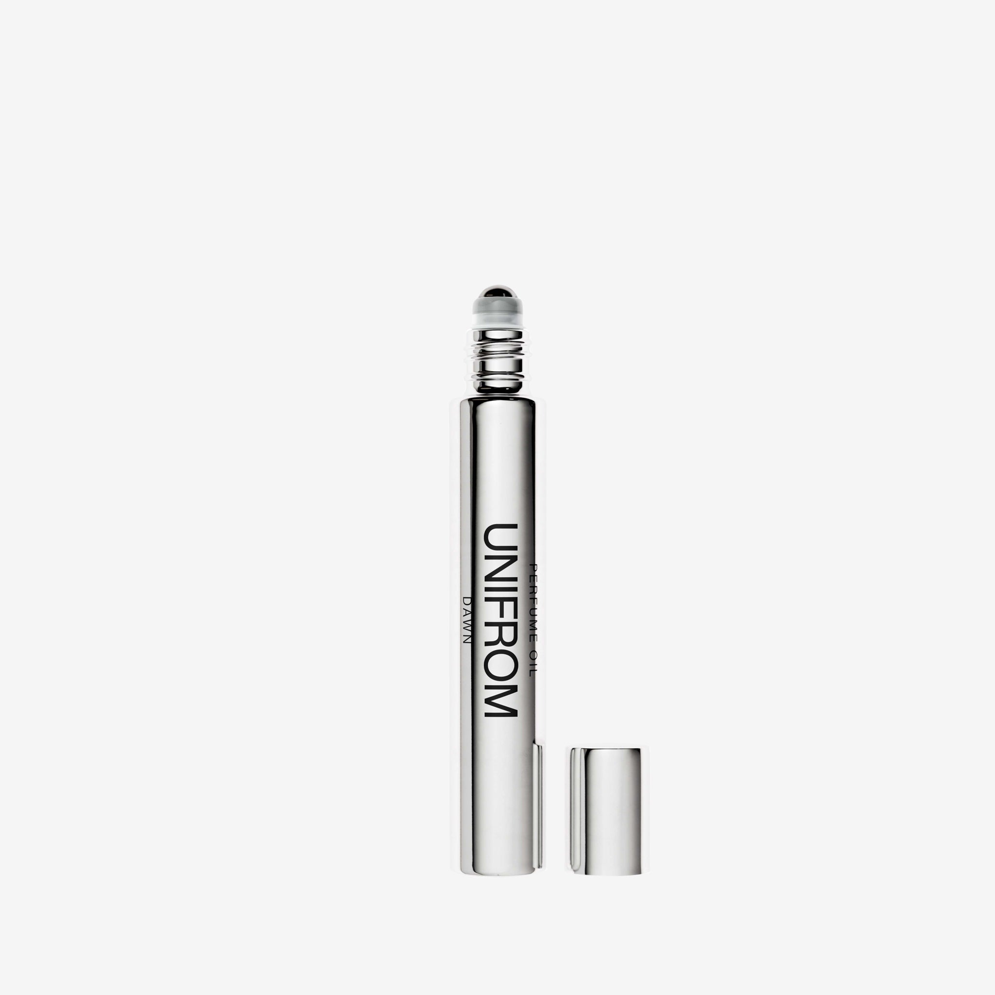 Dawn Perfume Oil from Unifrom. Roll-on fragrance oil that encapsulates the ceremonious ritual of tea in a fragrance. Top notes of Cinnamon. Heart notes of Sichuan Pepper, Maté and Sugar. Base notes of Cedarwood and White Musk.