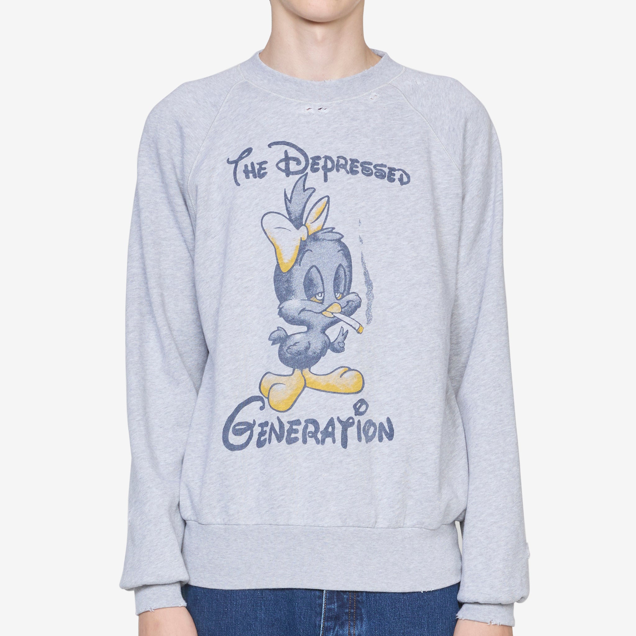 Destroyed Weedie Pie Raglan Sweat in Light Grey Marl from Aries. Relaxed fit sweatshirt with a crew neckline, raglan sleeves and ribbed trims. Crafted from a brushed-back cotton jersey fleece with distressing throughout for an aged effect. Finished with an aged screenprint across the front.