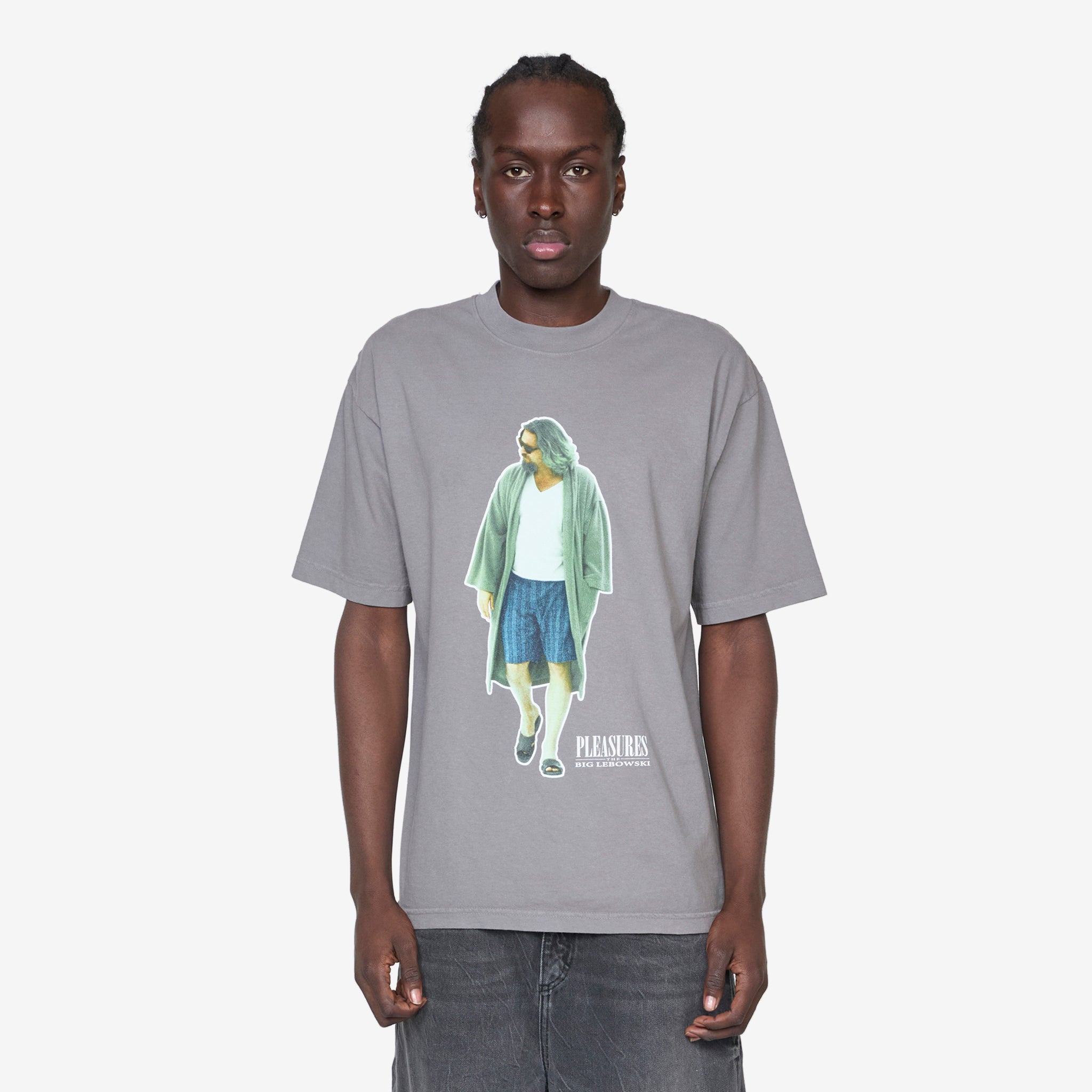Dude T-Shirt in Charcoal PLEASURES. Relaxed fit t-shirt with a ribbed crew neckline. Crafted from a heavyweight cotton in a garment-dyed treatment. Finished with a printed graphic and branding across the front.