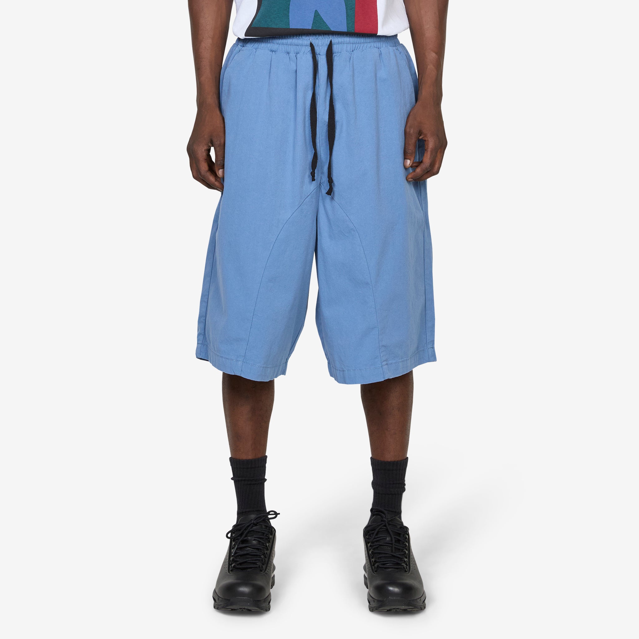 Elasticated Cotton Shorts in Pond from Pseushi. Relaxed, balloon-cut shorts with a contrast drawstring waistband and a rounded crotch panel construction. Crafted from OEKO-TEX® organic cotton twill, plain weave 240gsm and has been garment-washed for a pre-shrunk vintage texture. Finished with two side pockets and a single rear patch pocket.