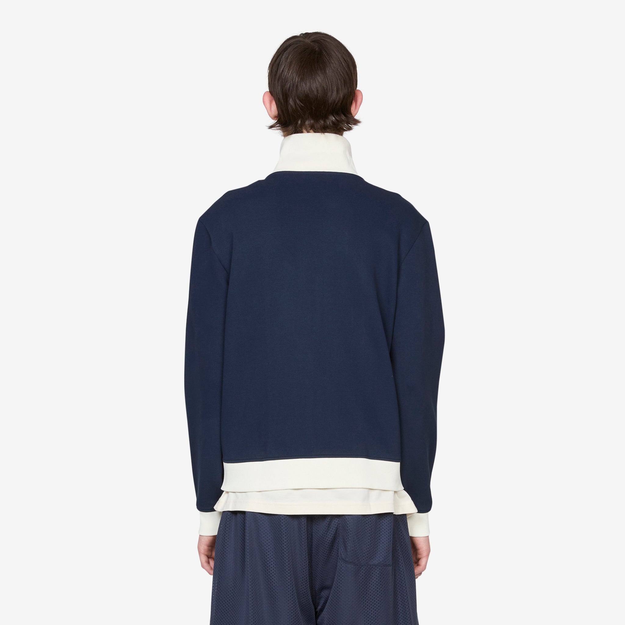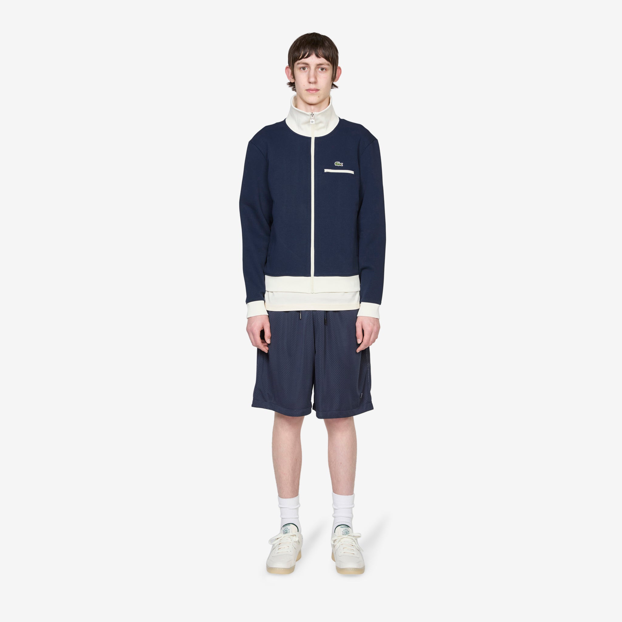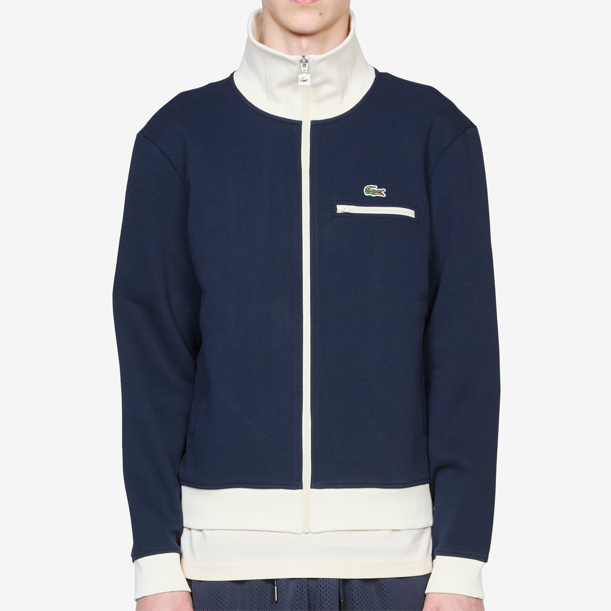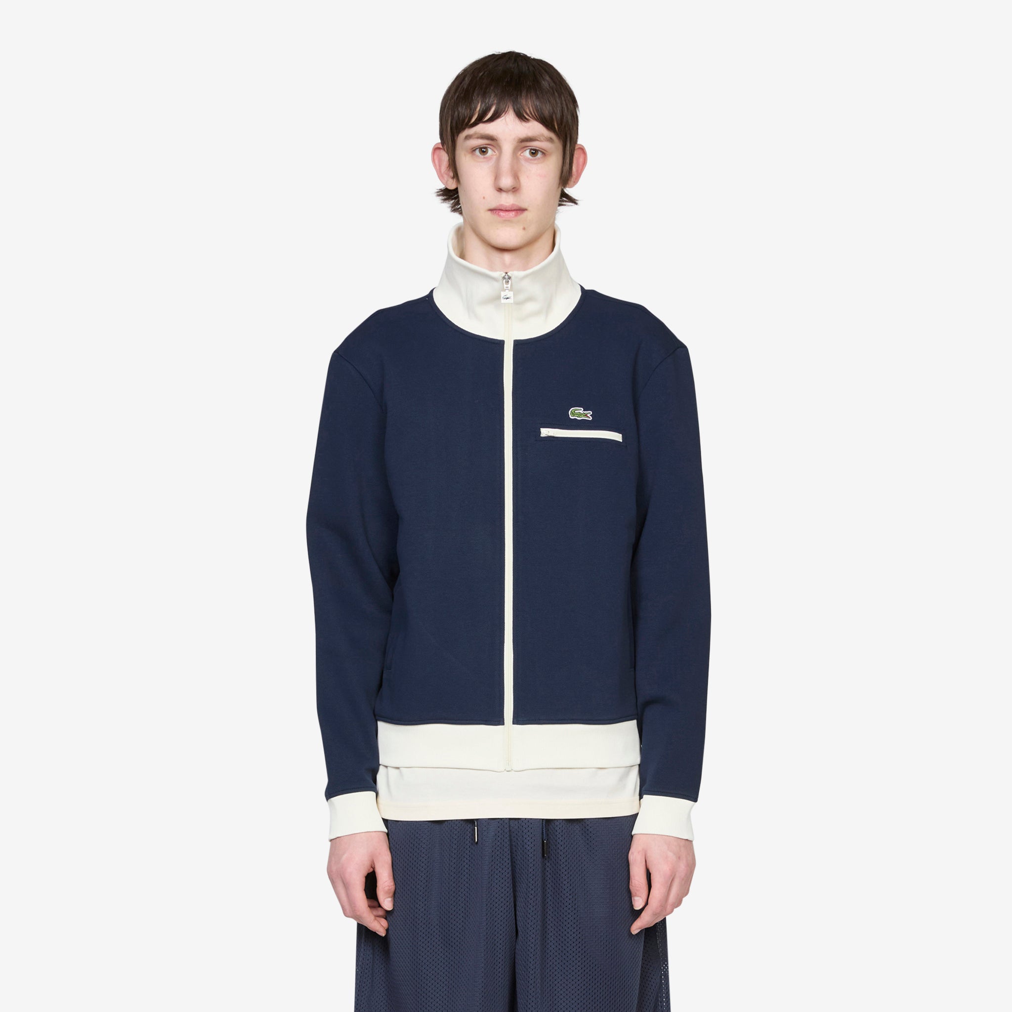 Elevated Pique Track Jacket in Navy and Crystal from Lacoste. Regular fit jacket crafted from a cotton blend. Featuring contrast details and chest and side pockets. Finished with crocodile embroidery on chest.