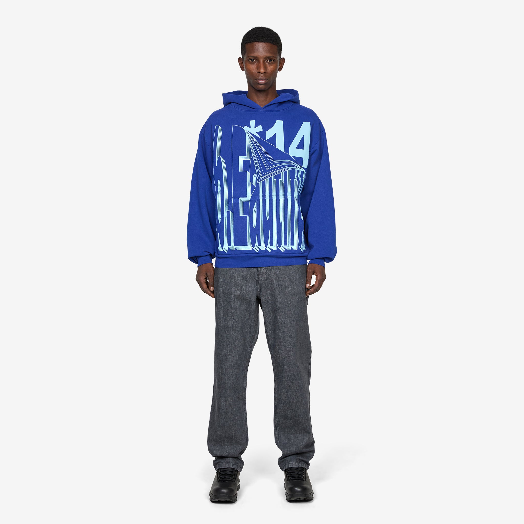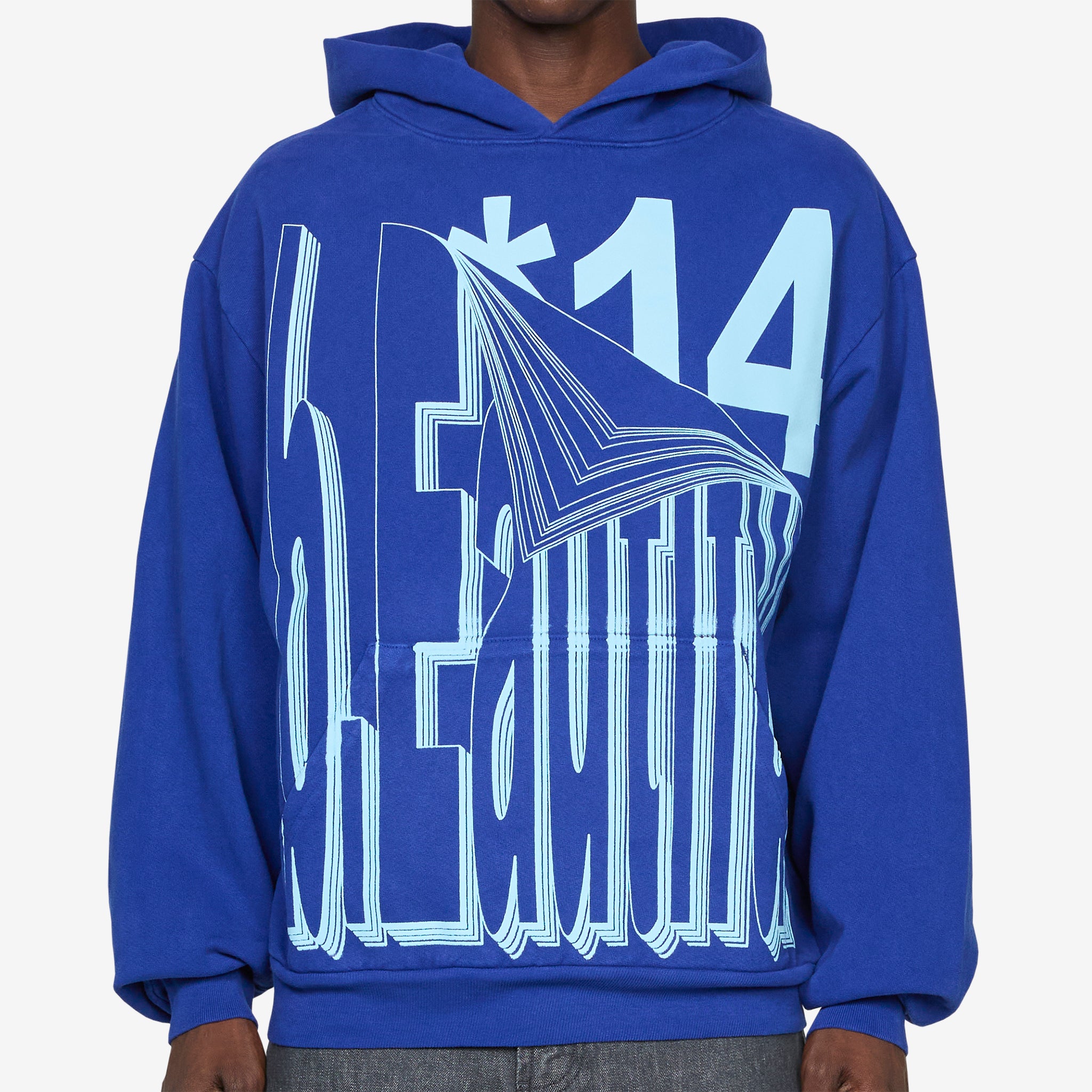 Flip Hoodie in Cobalt Blue from b.Eautiful. Relaxed fit hoodie with a kangaroo pocket, ribbed hem and cuffs. Crafted from 14oz garment-dyed cotton and finished with a printed graphic across the front.