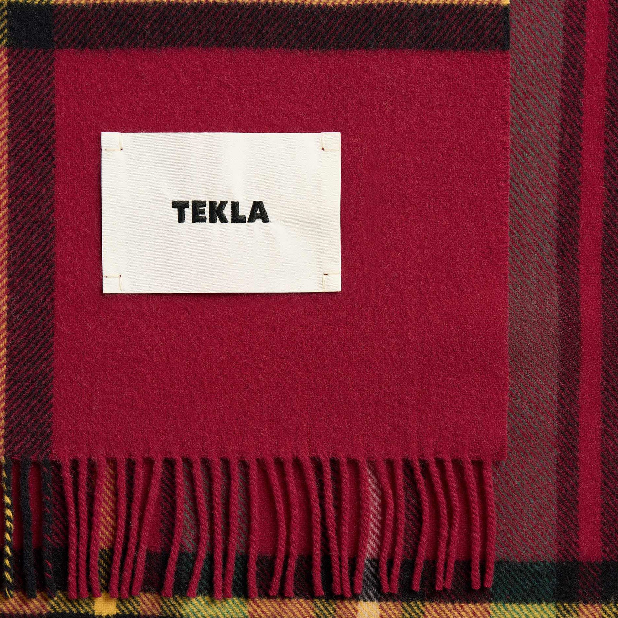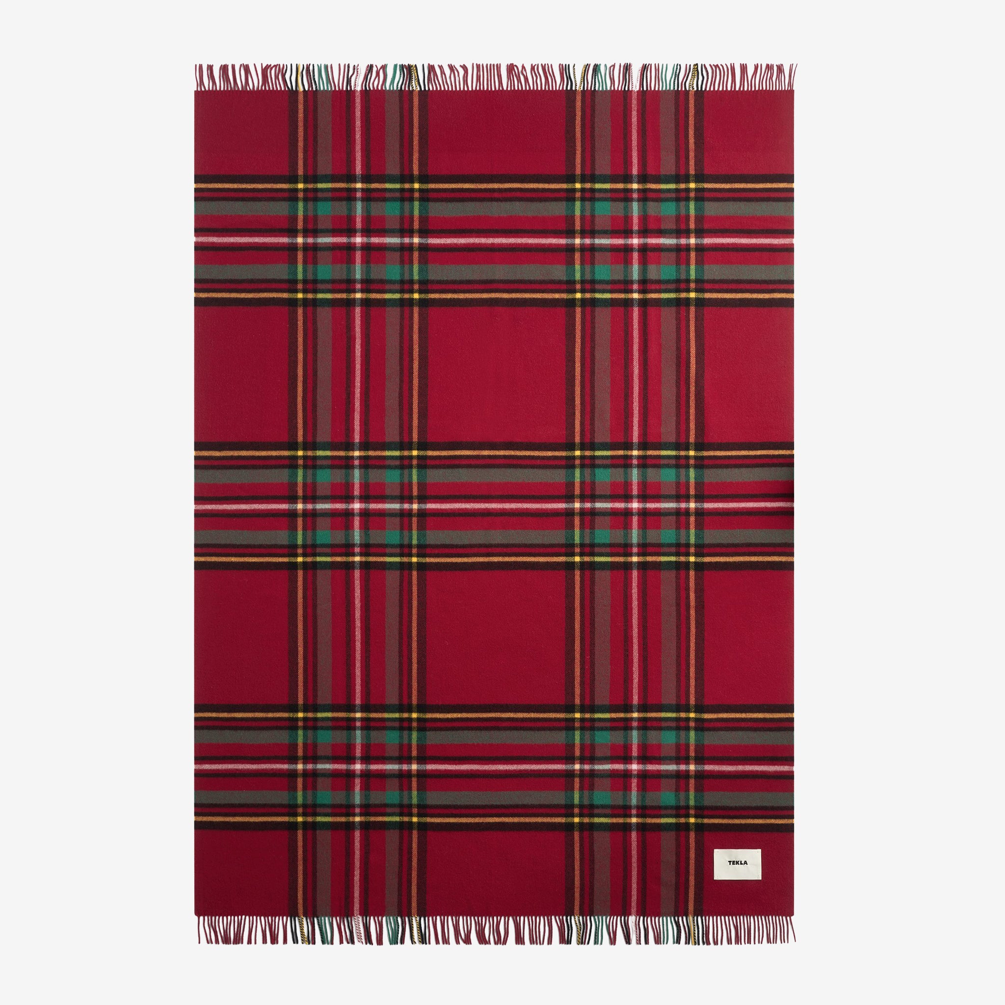 Fringed Lambswool Blanket in Red Plaid from Tekla. Designed to perfectly balance lightness and durability. Crafted from a blend of lightly brushed, responsibly sourced blend of virgin and recycled lambswool in a red plaid. Finished with fringed edges and a woven brand label.