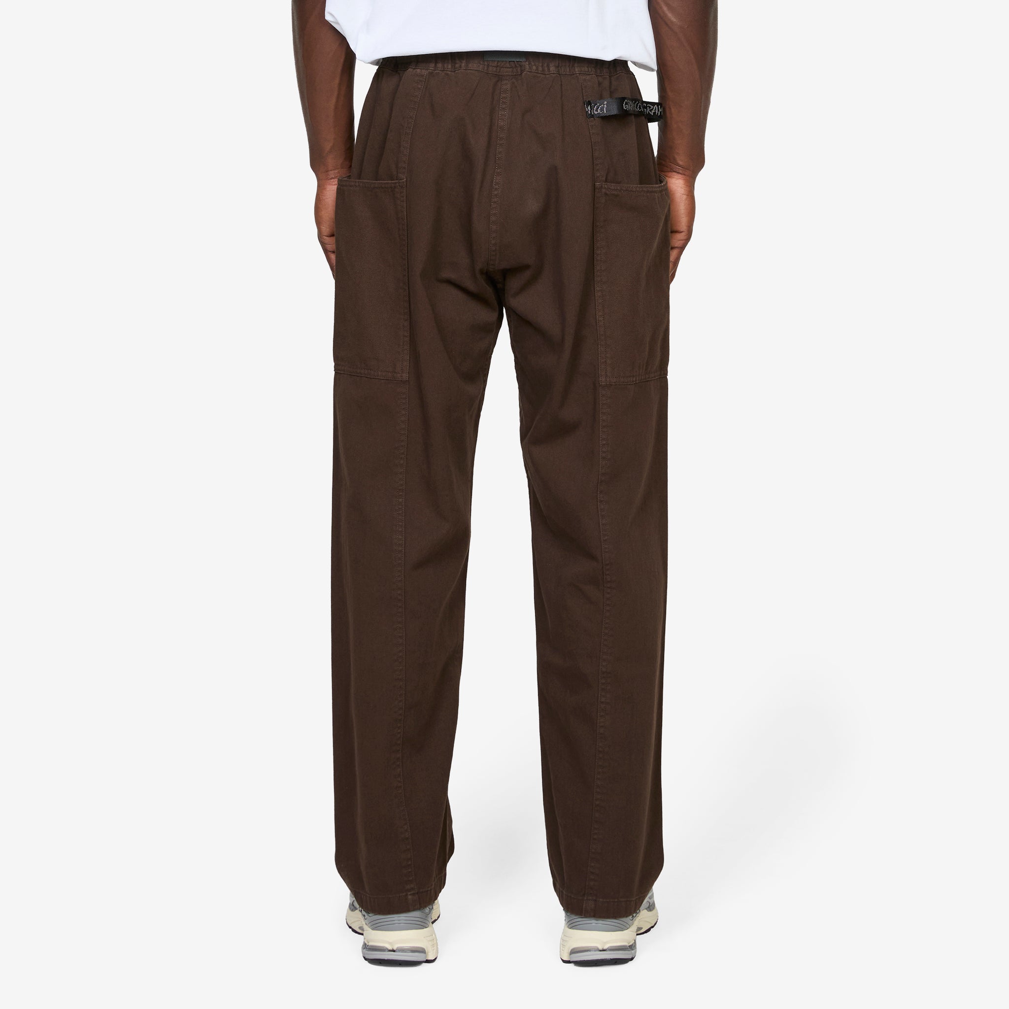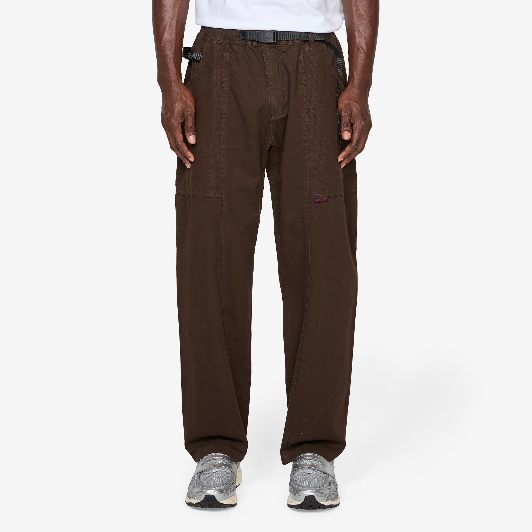Gadget Pant in Chocolate from Gramicci. Low rise, tapered fit pants with a diamond-shaped crotch gusset and elasticated waistband with an integrated belt. Crafted from a durable organic cotton twill with canvas used for the pockets. Finished with two large pockets extending from the front to the back.