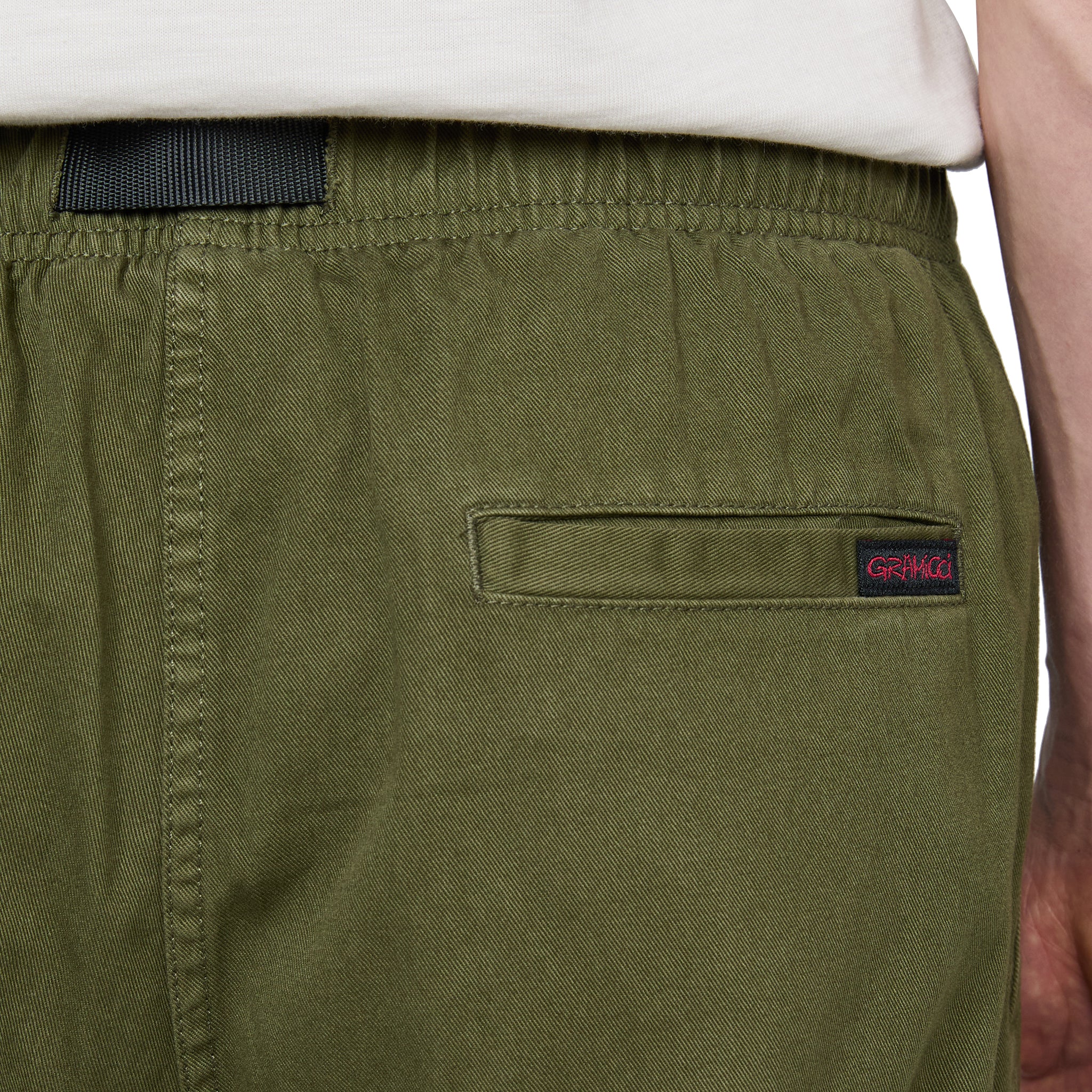 Gramicci Pant in Olive from Gramicci. Relaxed fit pants with a gusset crotch for ease of movement and an elasticised waistband with an integrated belt. Crafted from organic cotton twill for durability. Four-pocket construction with side seam pockets and welt pockets with velcro closure on the back.