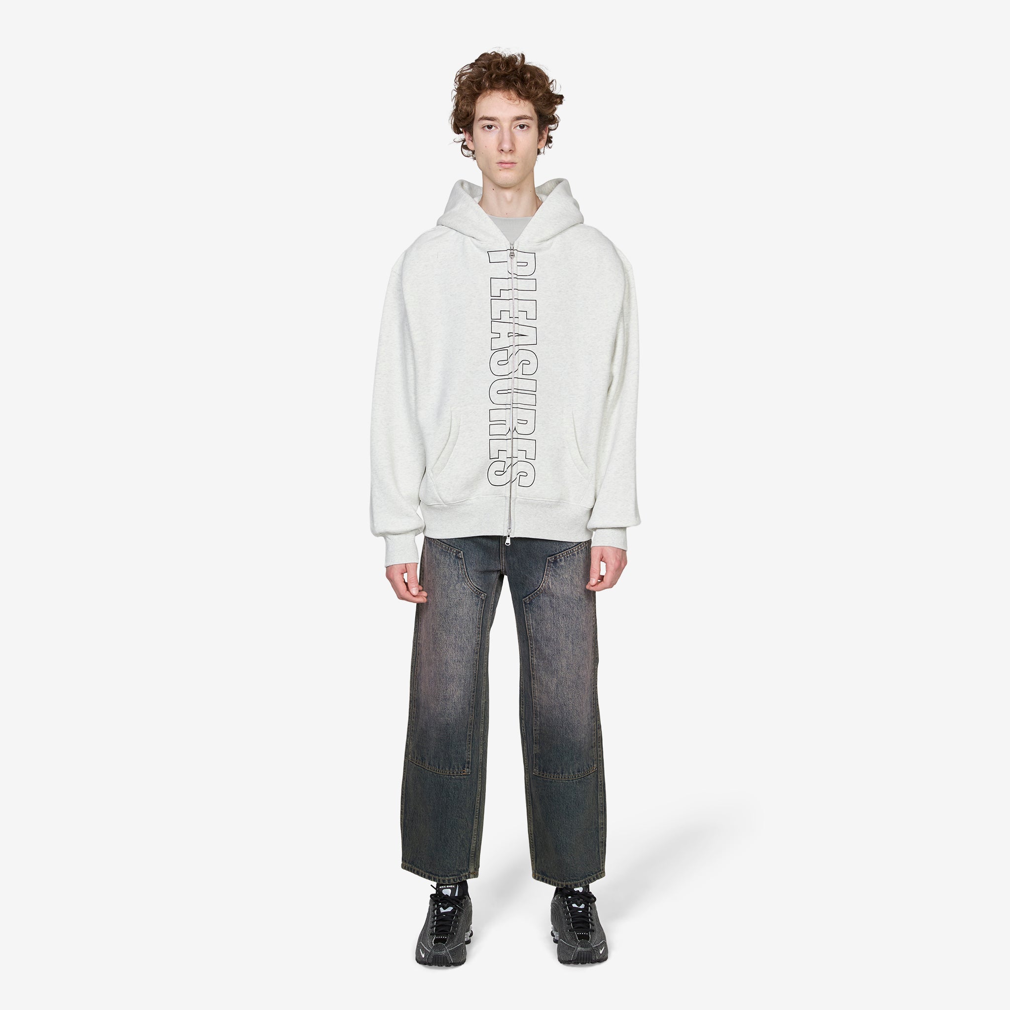 Impact Zip Hoodie in Oatmeal from PLEASURES. Relaxed, boxy fit hoodie with two-way zip closure, kangaroo pockets and ribbed trims. Crafted from a 380gsm cotton blend fleece and finished with printed branding down the front zip closure.