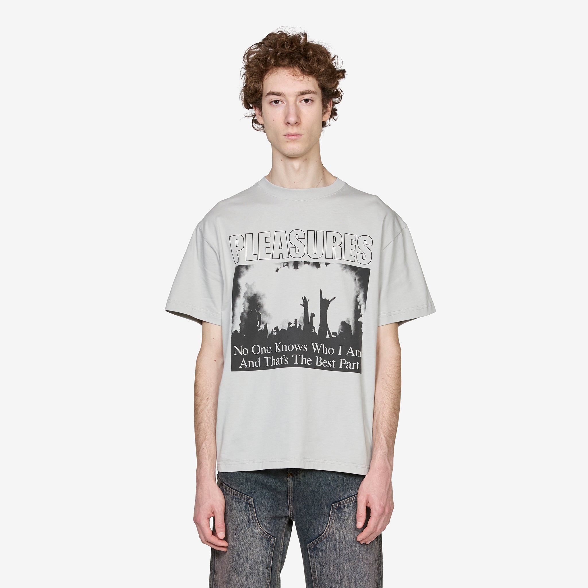 Incognito T-Shirt in Silver from PLEASURES. Relaxed fit t-shirt with a ribbed crew neckline. Crafted from cotton and finished with printed branding across the front.