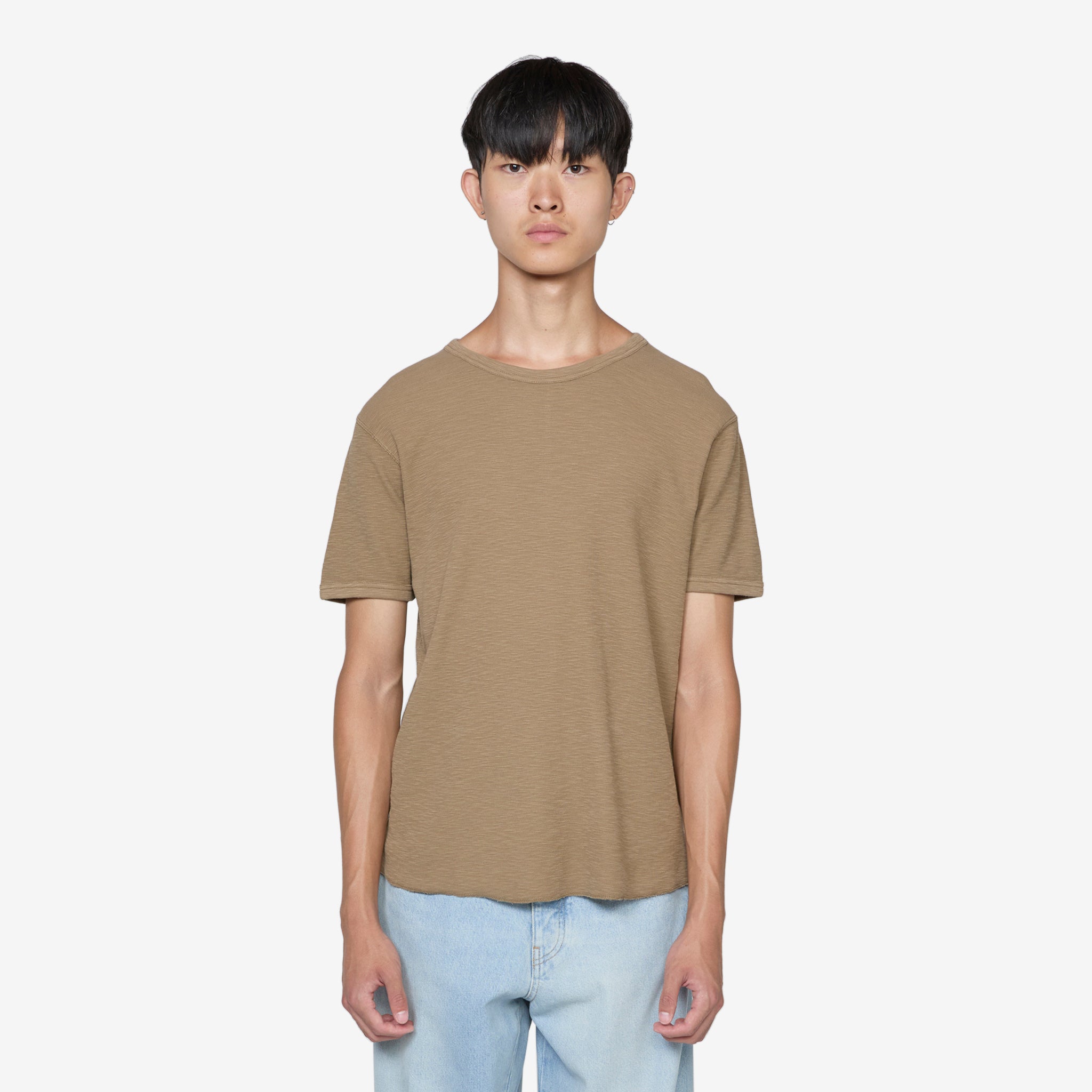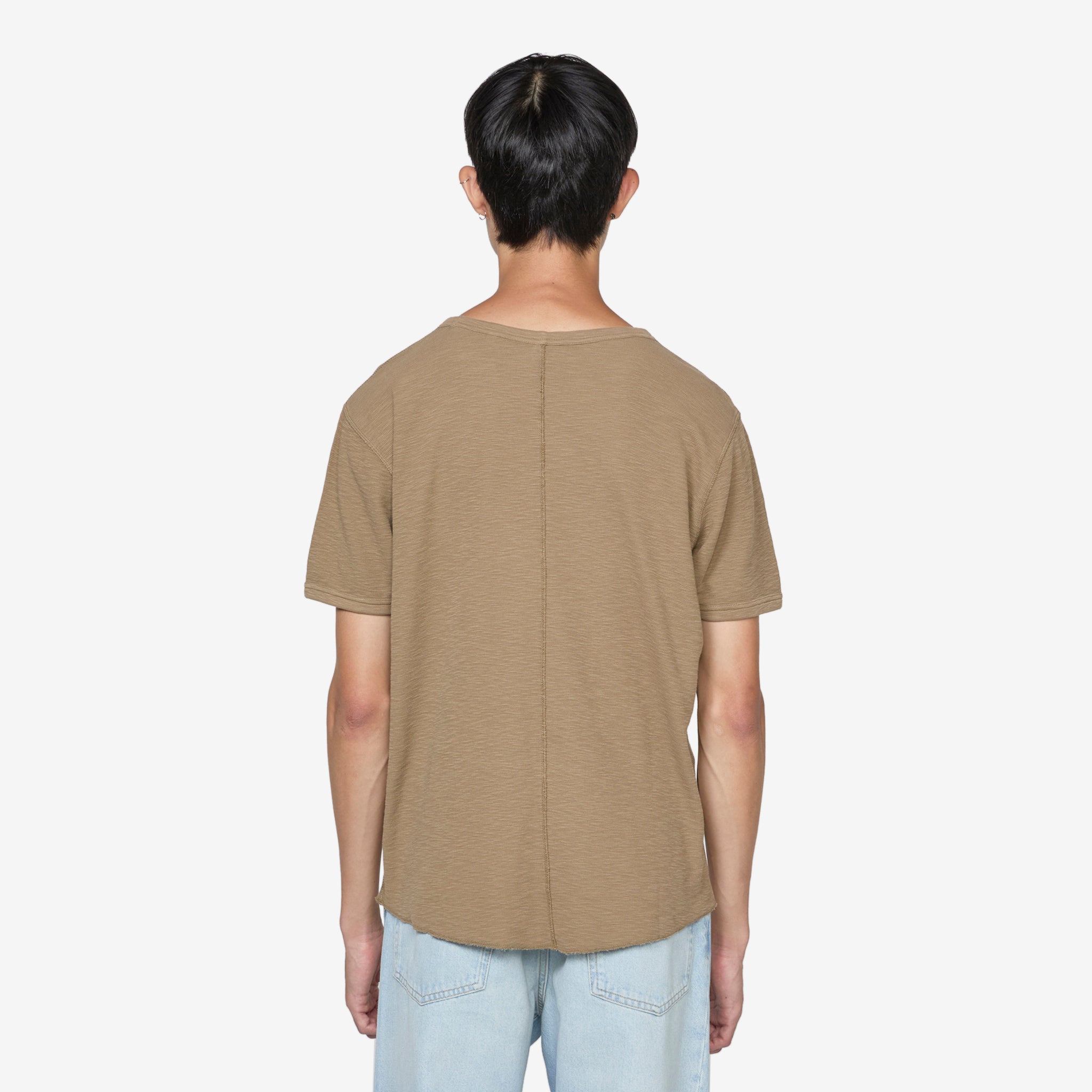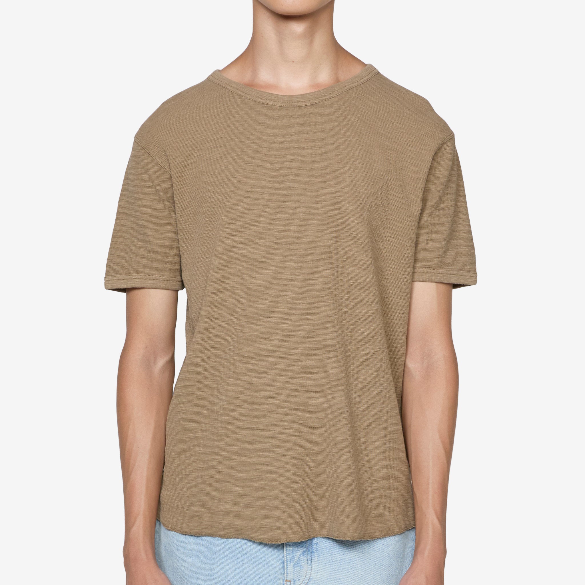 Jagger Waffle T-Shirt in Khaki from Sunflower. Ringer style t-shirt with a ribbed crew neckline and sleeves. Crafted from organic cotton jersey in a micro waffle structure with slub yarn. Finished with flatlock repair stitching across the back.