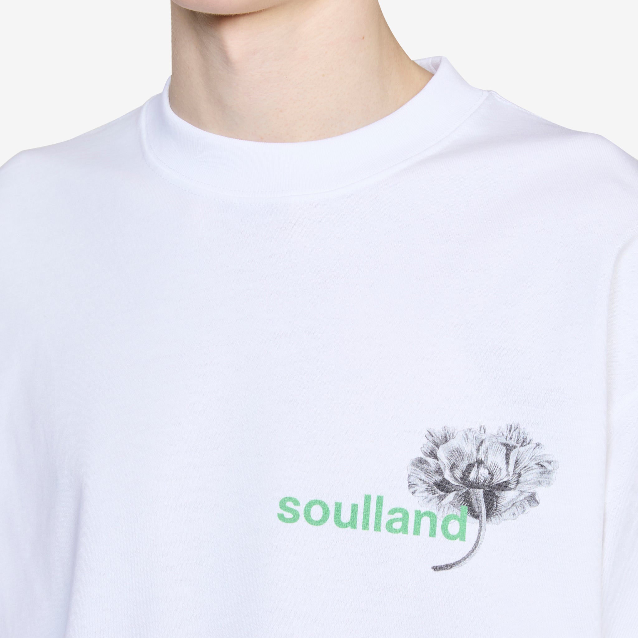 Kai Adventure Awaits T-Shirt in White from Soulland. Relaxed fit t-shirt with a ribbed crew neckline and twin needle stitching at the seams. Crafted from 260gsm heavy single jersey organic cotton. Finished with printed branding at the chest and back.