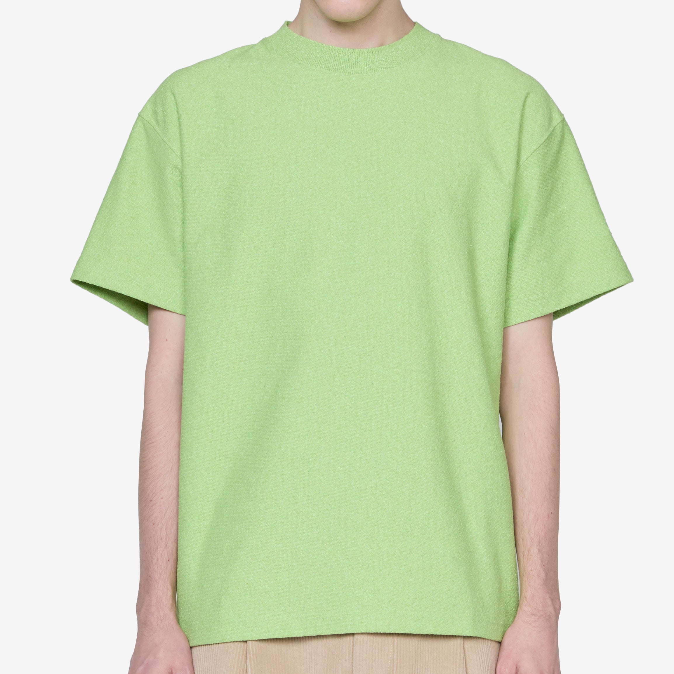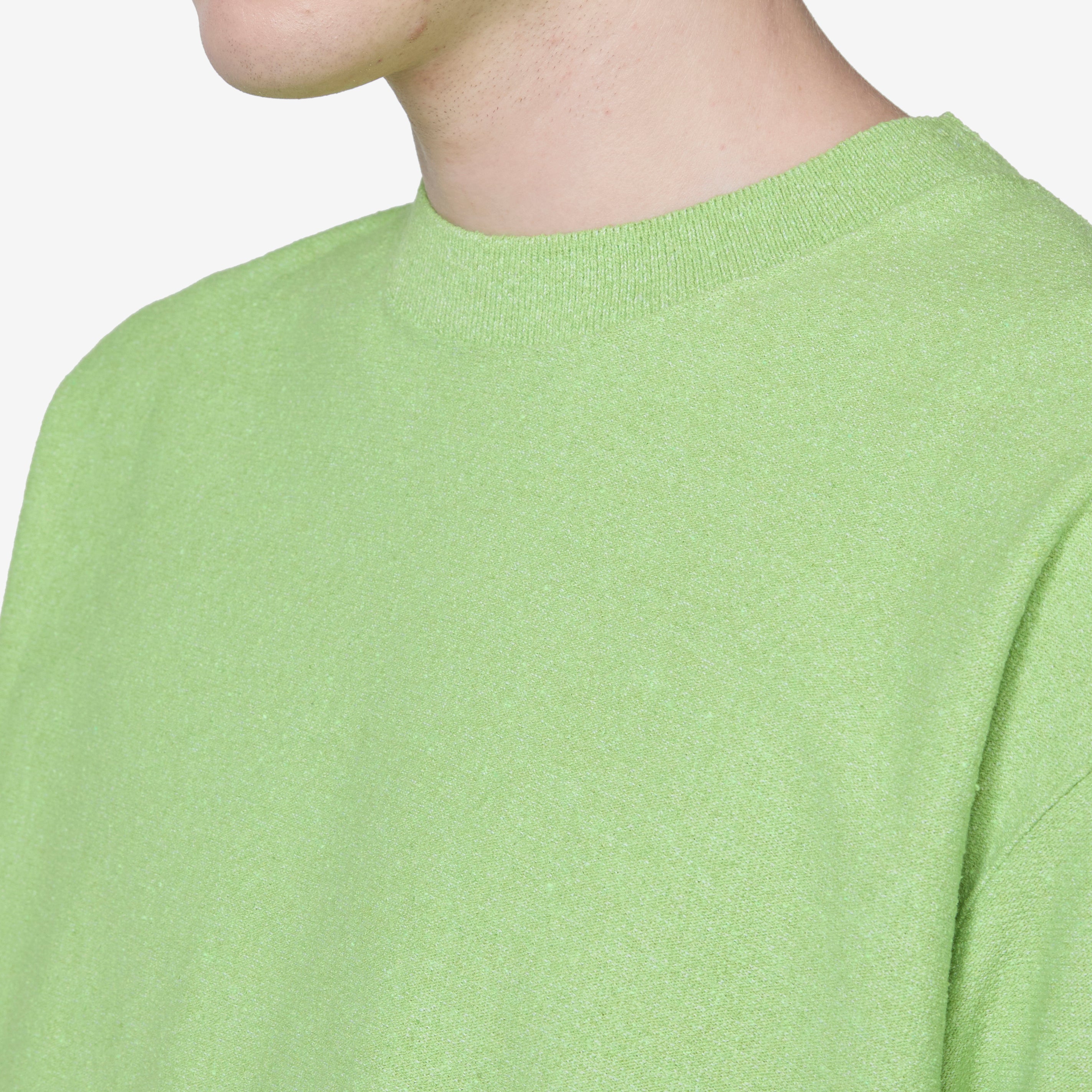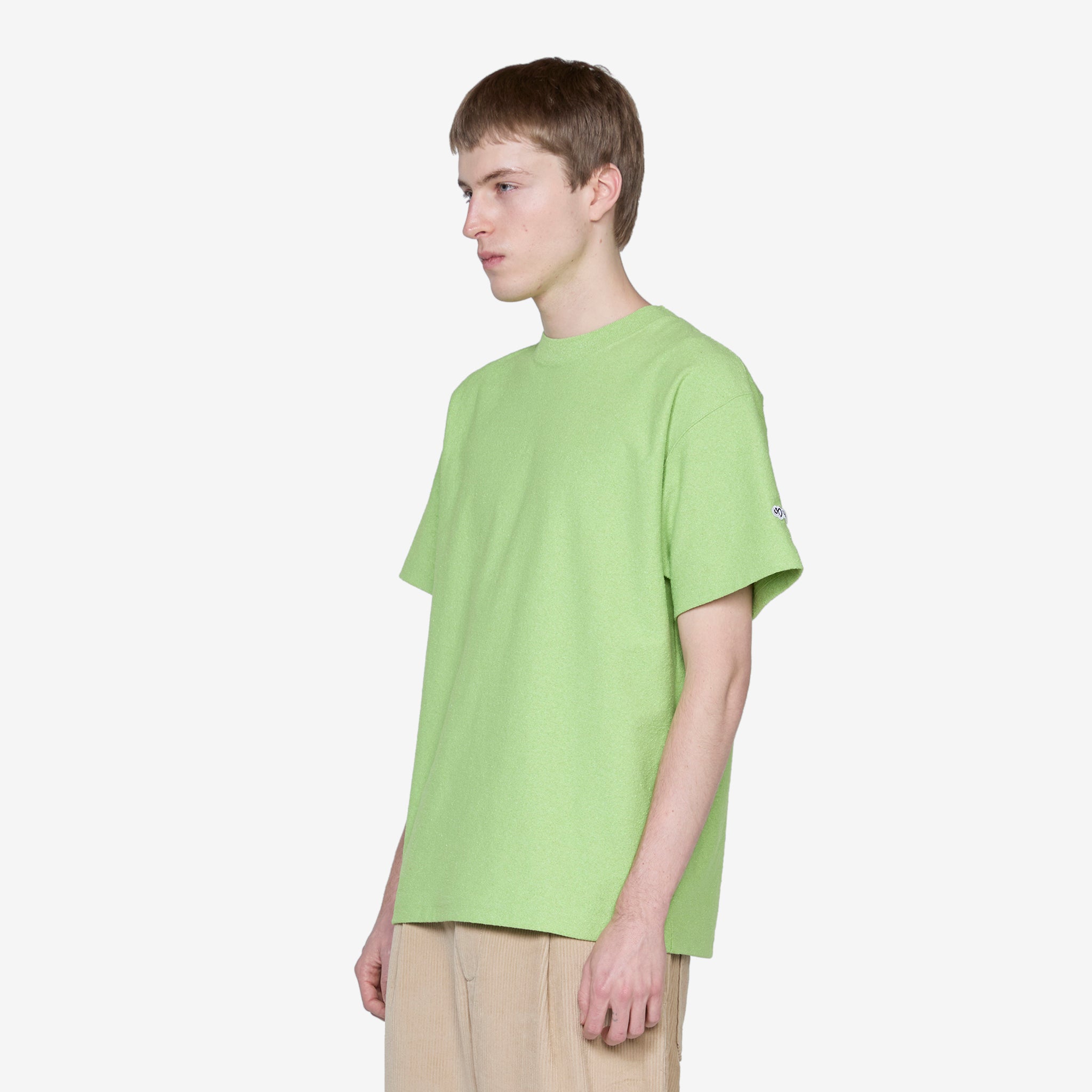 Men's Kai T-Shirt in Green from Soulland. Relaxed fit short sleeve t-shirt with a ribbed crew neckline. Crafted from Portuguese boucle jersey fabric with twin needle stitching at the armhole, neck, bottom and sleeve hems. Finished with a branded embroidered patch on the sleeve.