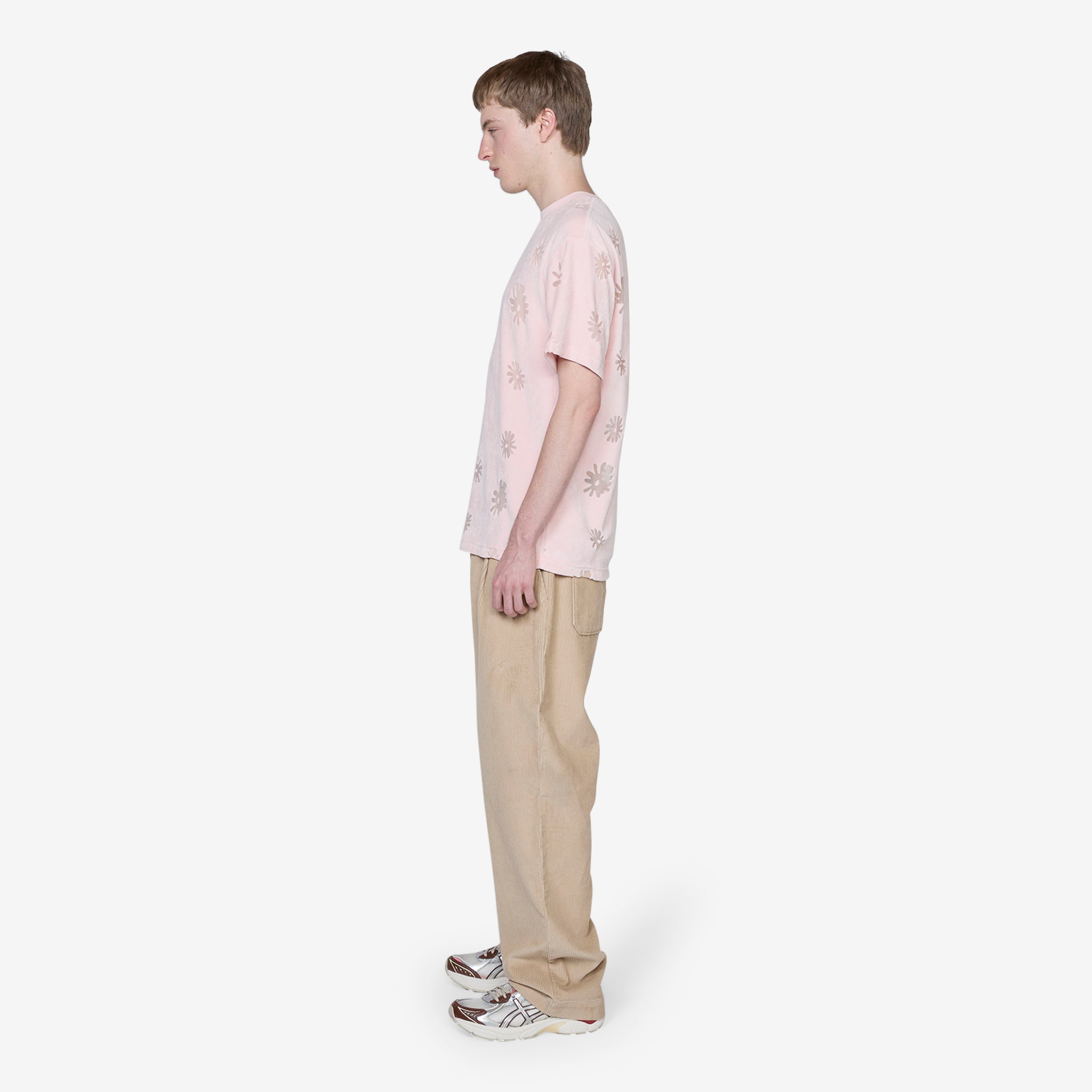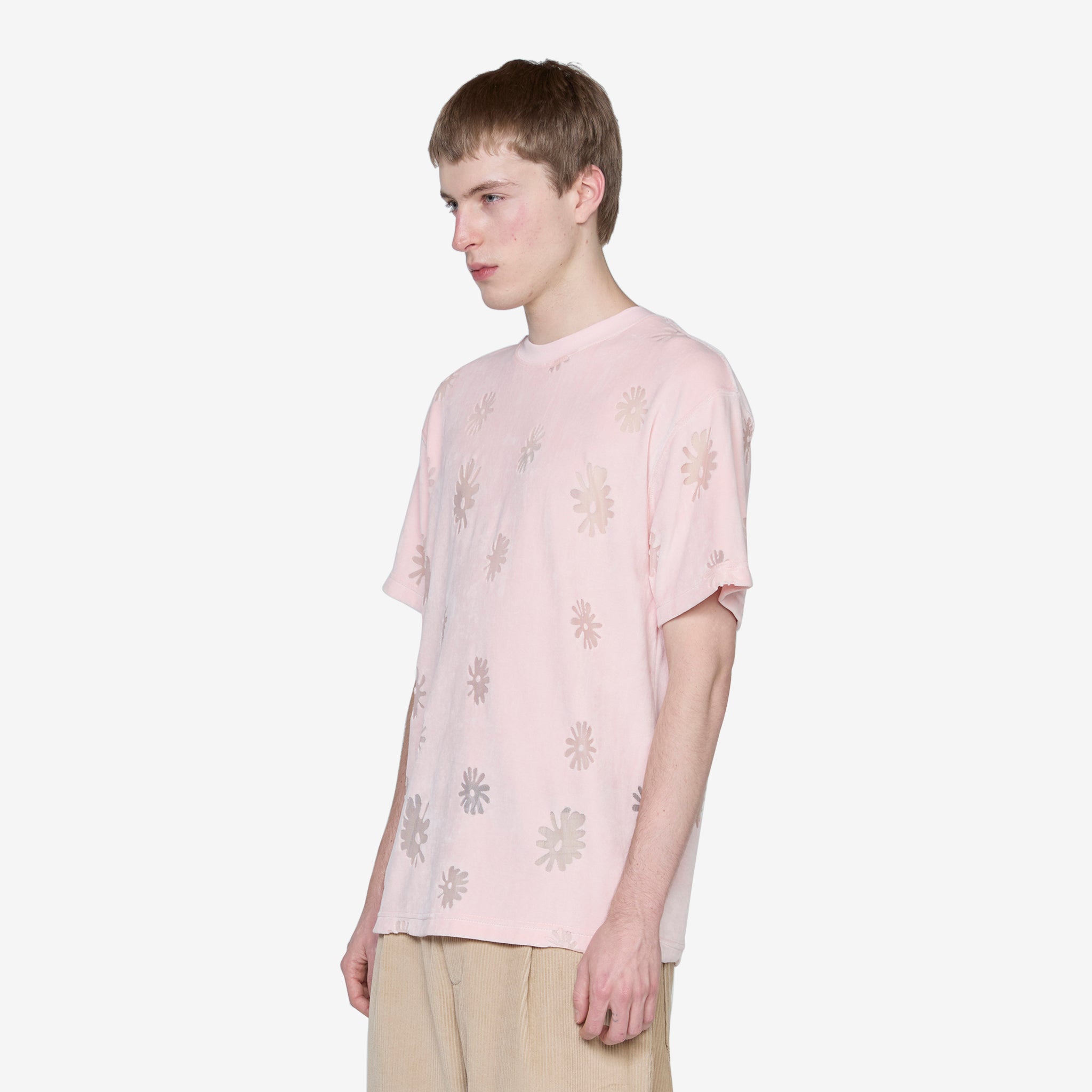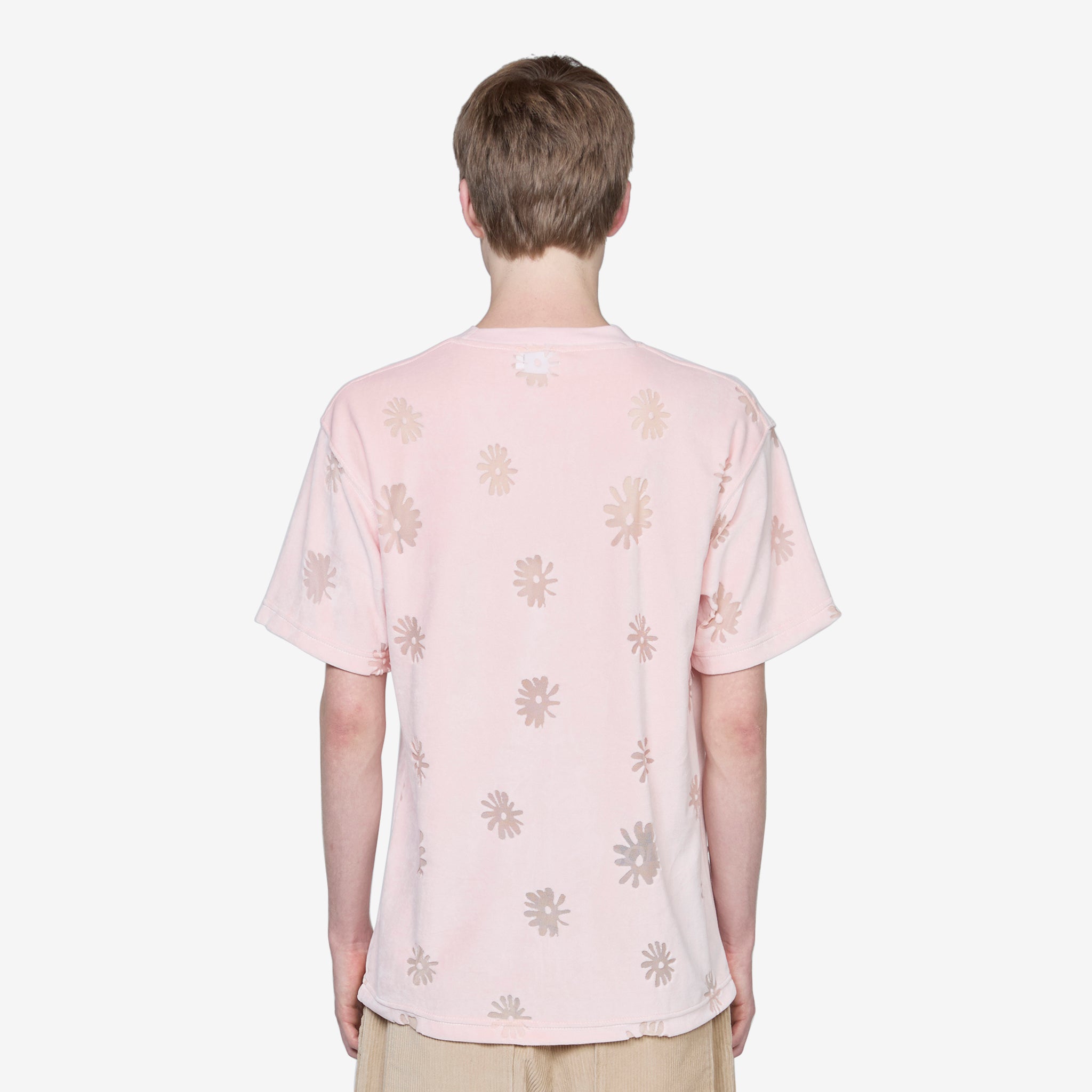 Men's Kai T-Shirt in Pink Multi from Soulland. Regular fit short sleeve t-shirt with a ribbed crew neckline. Crafted from Portuguese velvet fabric enhanced with a floral burnout pattern and twin needle stitching at the armhole, neck, bottom and sleeve hems. Finished with a branded embroidered patch on the sleeve.