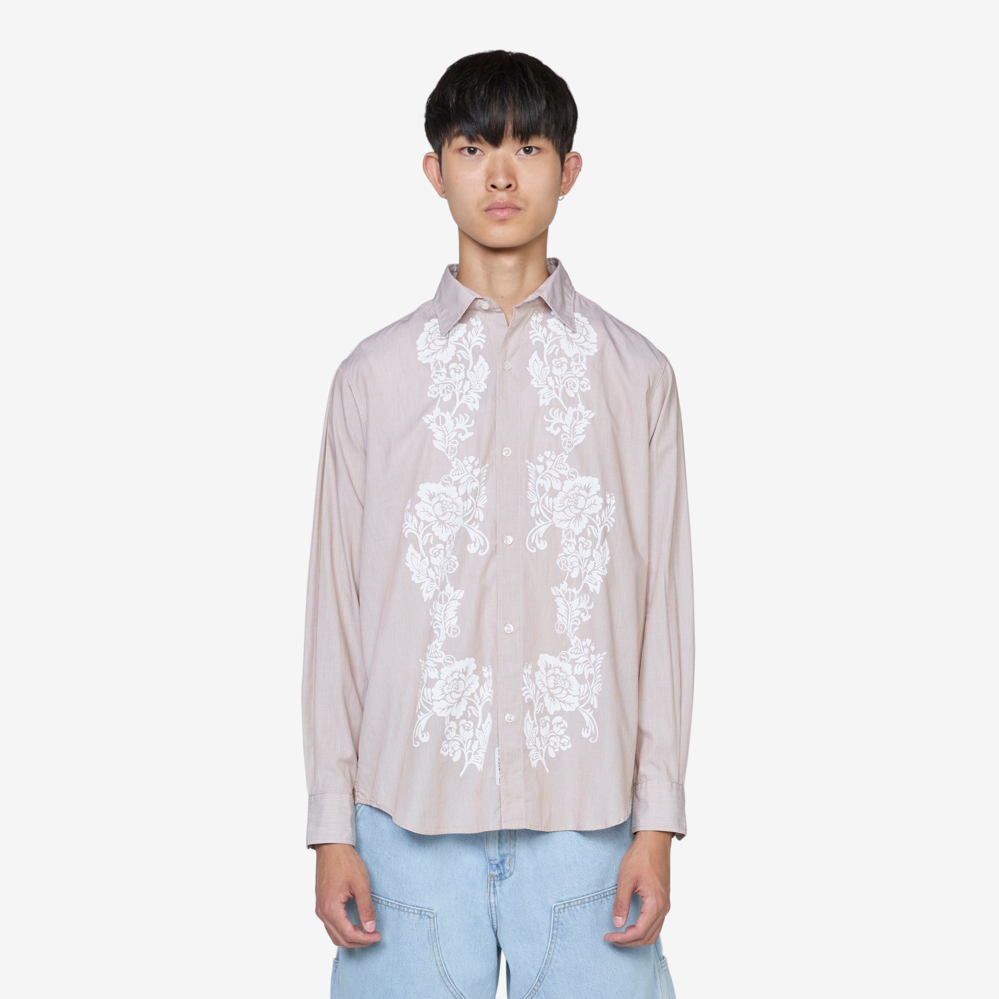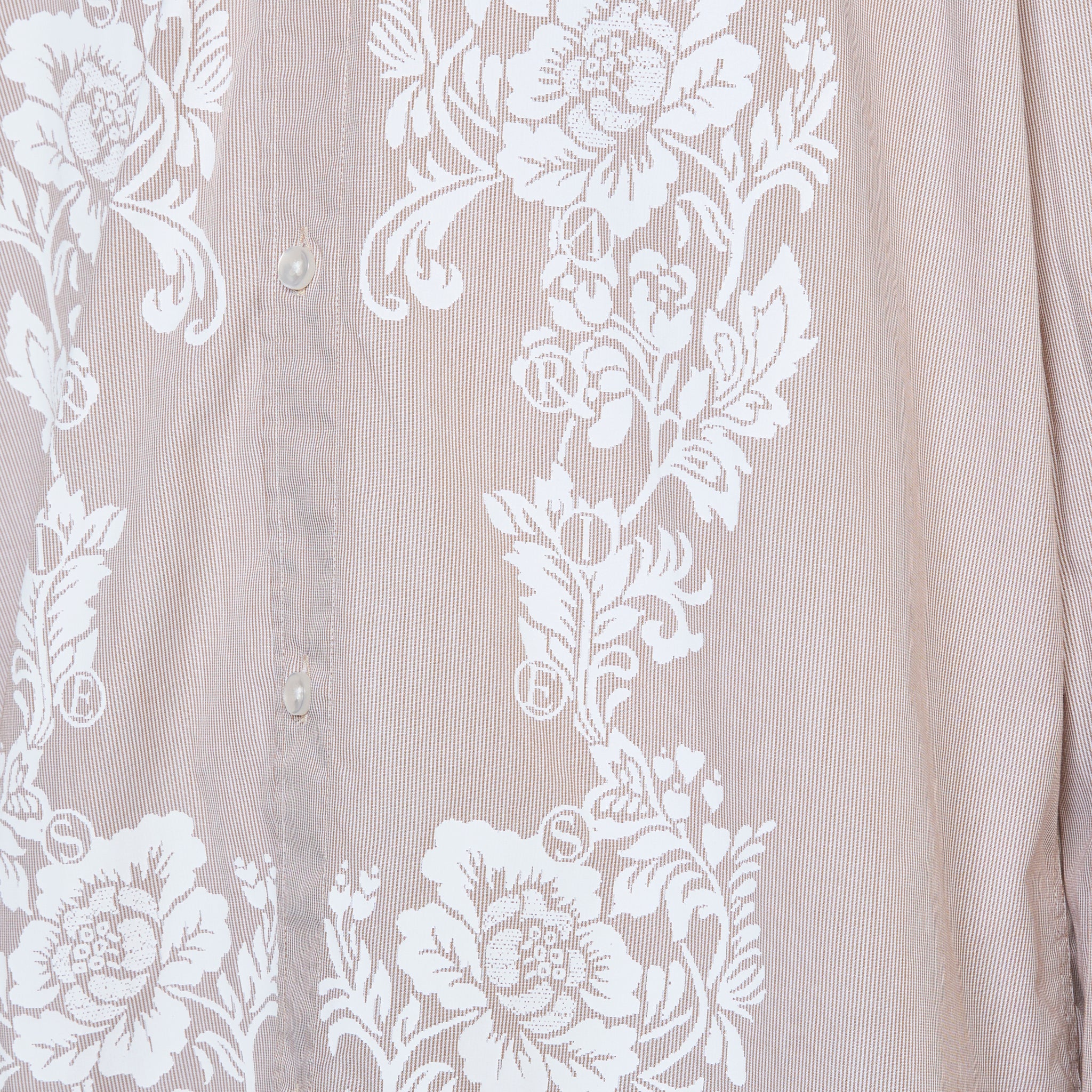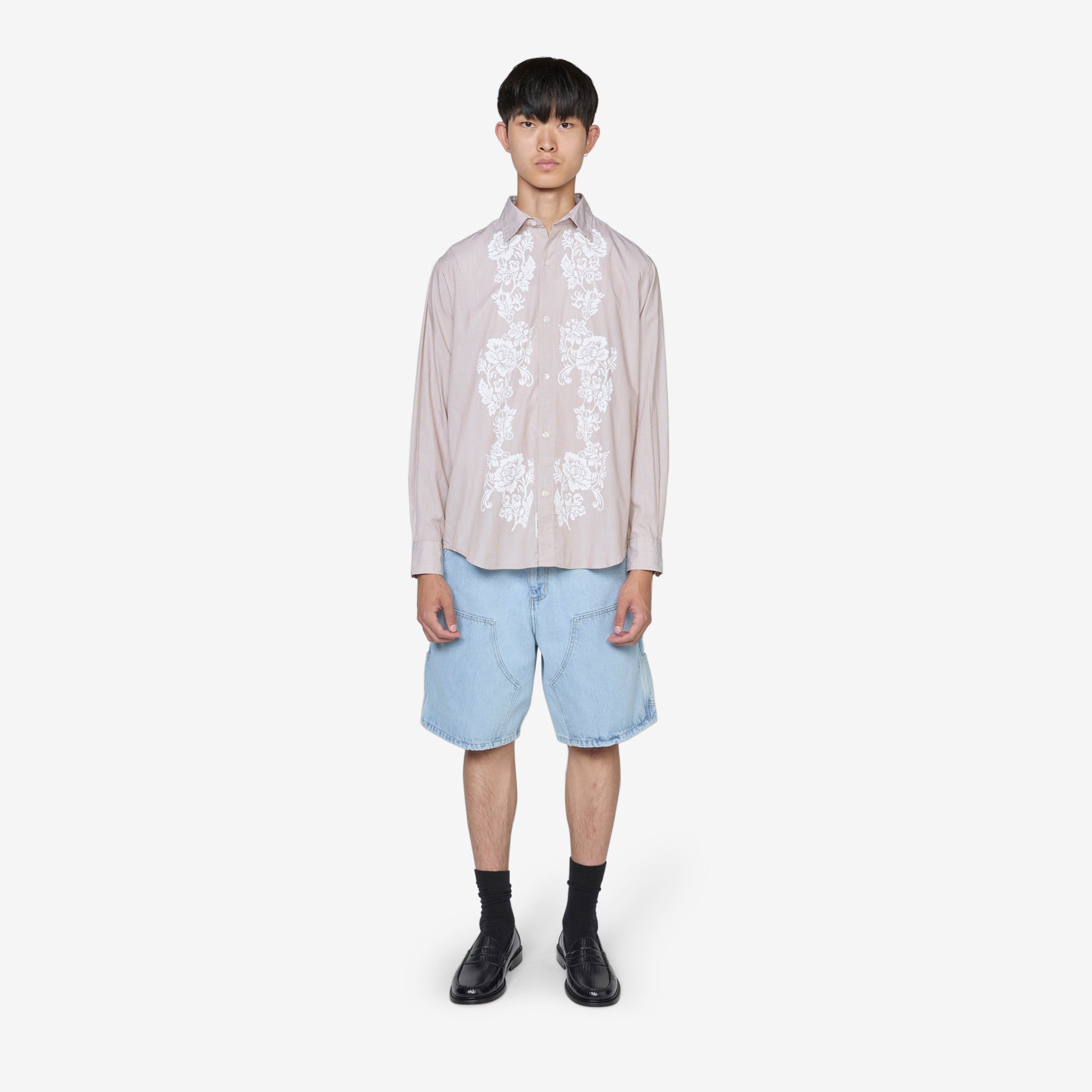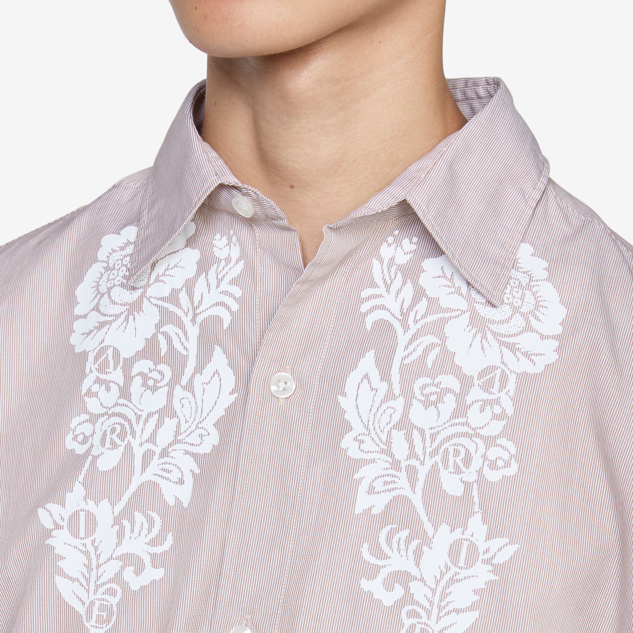 Lace Overprinted Poplin Shirt in Brown from Aries. Regular fit shirt with a classic collar, buttoned cuffs and curved hem. Crafted from a striped cotton poplin and finished with printed lace graphics down the front.