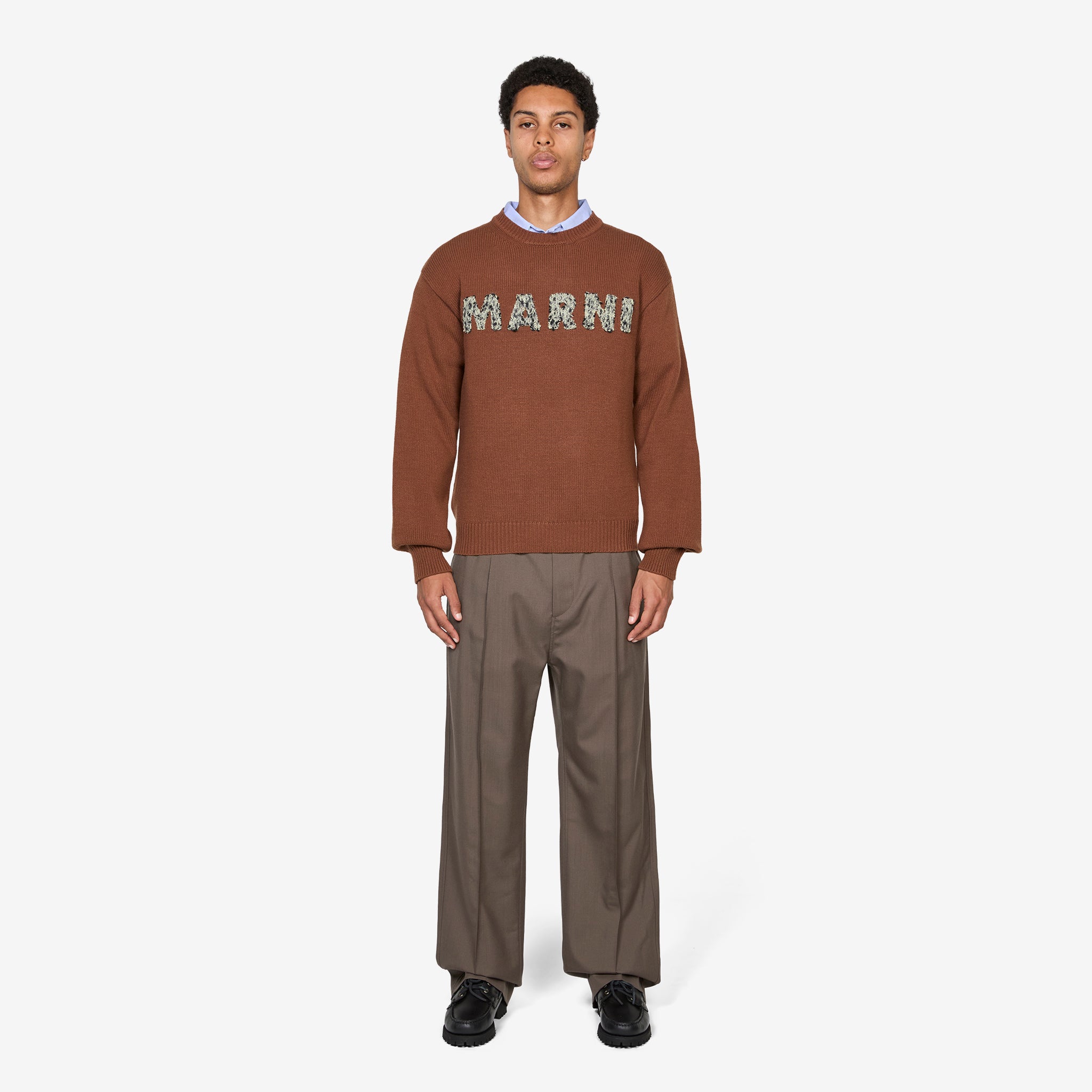 Laser-Cut Logo Wool Sweater in Maroon from Marni. Regular fit sweater with slightly dropped shoulders, a crew neckline and ribbed trims. Crafted from premium virgin wool. Finished with laser-cut, textured applique branding across the chest.