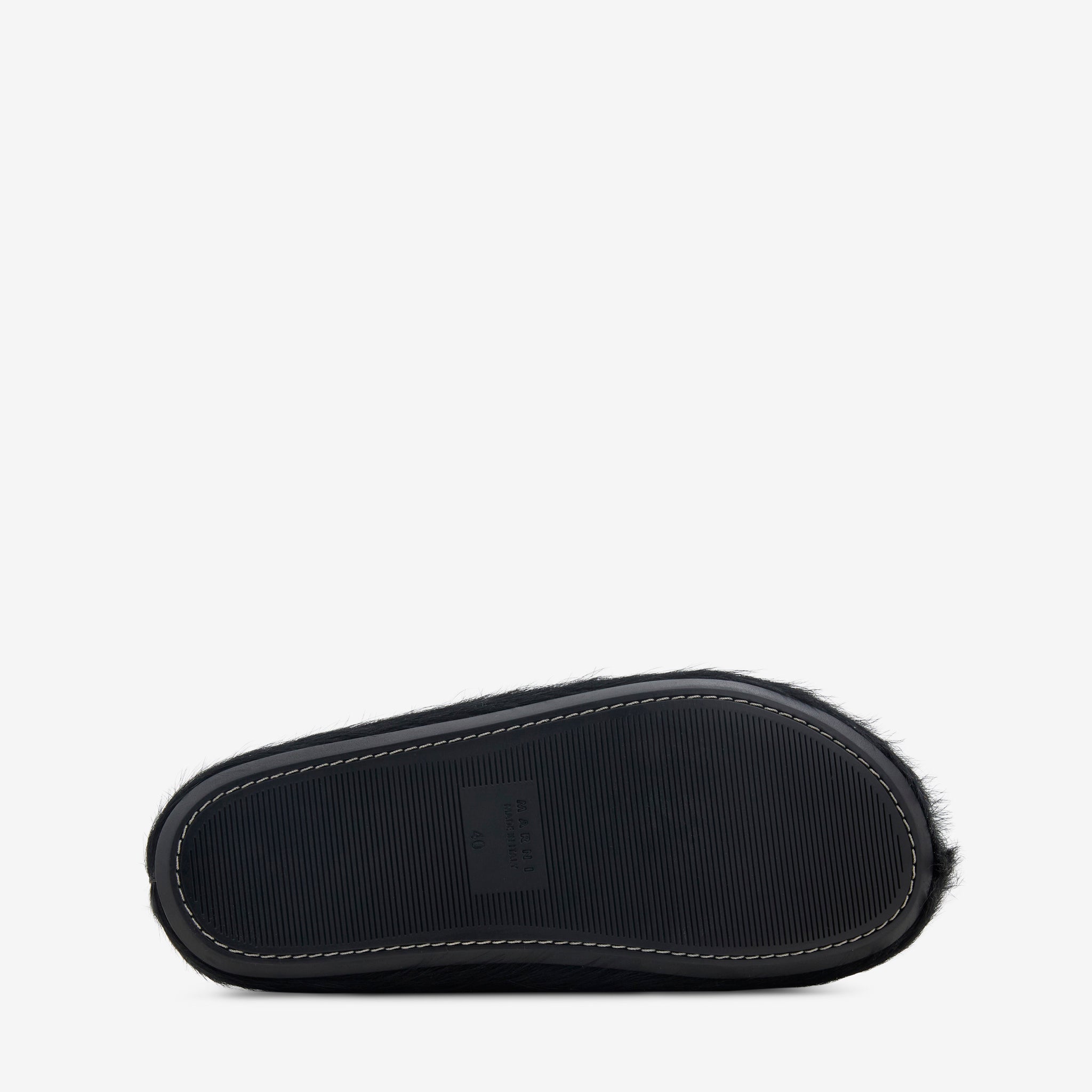Long Hair Calfskin Fussbett Sabot in Sabot Black from Marni. Slip on mule with a long-haired upper, anatomic leather insole and ribbed rubber outsole. Crafted from premium calfskin and finished with a logo-embossed footbed.
