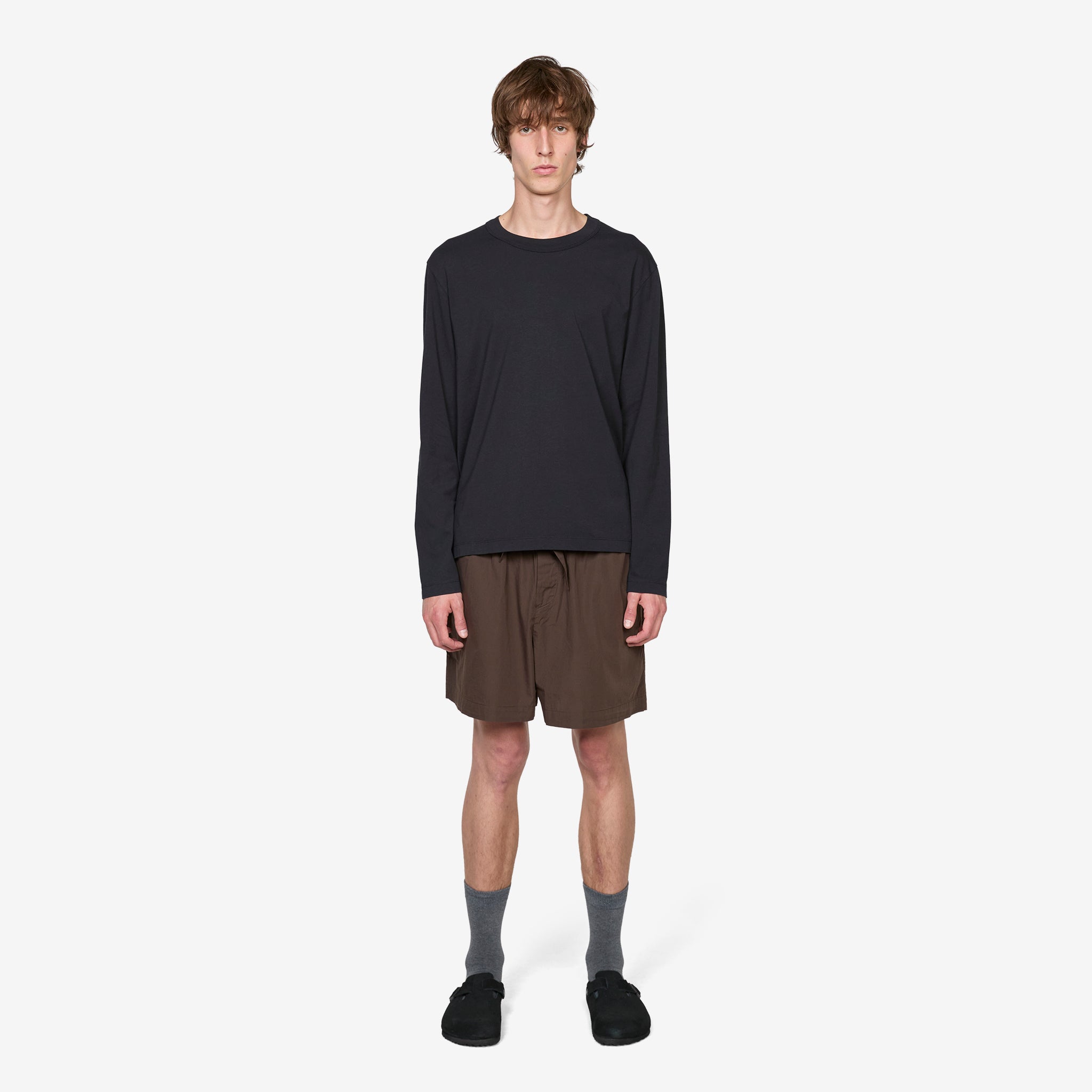 Longsleeve Sleeping T-Shirt in Black from Tekla. Designed for moments of comfort throughout the day or night. Relaxed, unisex fit t-shirt with a longline silhouette, extra long sleeves and ribbed crew neckline. Crafted from mid-heavyweight organic cotton jersey and finished with a woven brand tab at the side.